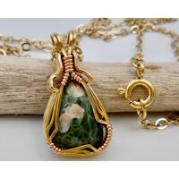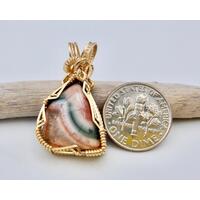 Luscious pink Thomsonite with white and salmon is beautifully wire wrapped in both pink and yellow gold fill wires. The effect is a vibrant setting for this treasured stone from North Shore Lake Superior, along the Minnesota coast area. Matching stud earrings are included in your purchase, making a delightful gift set.