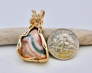 Our wire wrap pendants start with choosing high quality stones. This stone was hand selected out of a great many as a choice stone for you. Don has an assortment of saws, grinders, and polishing machines for the lapidary work in his shop. When the stone is cut and worked up to show off the best qualities, it is time for wire-wrapping.