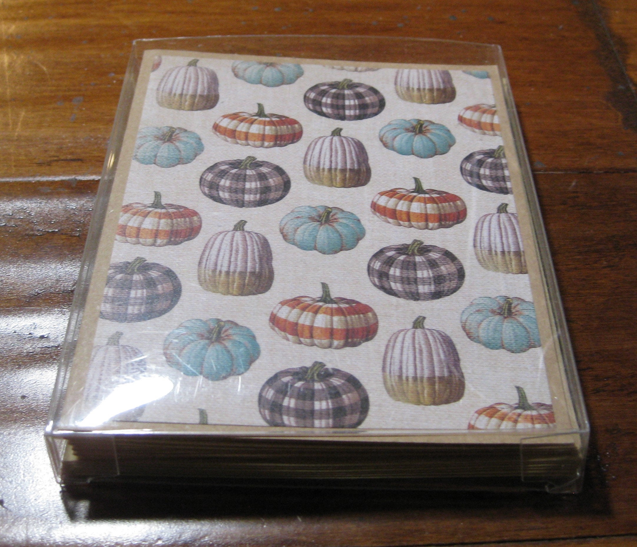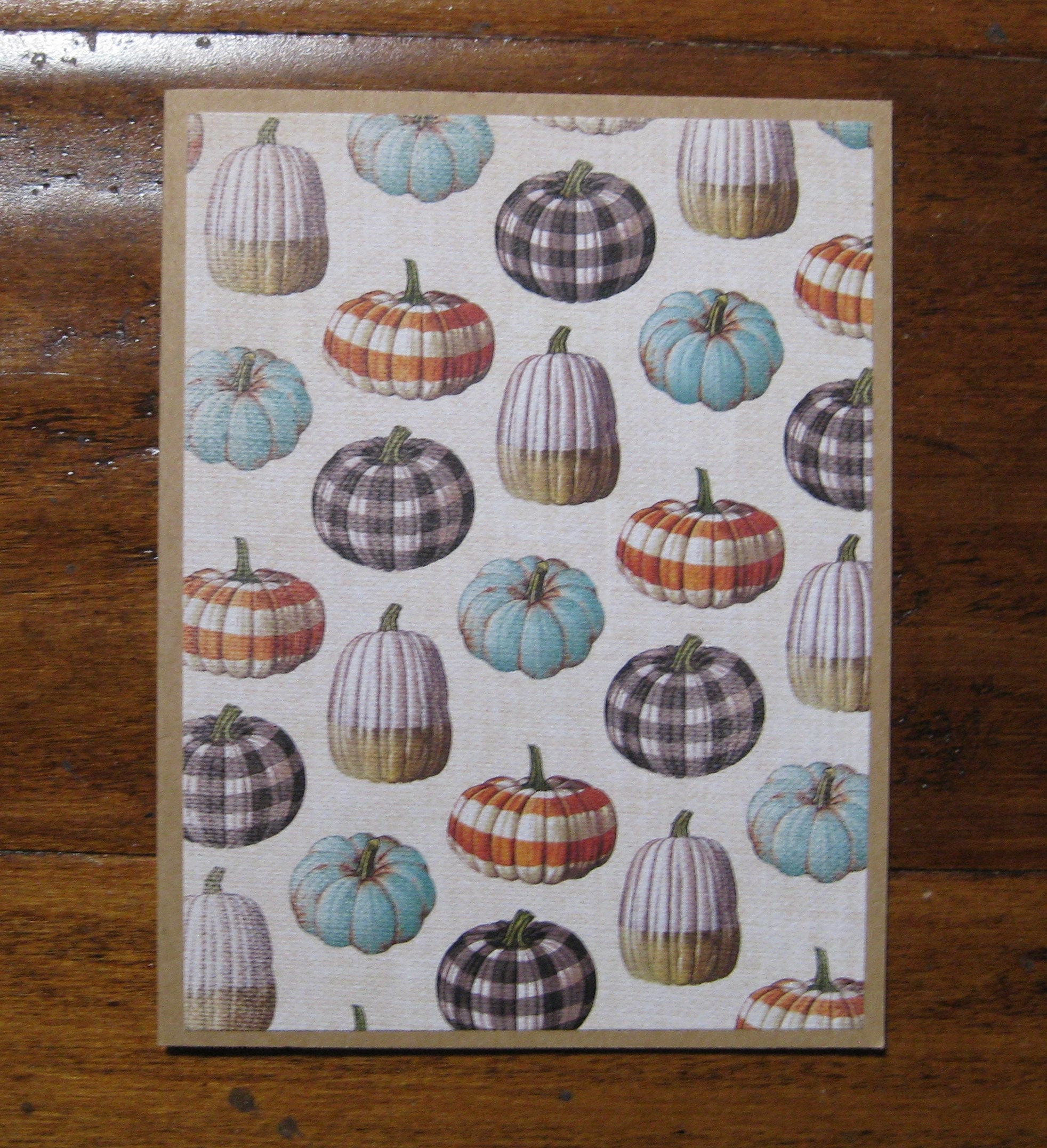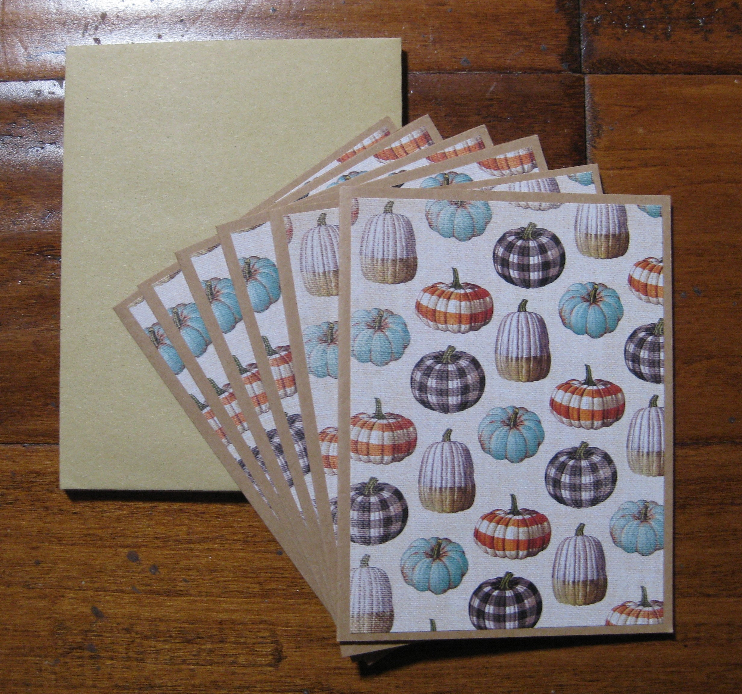 6 Plaid Pumpkin cards and 6 kraft brown envelopes, Ivory burlap background filled plaid pumpkins. Cardstock is kraft brown. Details: Cards measure 4.24" x 5.5" and the envelope is size A2. All cards are handmade using quality materials. #80 cardstock and scrapbooking paper by American Crafts