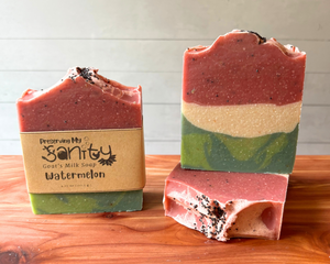 Each bar of my soap contains approximately 1 ounce of locally sourced Minnesota goat milk. Most of my soaps also contain pure olive oil, unrefined organic coconut oil, RSPO certified sustainable palm oil, sodium hydroxide, and castor oil. Some batches contain grass-fed non-GMO beef tallow instead of palm oil.