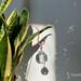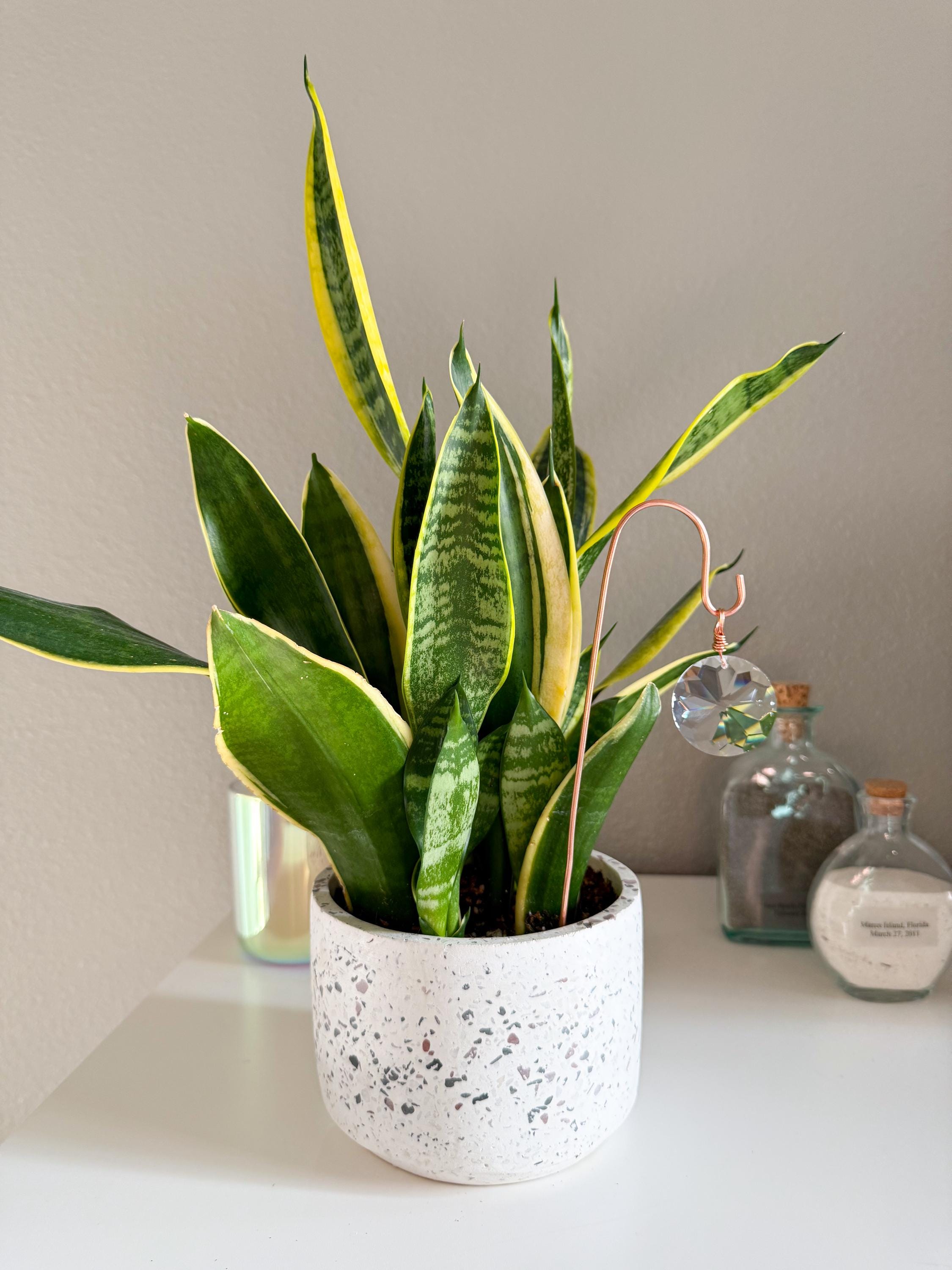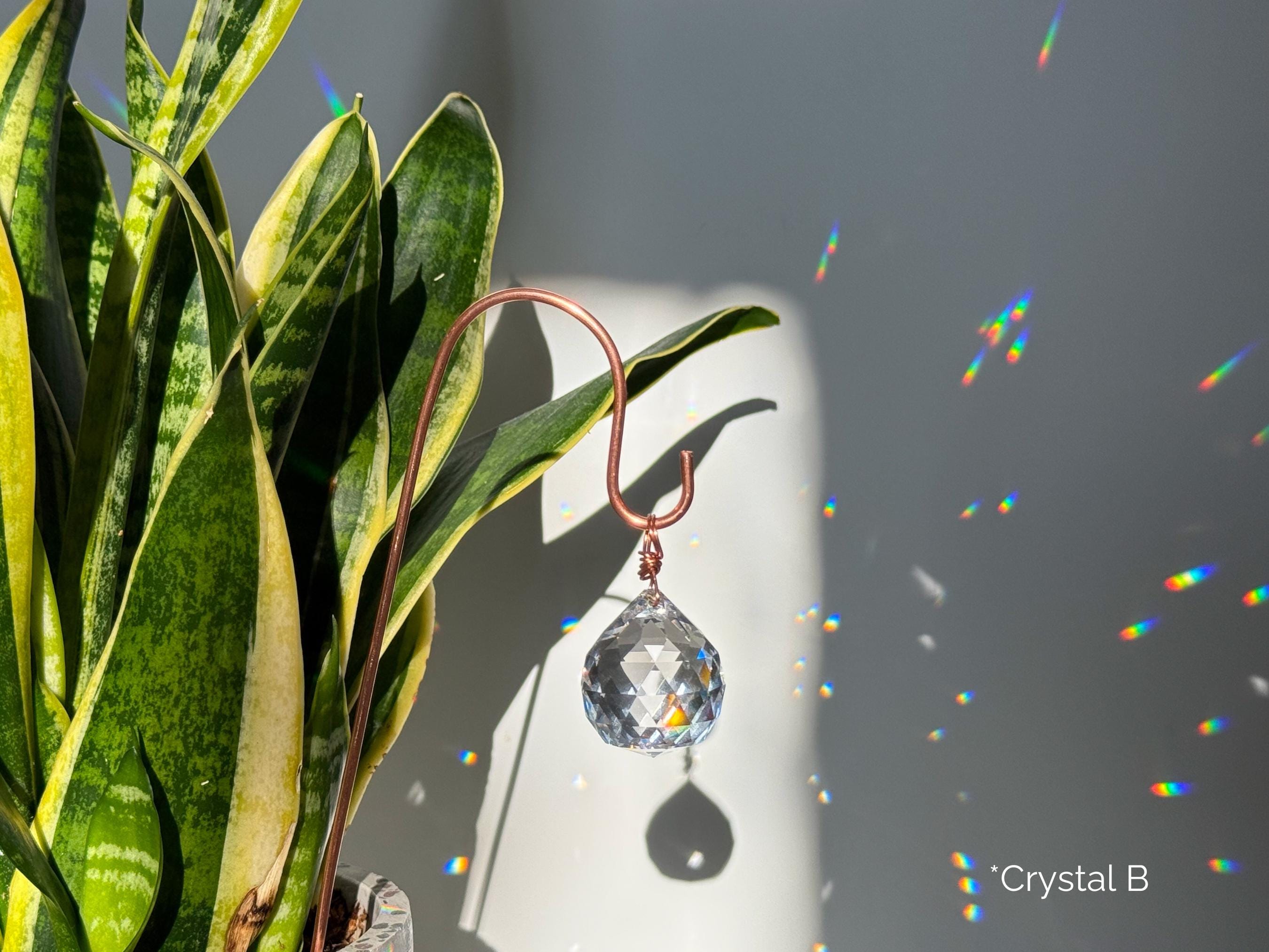 Each piece begins as raw copper, shaped by hand into its final form with care and intention. The copper’s warm glow pairs beautifully with real crystals—each one like a piece of jewelry for your plants, catching sunlight and scattering little rainbows across your space. And the best part? This style features an open hook so you can switch up your vibe whenever you want. Choose 1, 2, or all 3 crystals, and swap them out as often as the mood strikes.