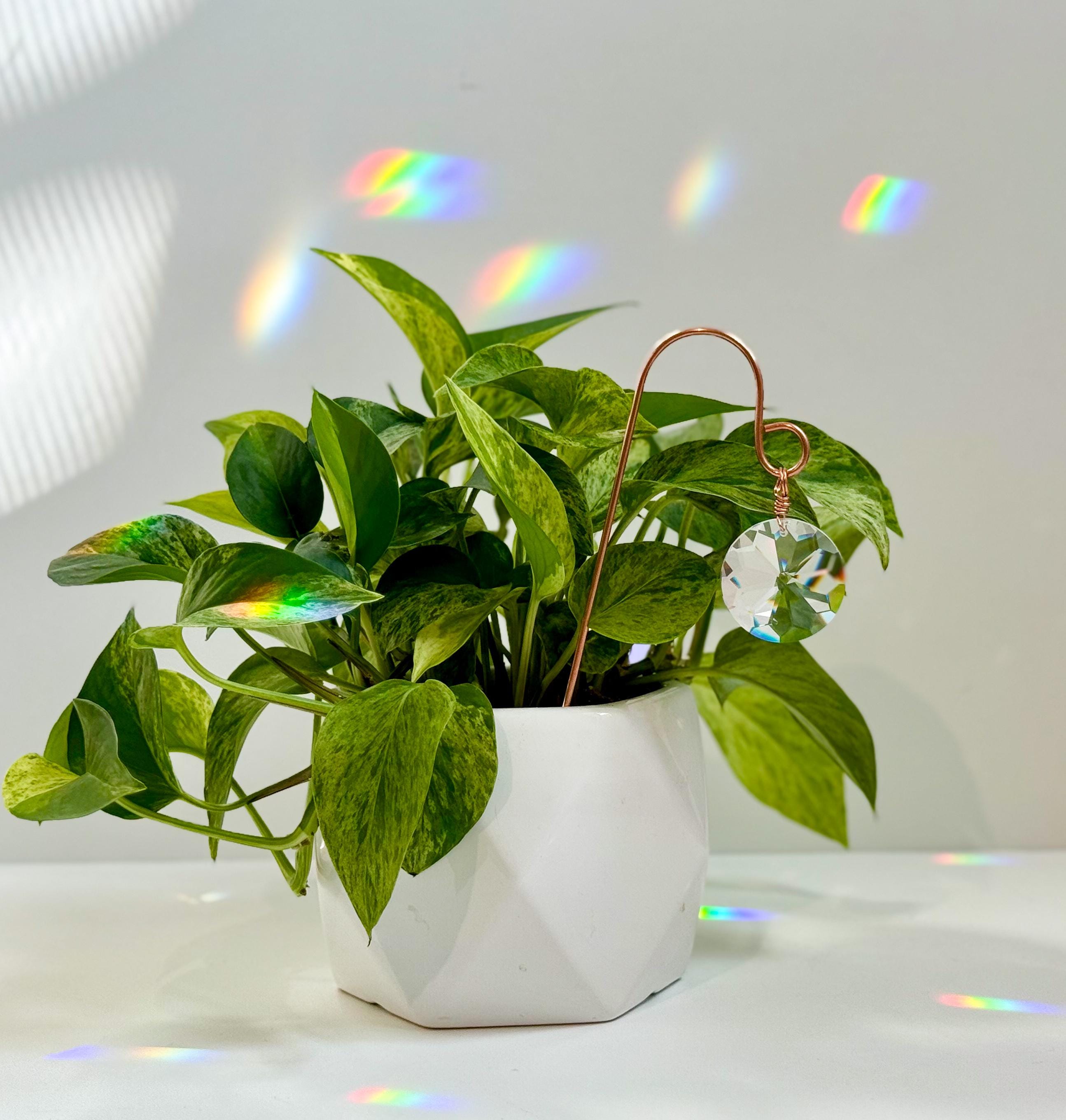 Each piece begins as raw copper, shaped by hand into its final form with care and intention. The copper’s warm glow pairs beautifully with real crystals—each one like a piece of jewelry for your plants, catching sunlight and scattering little rainbows across your space.
