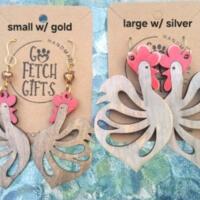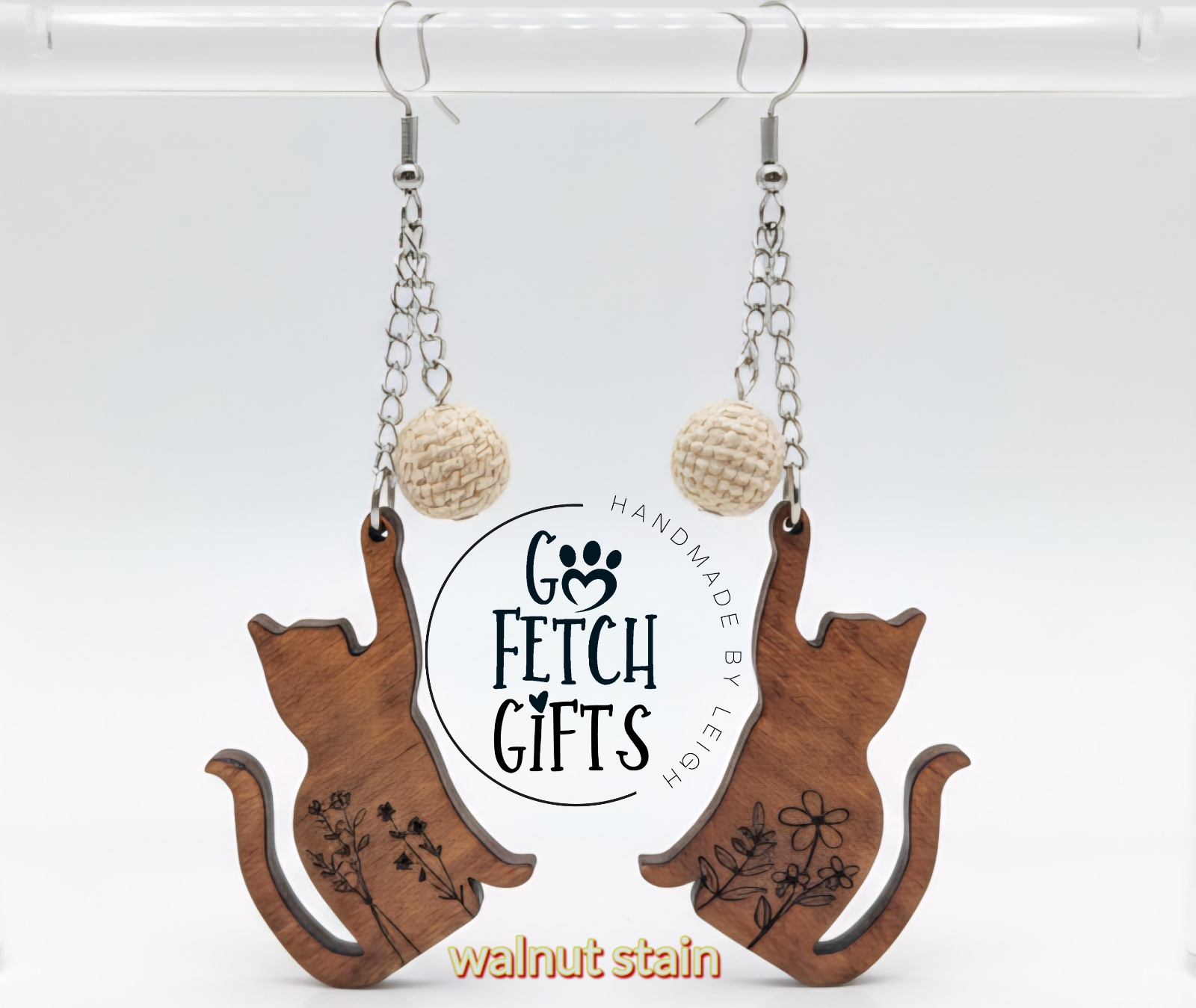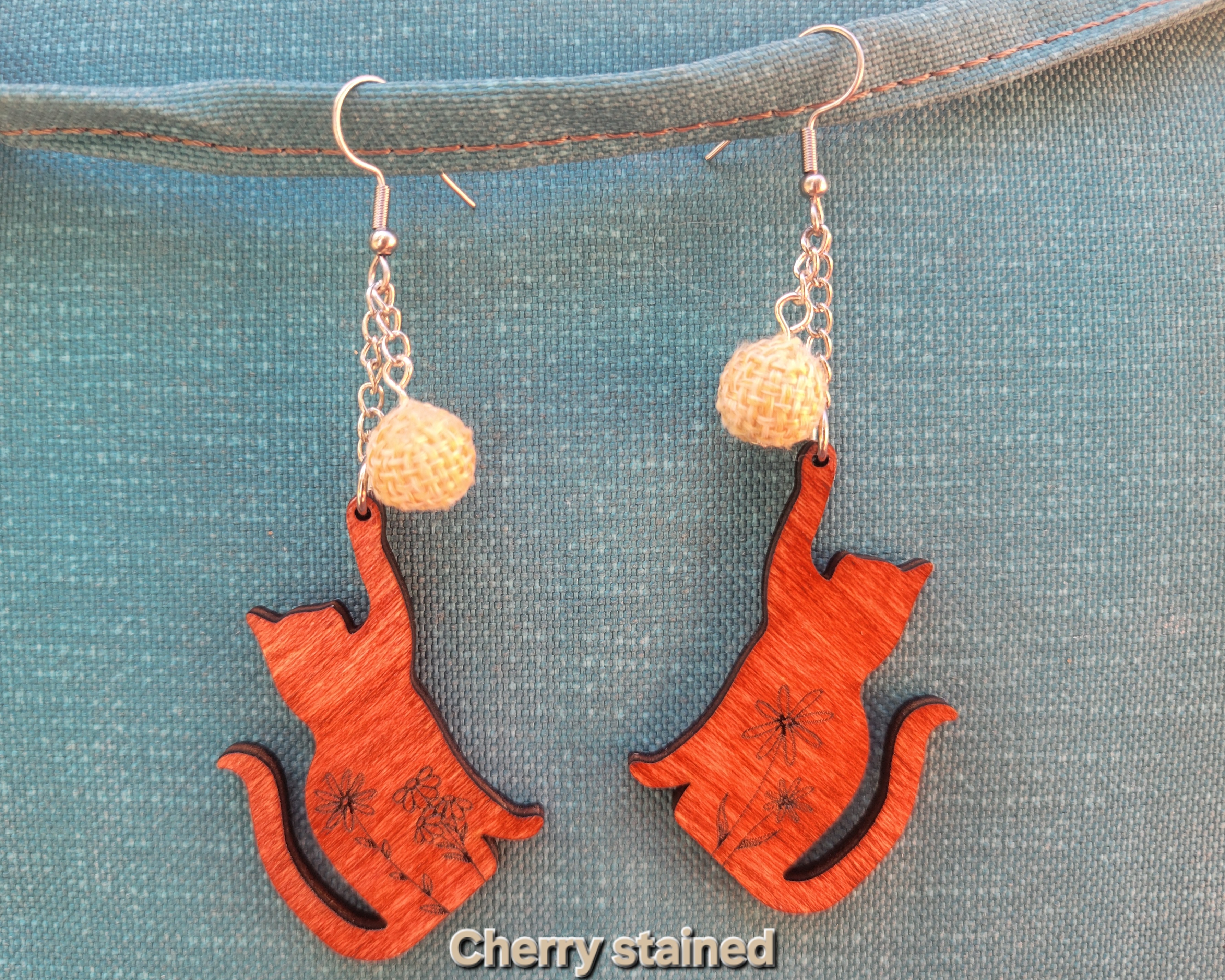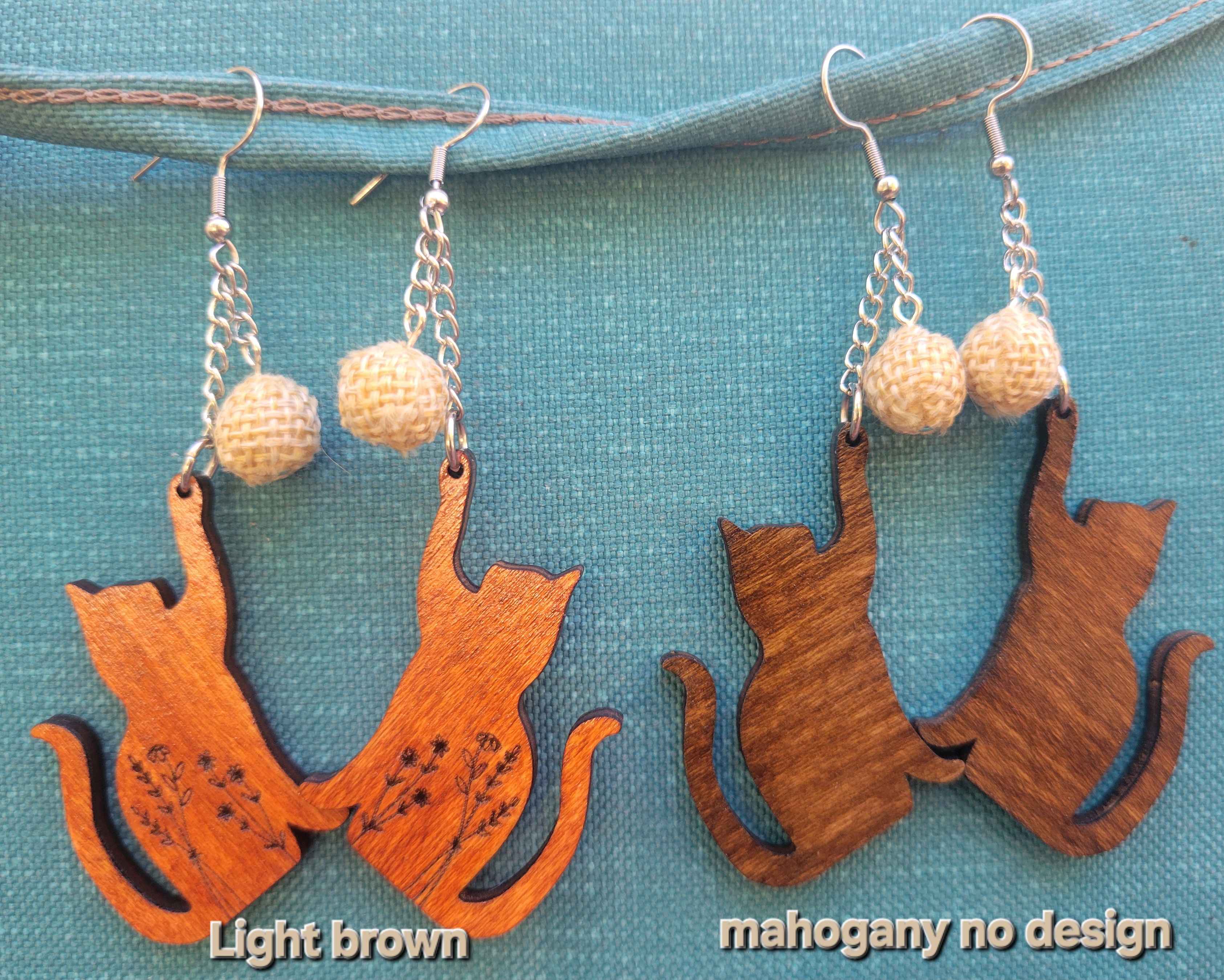 I drew these cats with my laser software then laser cut 1/8" maple wood, my favorite wood for earrings. I stained each pair a different tone and sealed each one. Then I custom cut stainless steel chain and assembled each piece using stainless steel headpins, jump rings and earring hooks.