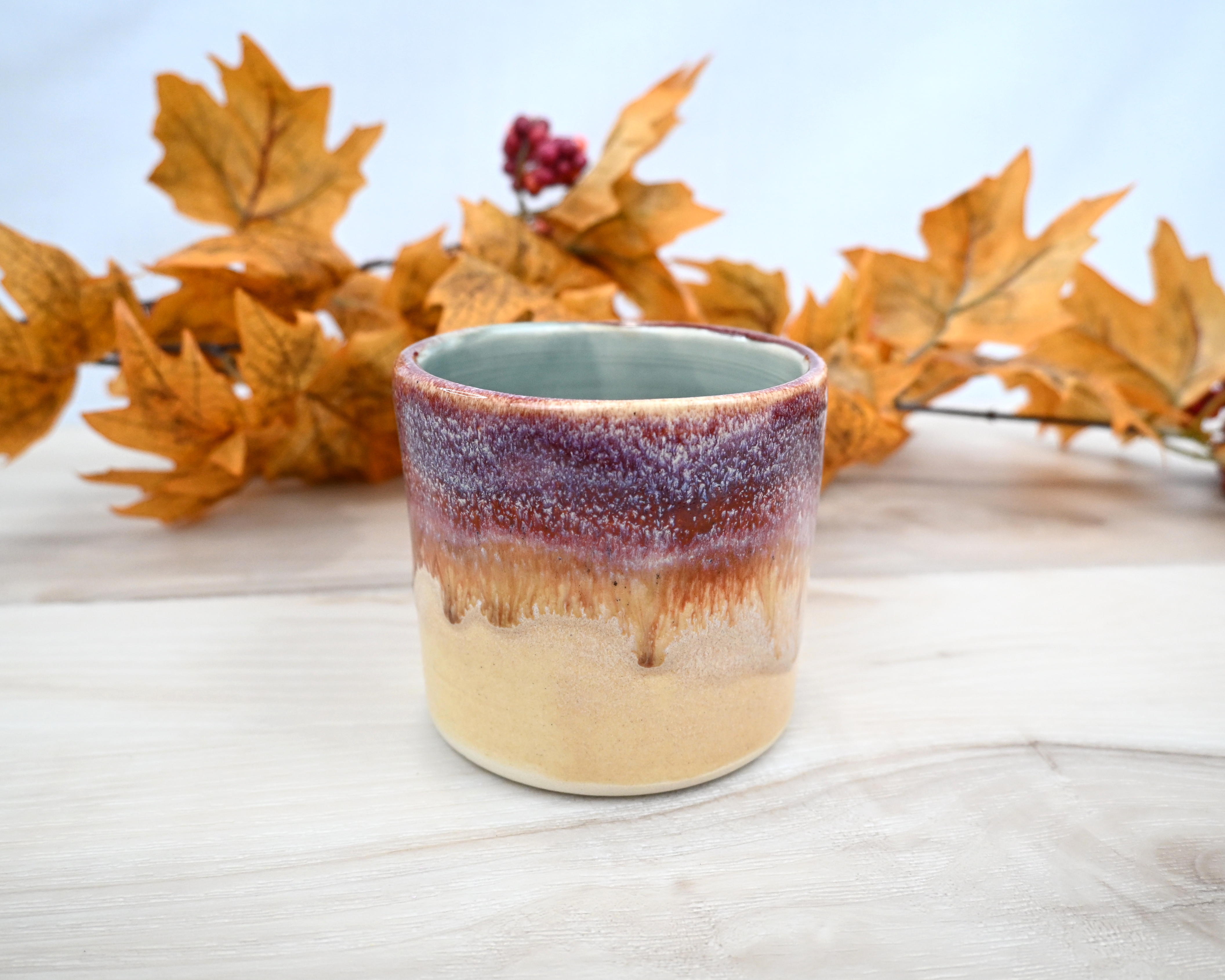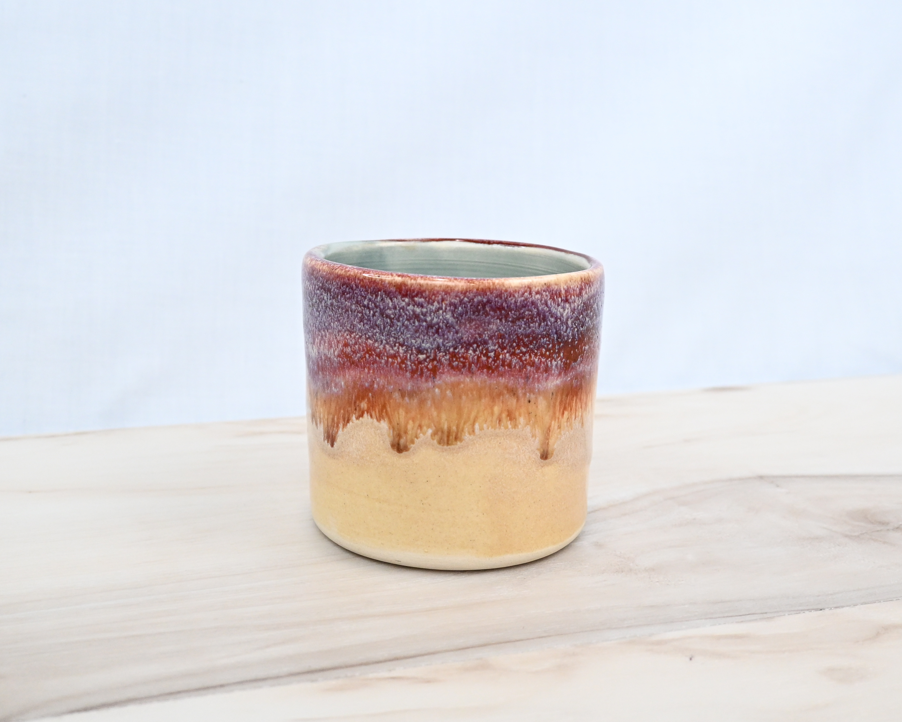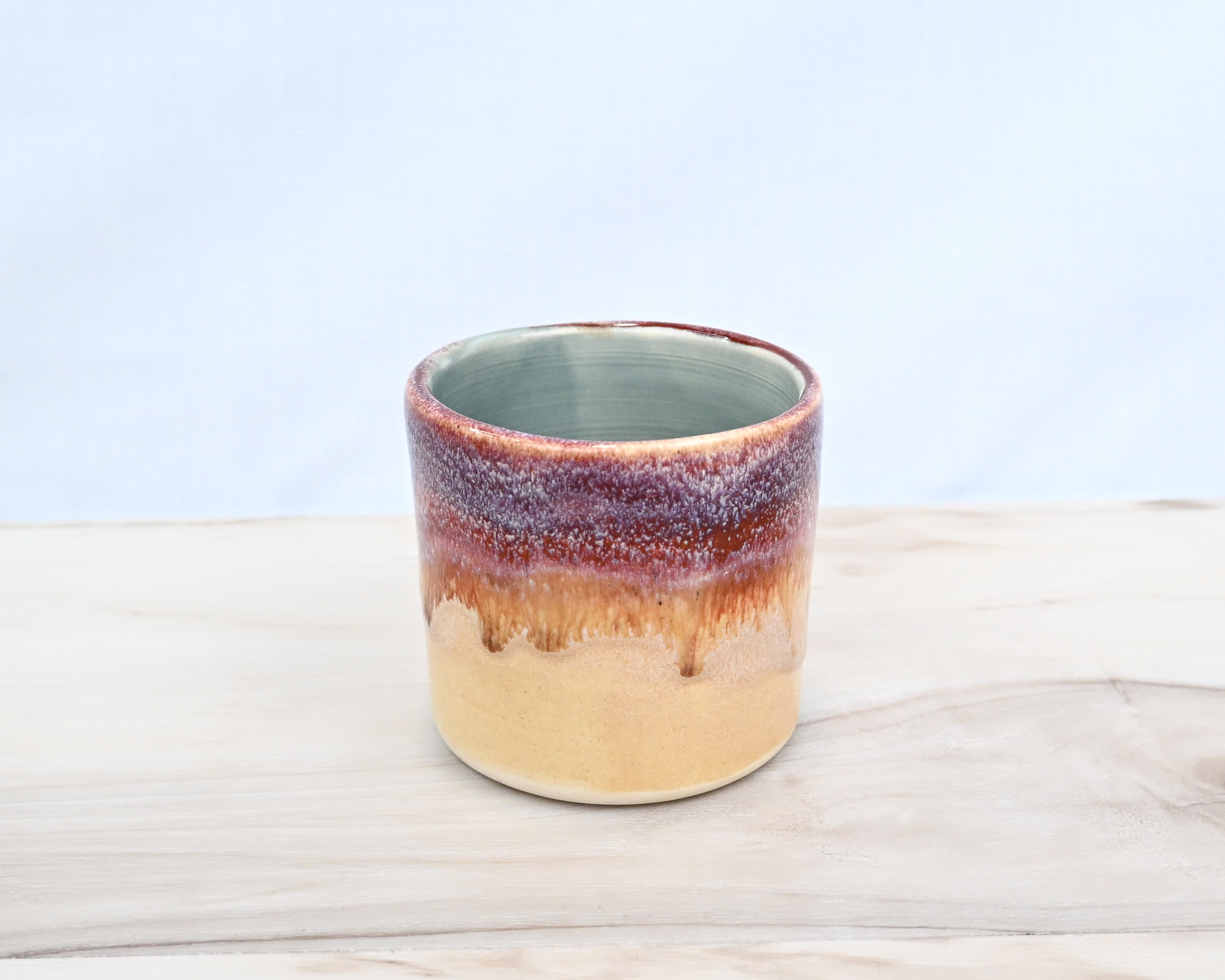 A versatile handmade cup/trinket dish glazed in warm beige with a flowing band of plum-purple. Perfect for sipping, storing, or catching small treasures. Not recommended for hot beverages.