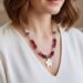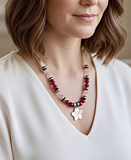 The necklace is strung with a harmonious blend of smooth, polished beads. Rich, red rose (deep magenta) tiger’s eye gemstones and soft, delicate rose pink cat’s eye beads are interspersed with subtle rose gold-tone accents and black heishi beads, creating a captivating color palette that evokes a vibrant sunset. The main strand of the necklace is composed of pristine white beads, providing a beautiful contrast and highlighting the colorful centerpiece.