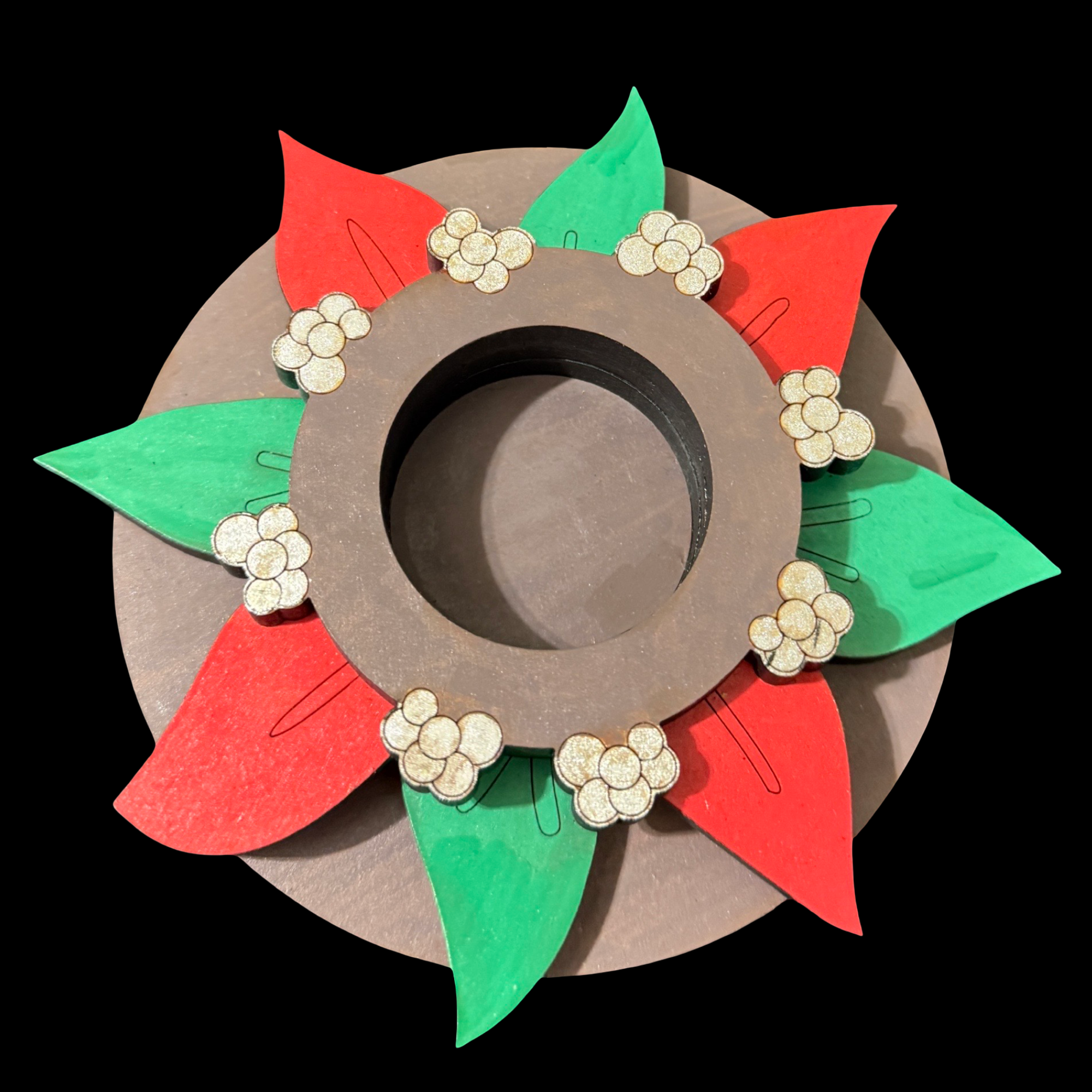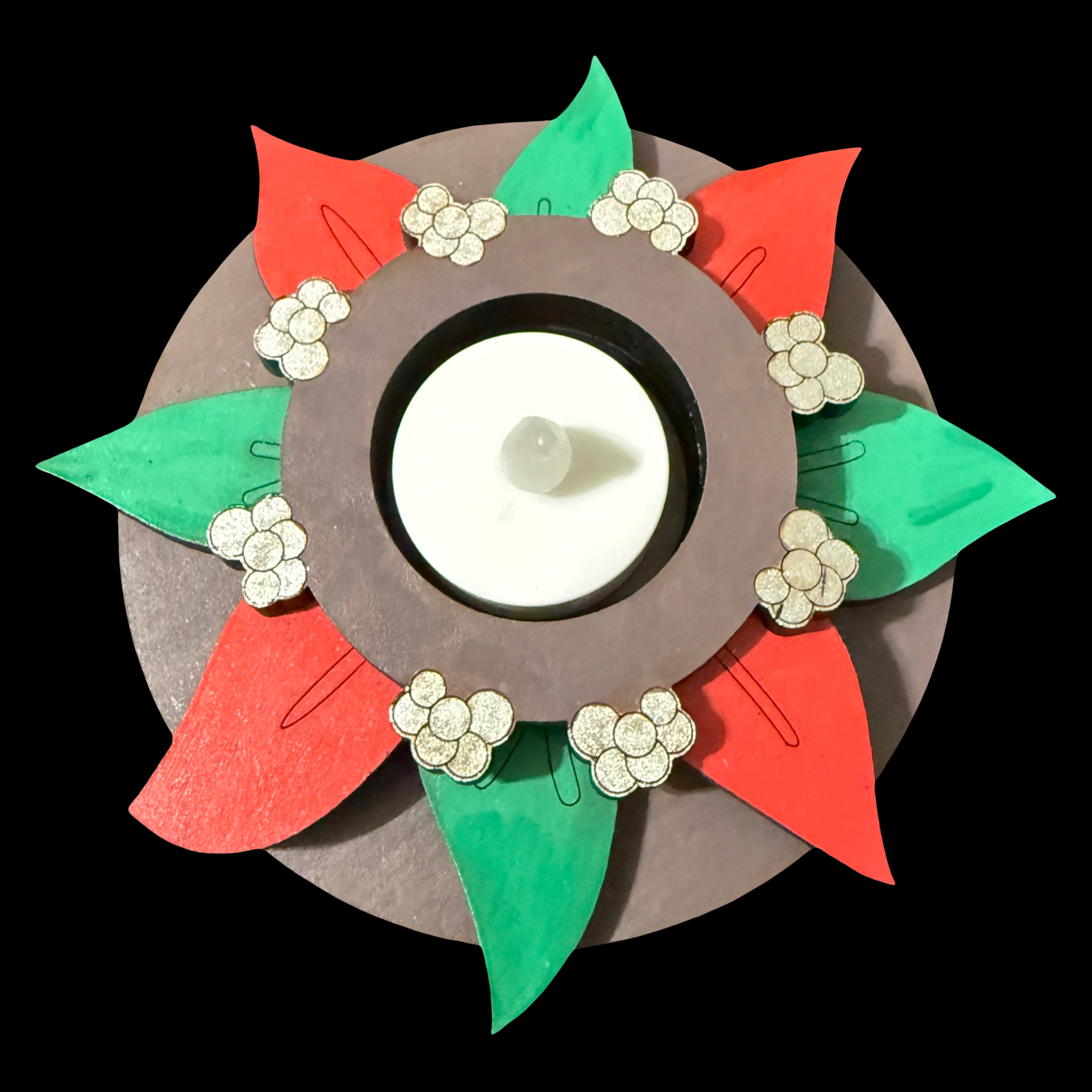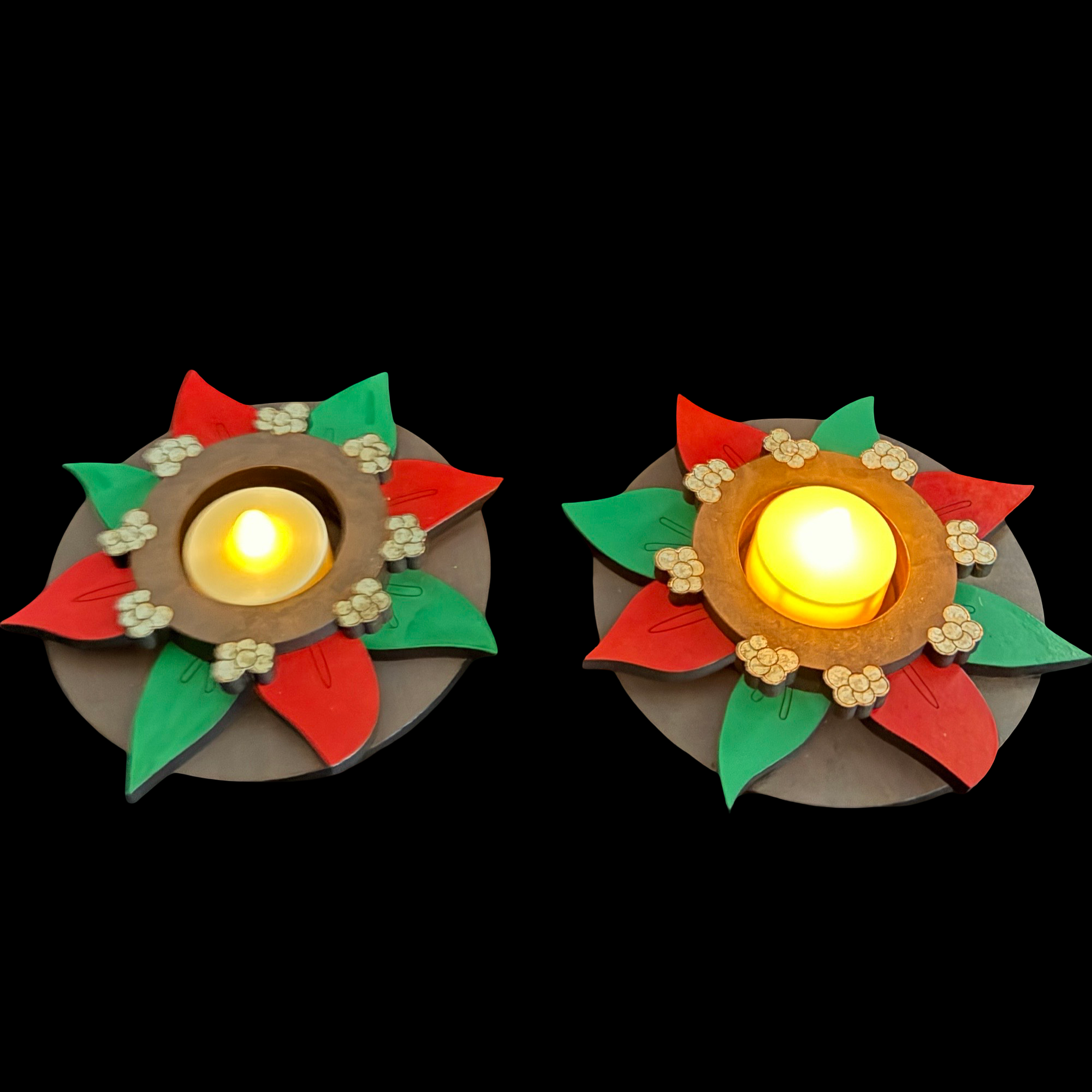 This is a set of two painted poinsettia wood tea light candle holders. They are laser cut and engraved from 1/8 in thick draftboard. They are hand painted and sealed with clear coat. The bottom is not painted. They hold a battery operated tea light candle (included). They each are approx. 5"x5" in size. These are NOT meant to hold a flame burning candle.