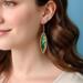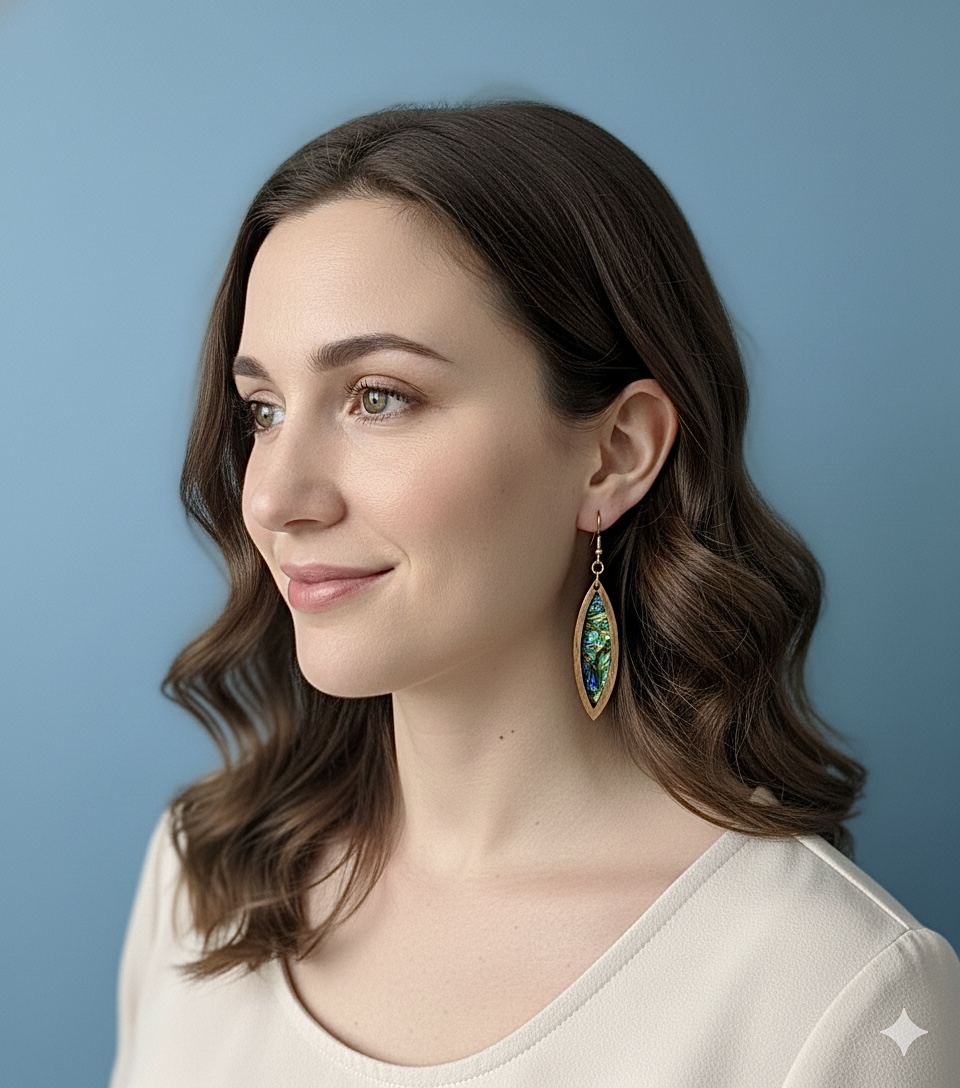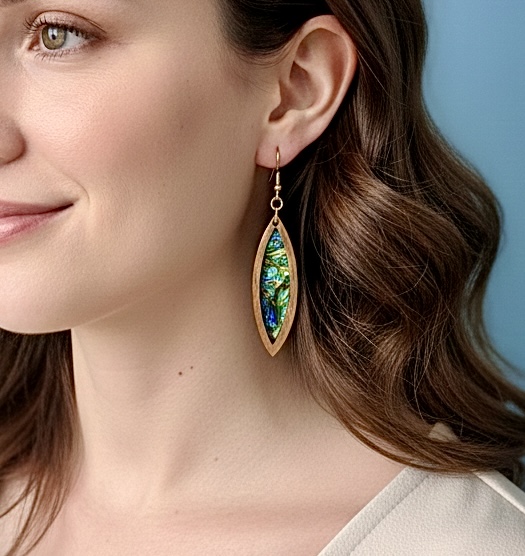 These captivating dangle earrings give off the natural warmth of the dichroic film nestled within the natural wood elliptical frame. The dichroic is vibrant and iridescent, shimmering with a mesmerizing array of blues, greens, and hints of purple. It catches the light, creating a dynamic, eye-catching effect. These lightweight earrings are perfect for adding a touch of natural beauty and unique style to any look, from casual to special occasions.