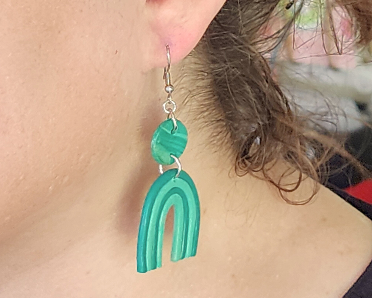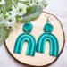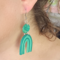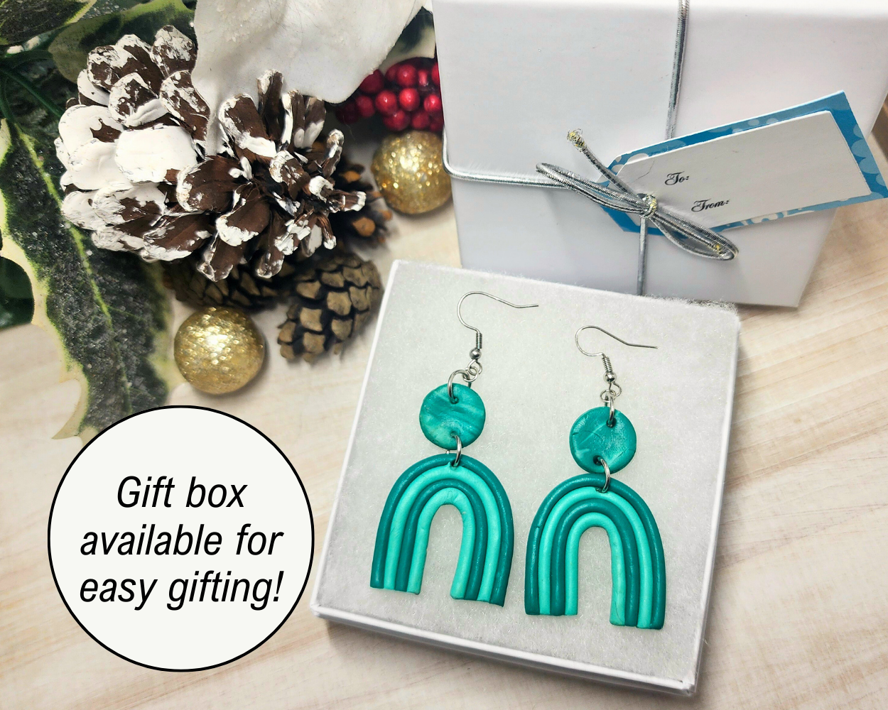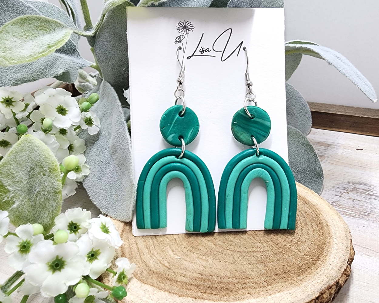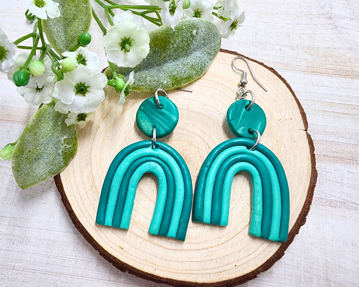 Add a modern boho touch to your outfit with these handmade rainbow polymer clay earrings. Each pair is individually crafted with care and attention to detail, featuring a stylish arch-shaped design in beautiful shades of green and mint.