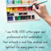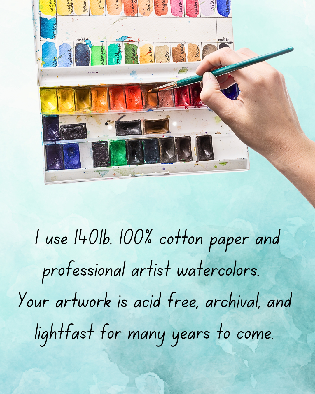 For my artwork, I use professional-grade materials like Daniel Smith and Holbein watercolor paints, along with 100% archival cotton papers. My cards are made from high-quality watercolor card stock.