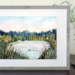 The painting measures 9" X 12" unframed and 12.75" X 16.75" framed and matted. The available frame is a weathered gray with unbreakable front that will compliment any decor.