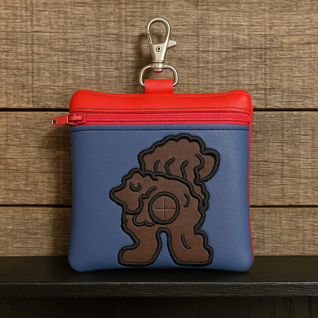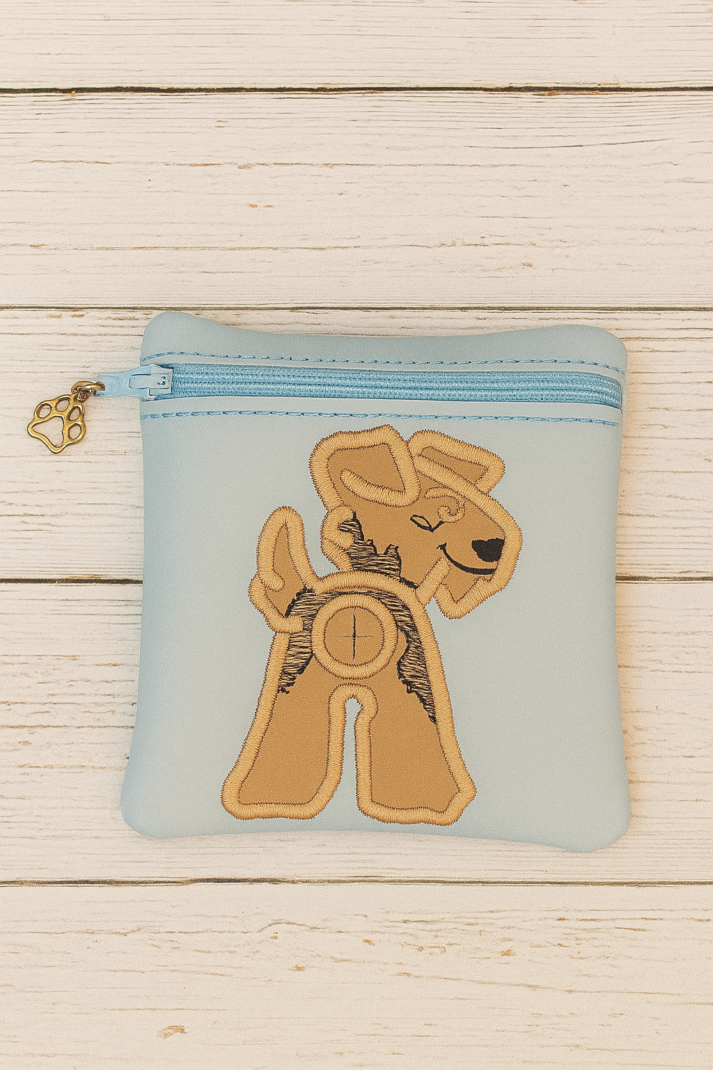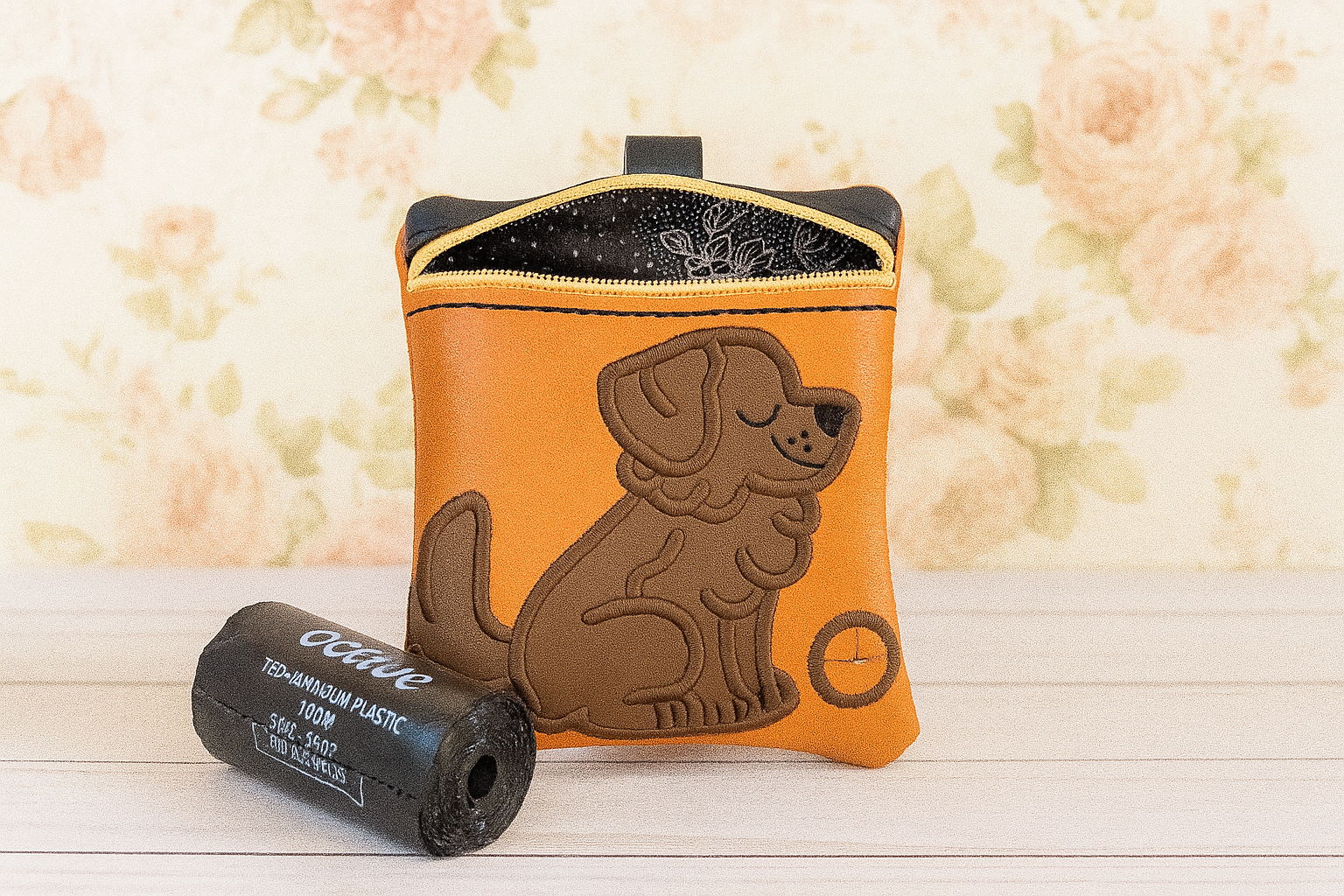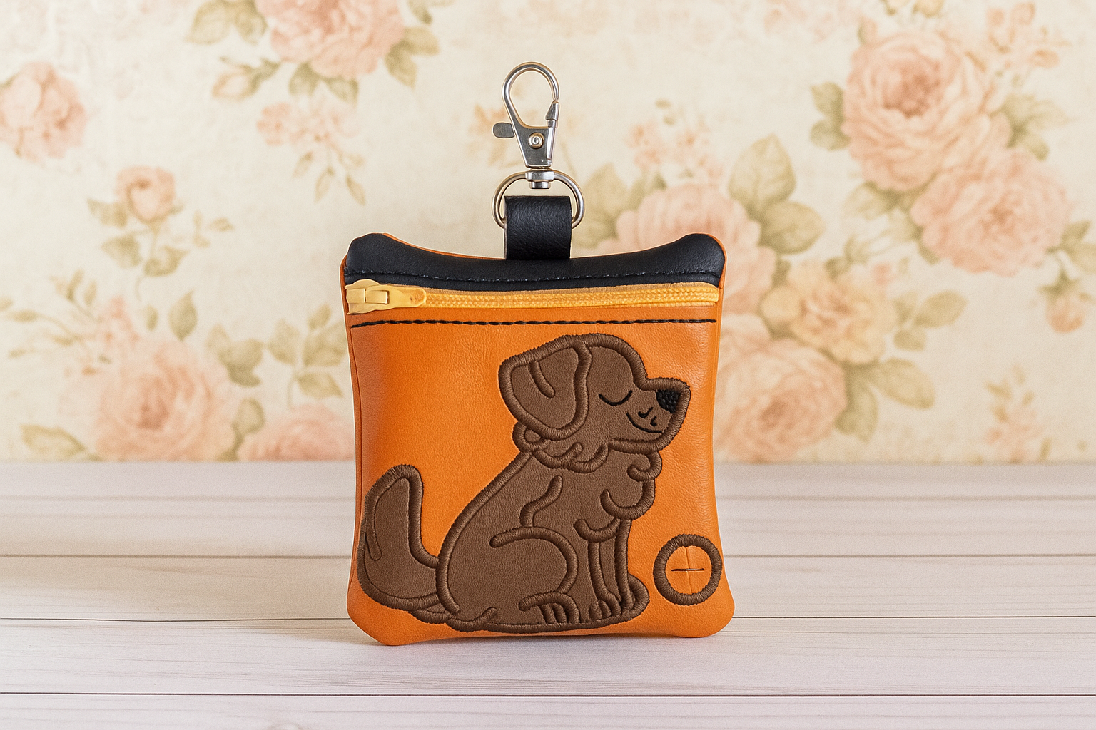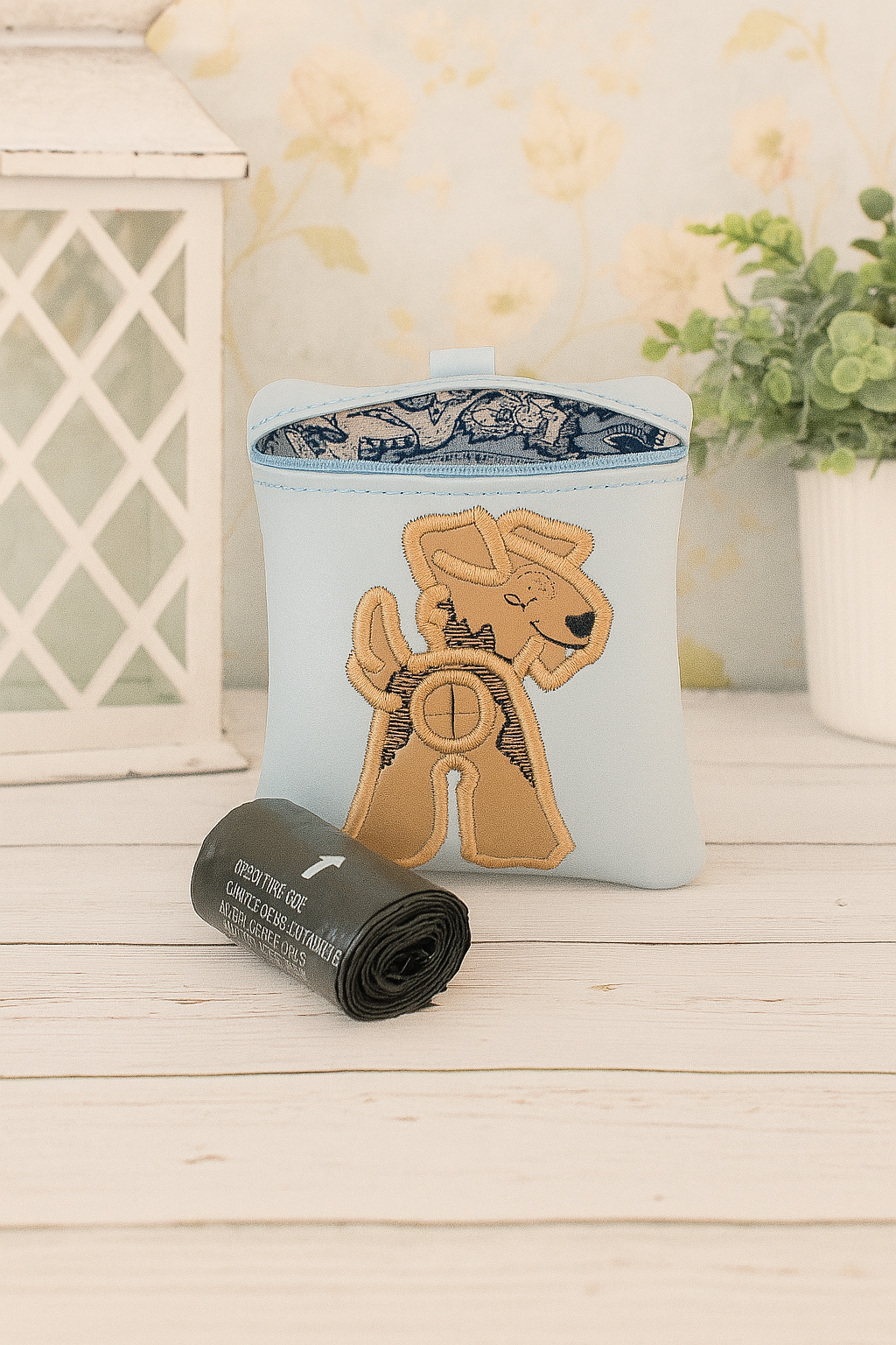 Why carry a roll of plastic bags in your hand when you can hide them inside this adorable zippered bag? Made with vinyl, cotton and an embroidered/appliqued design. Bag is 4"x4" and has attached clasp to hook it to your leash or backpack