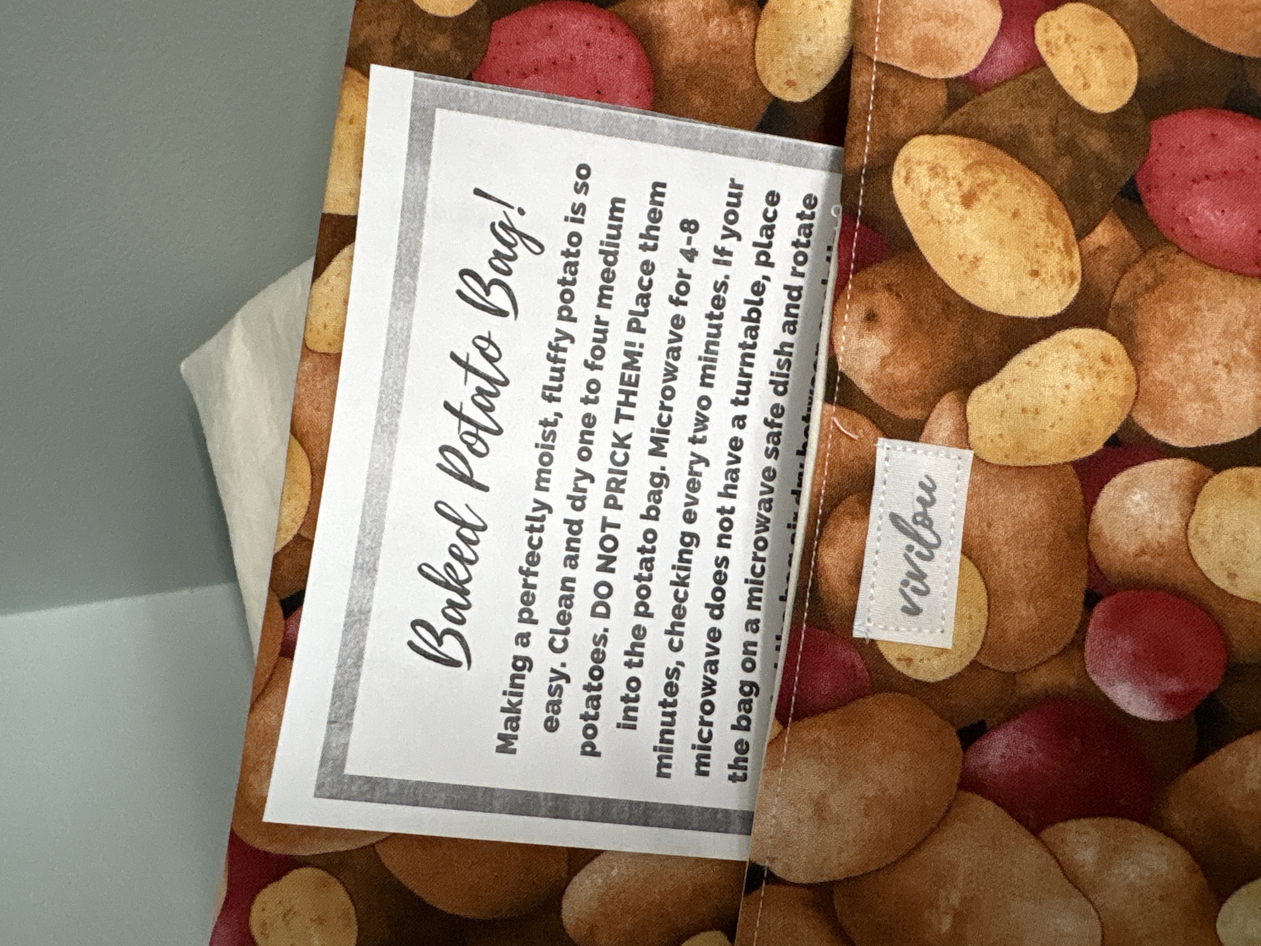 Approx 9 1/2” x 11”… 2 layers of 100% cotton and a 100% cotton batting in between. Great for making the perfect potatoe in the microwave. Comes with instruction card.. great for warming tortillas and cooking corn on the cob too… give one a try today!!