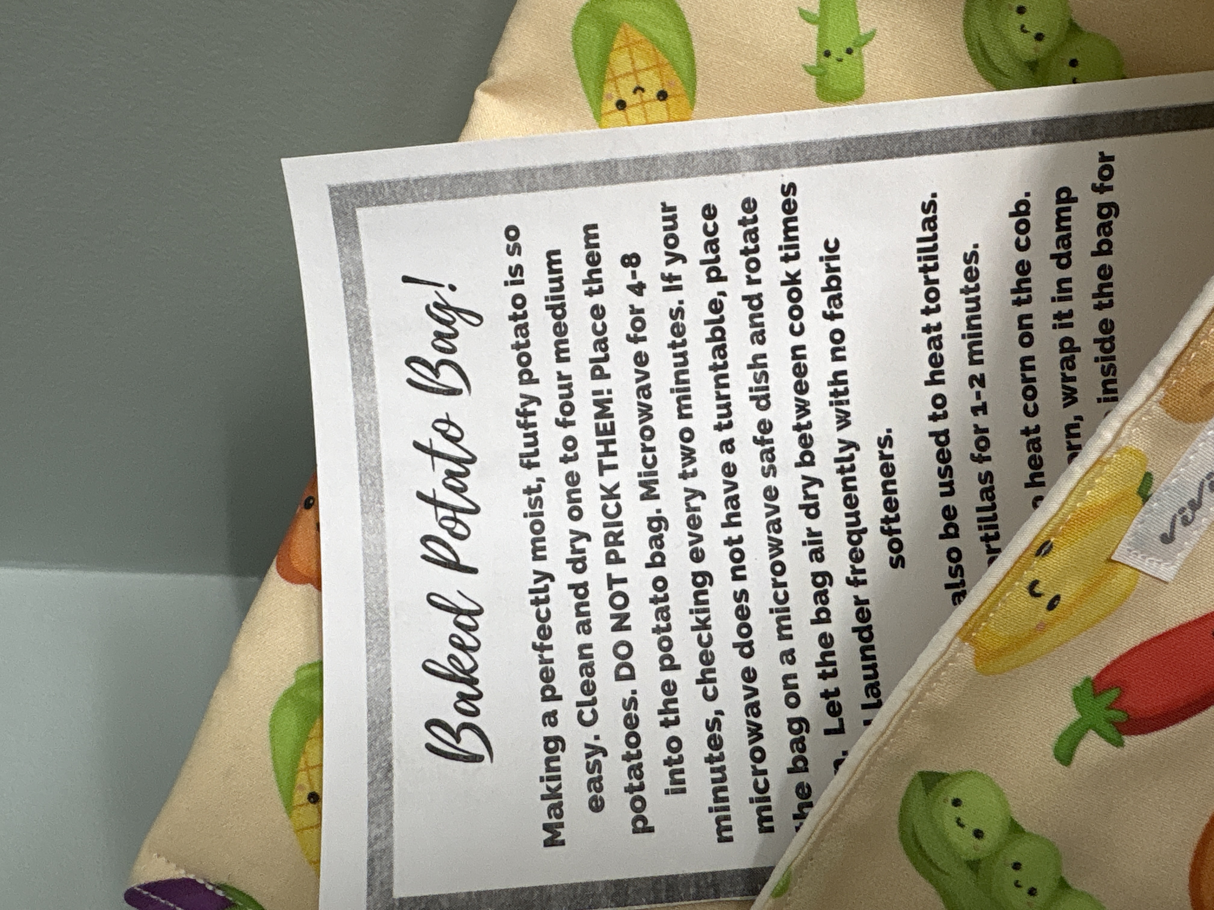 Approx 9 1/2” x 11”… 2 layers of 100% cotton and a 100% cotton batting in between. Great for making the perfect potatoe in the microwave. Comes with instruction card.. great for warming tortillas and cooking corn on the cob too… give one a try today!!