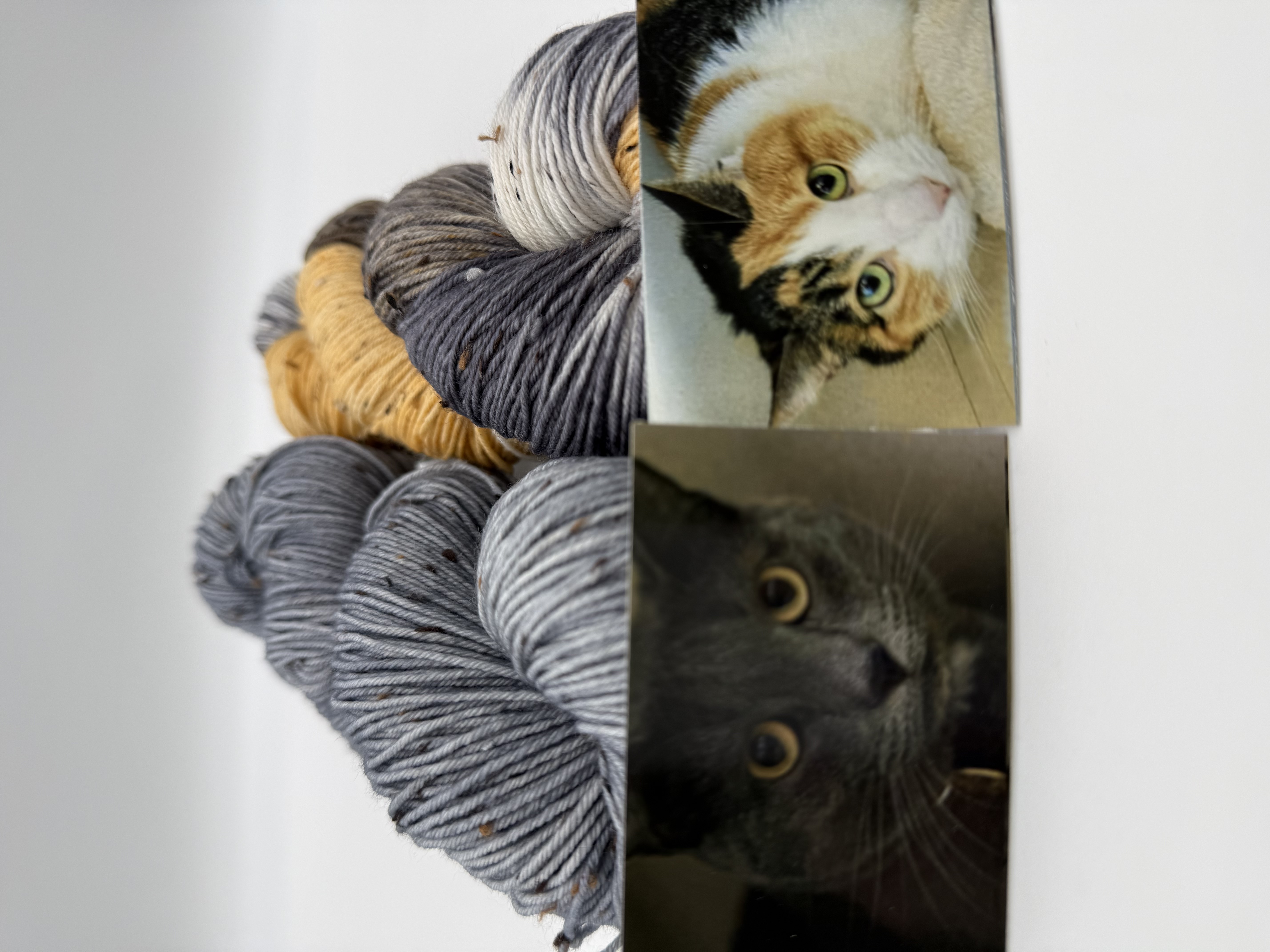 The fur coats and eye colors of adoptable kitties at Humane Colorado inspire these yarns. For each skein of Meow Mélange yarn sold, a monetary donation is made to help these kitties find their forever home and keep them comfortable while staying at the shelter.