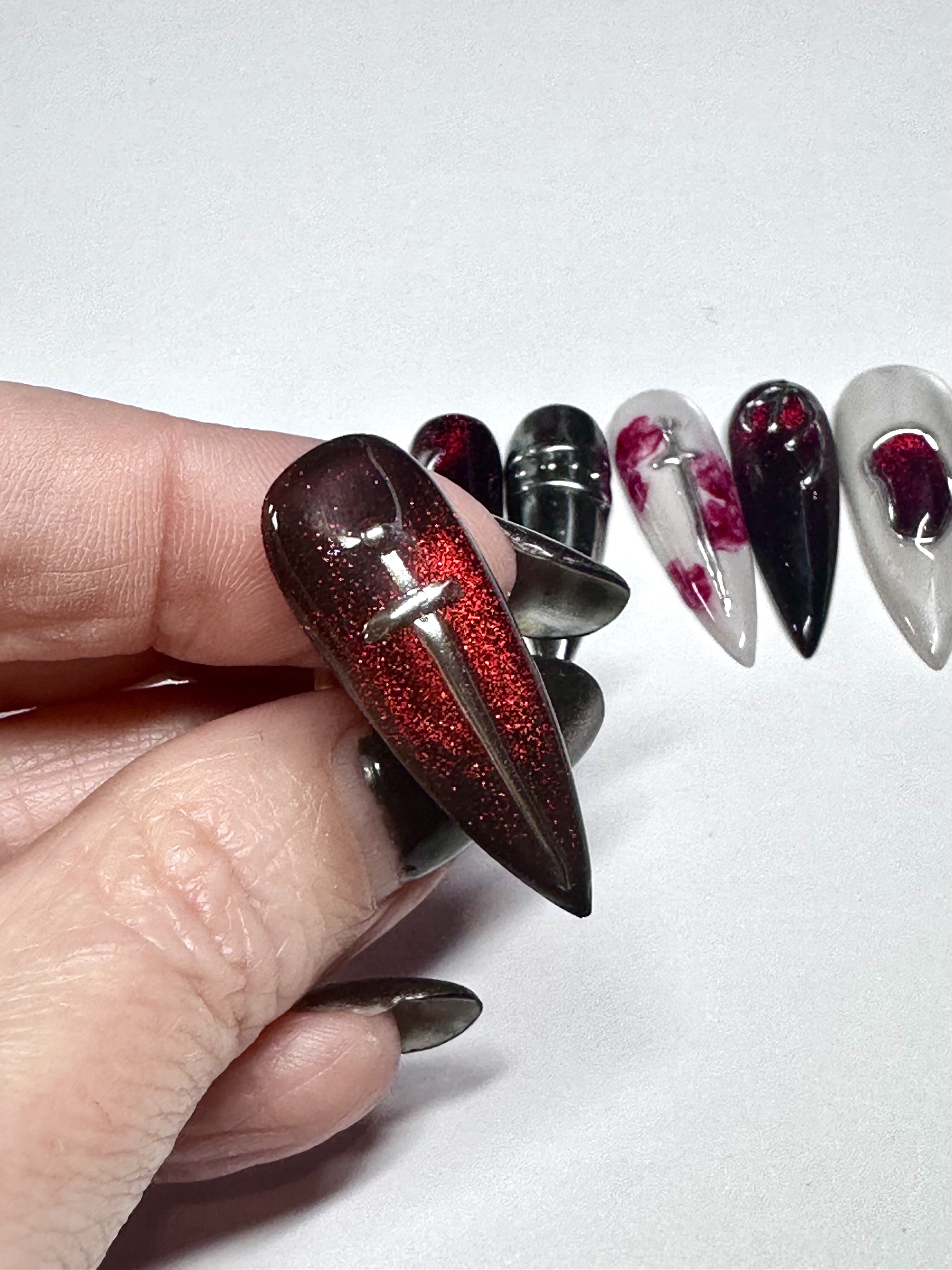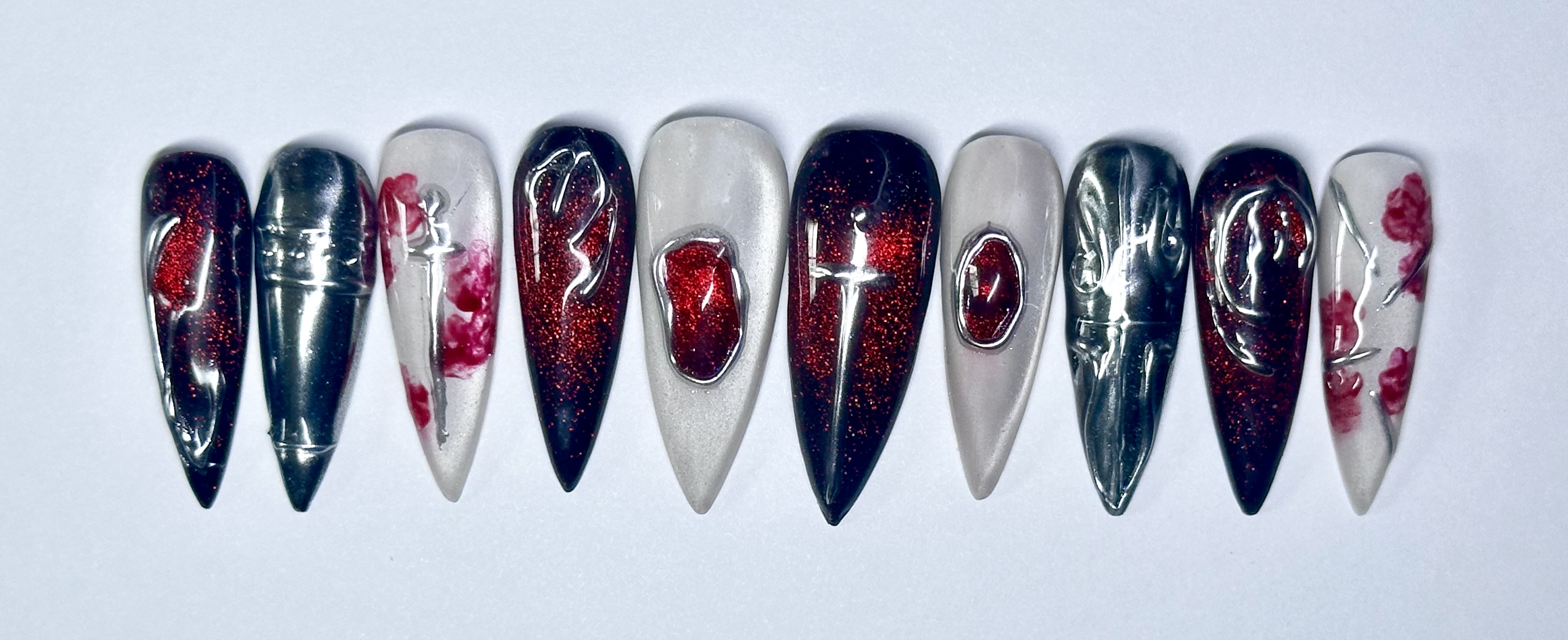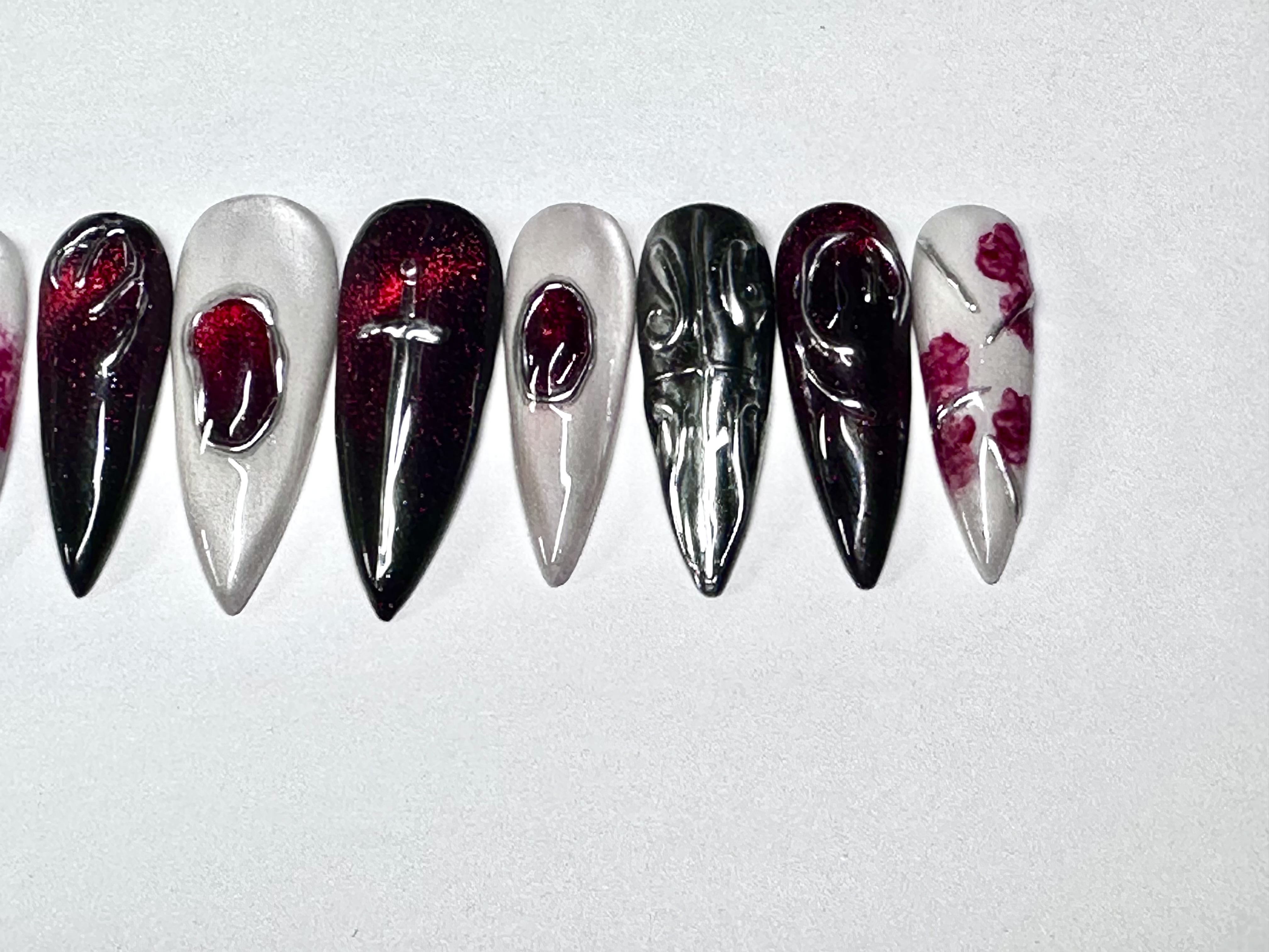This nail set is inspired the characters of D&D. It features a hand-painted roses with cat eye accents, layered with armor inspired chrome details. A key element featured in the design are the chrome swords and full chrome nails.