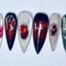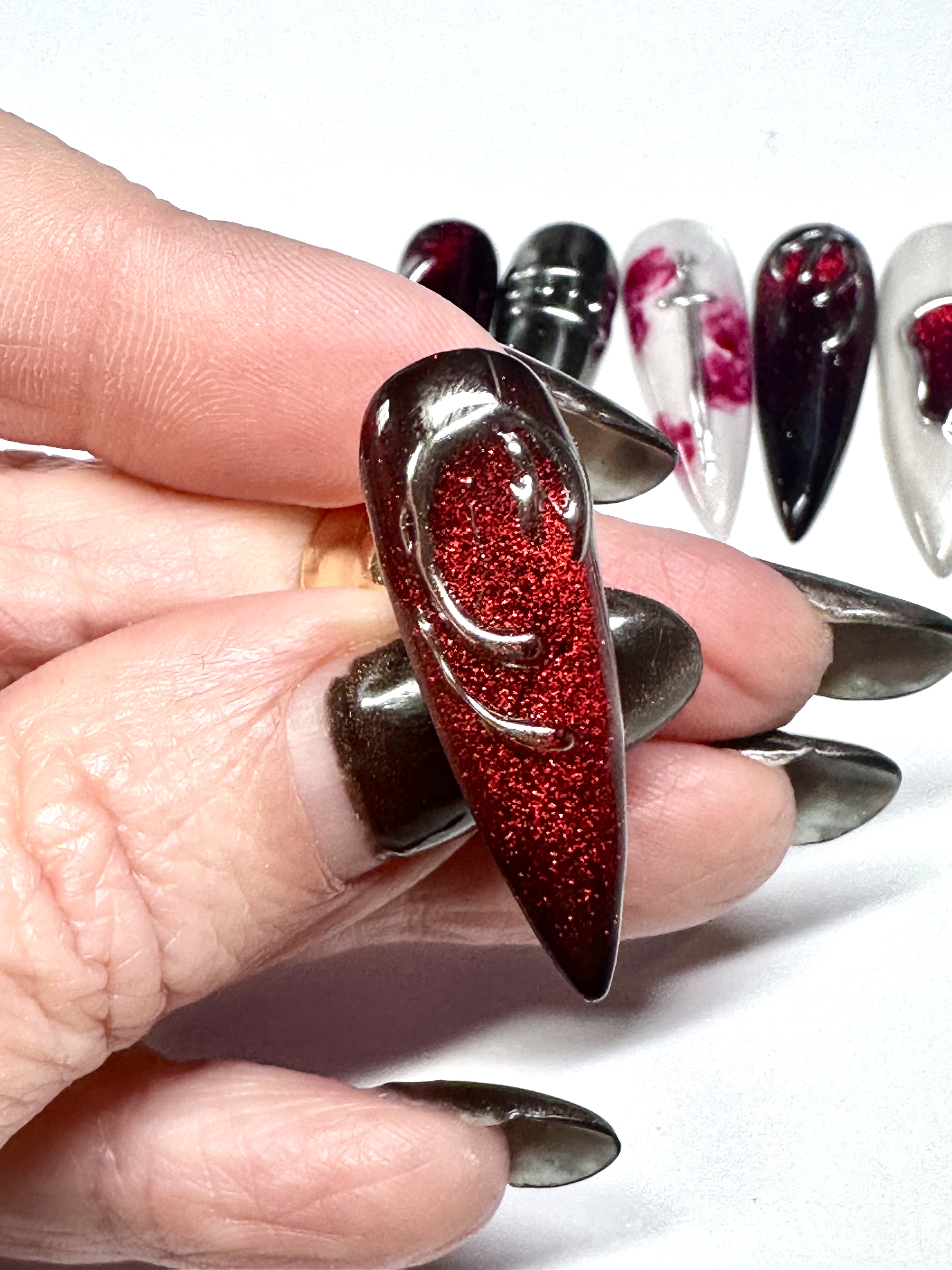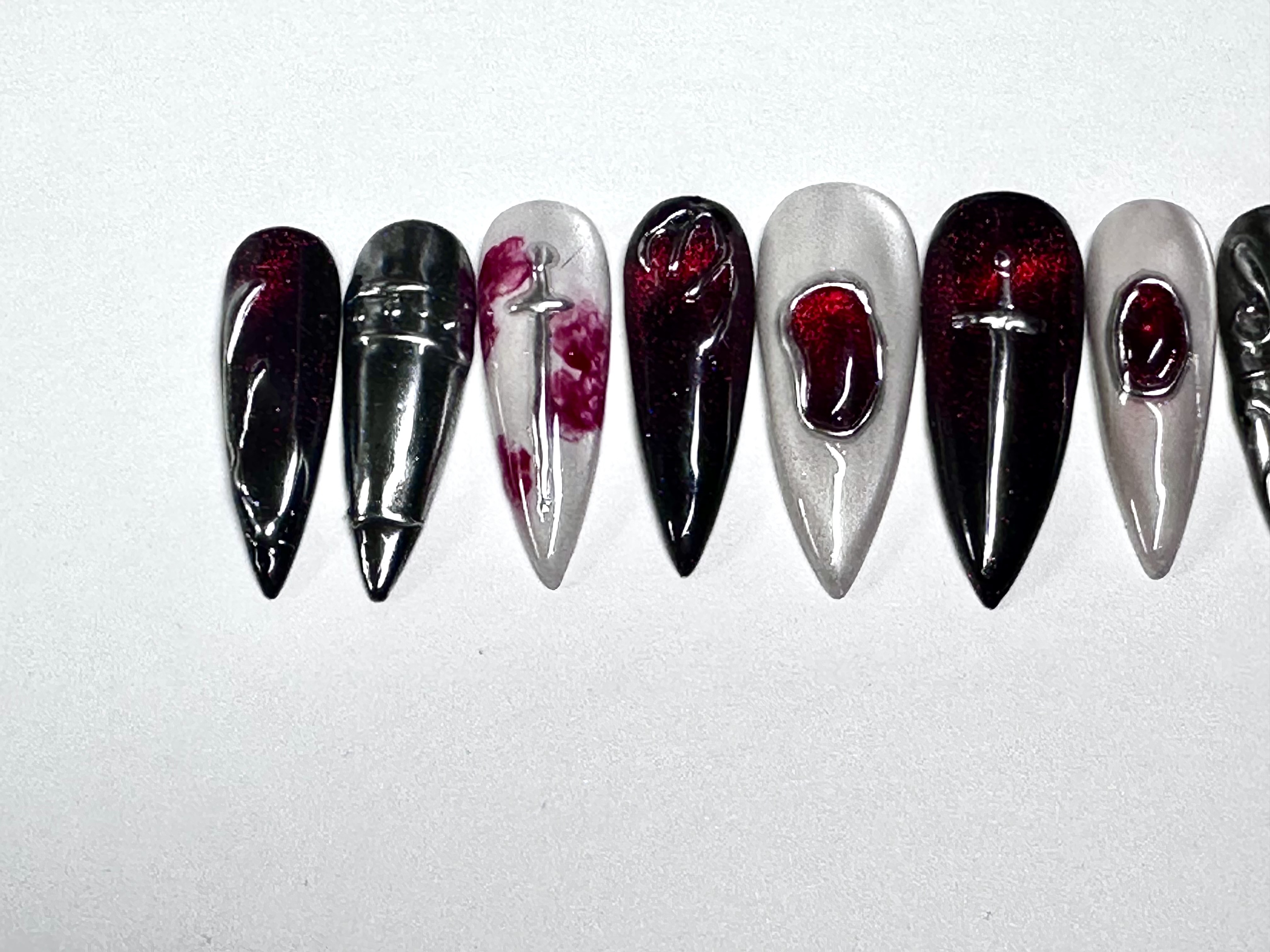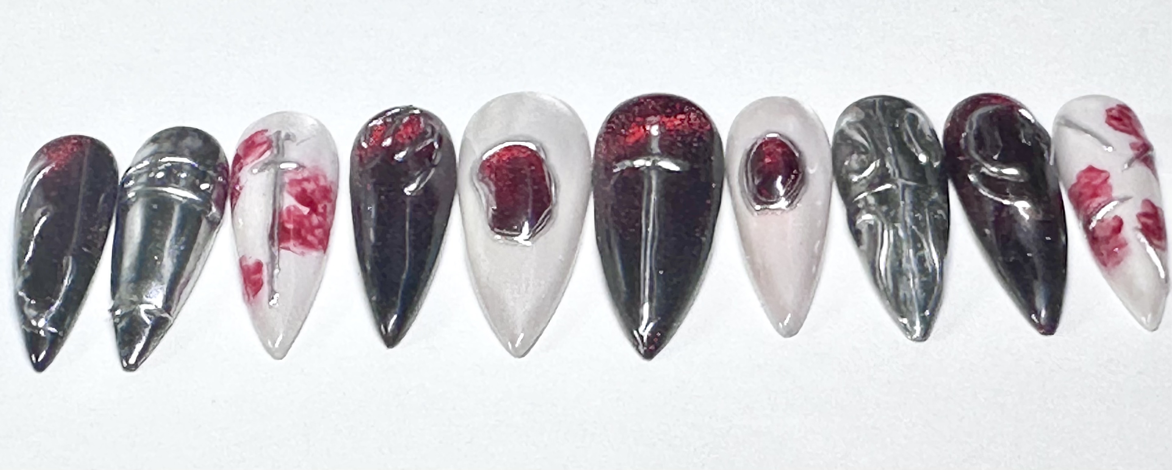 This nail set is inspired the characters of D&D. It features a hand-painted roses with cat eye accents, layered with armor inspired chrome details. A key element featured in the design are the chrome swords and full chrome nails.