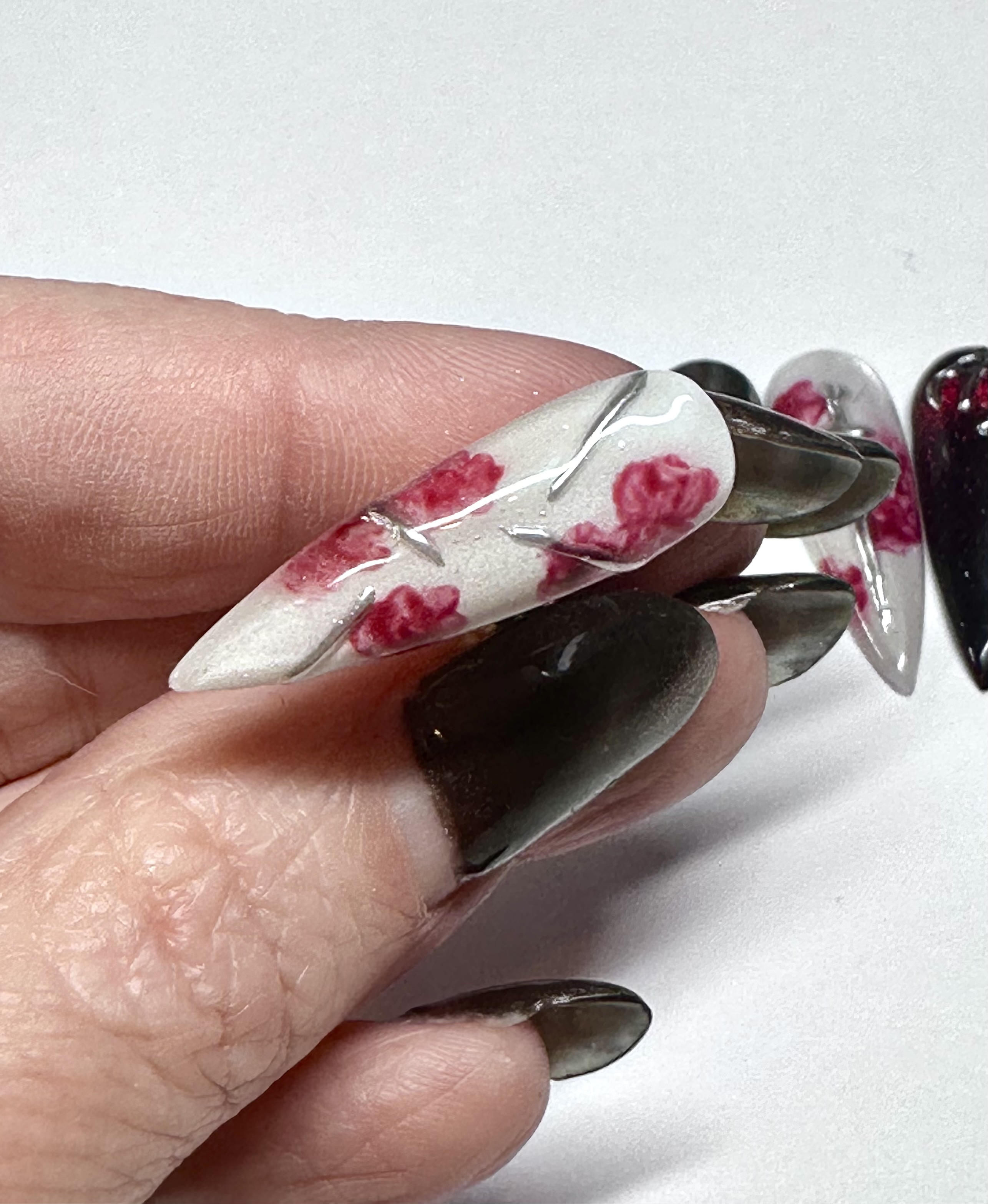 Each nail set is hand painted to order using quality gel polishes once you select your sizing, style and length. Please note, since each set is hand painted no two sets are exactly the same. Great care is given to accurately recreating the original design but each set is an original piece and will have subtle differences and be unique. Slight adjustments to the design may be necessary due to changes in nail shape or length, with the goal being to keep the feel and essence of the original design to fit your desired style.