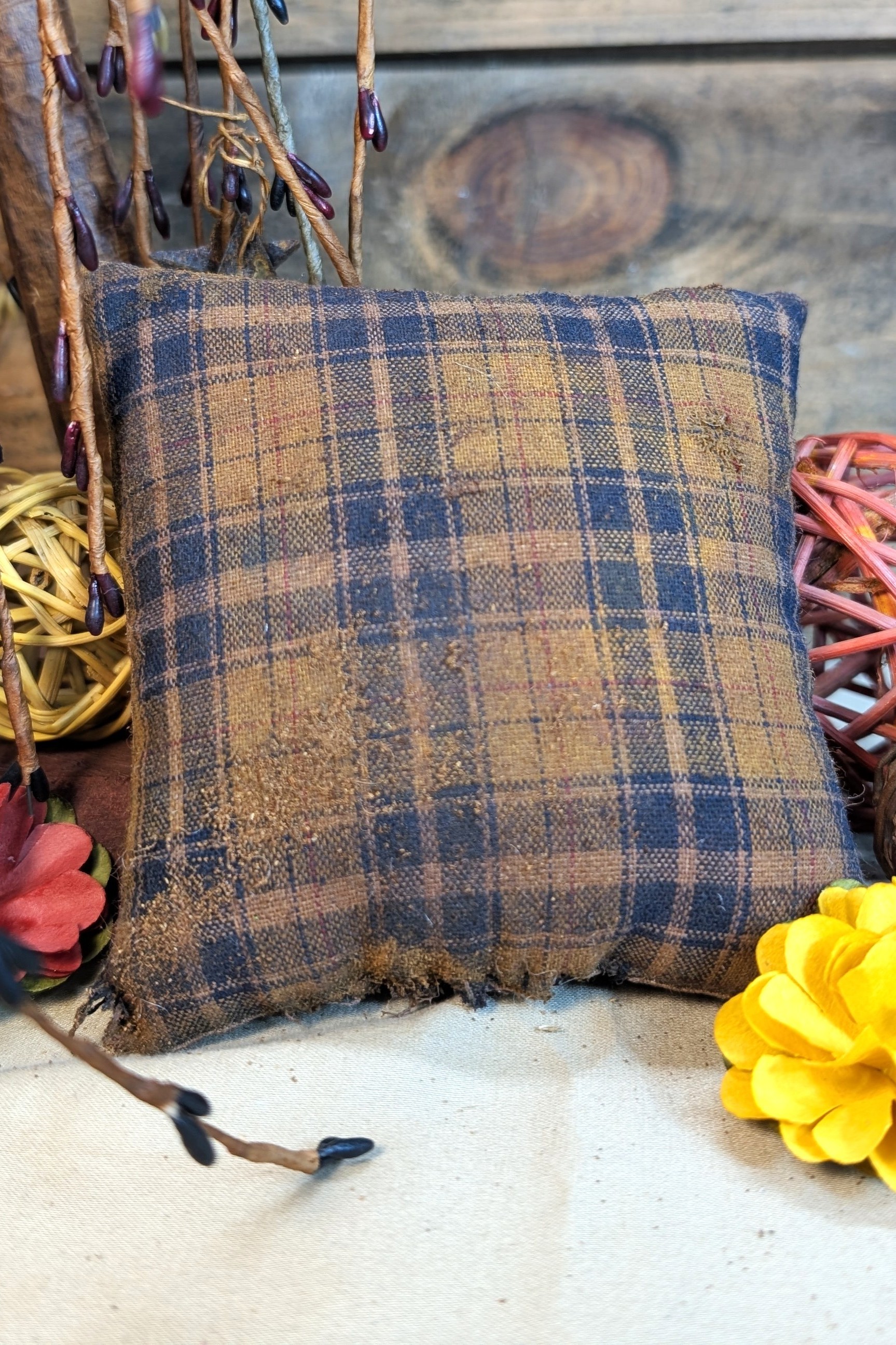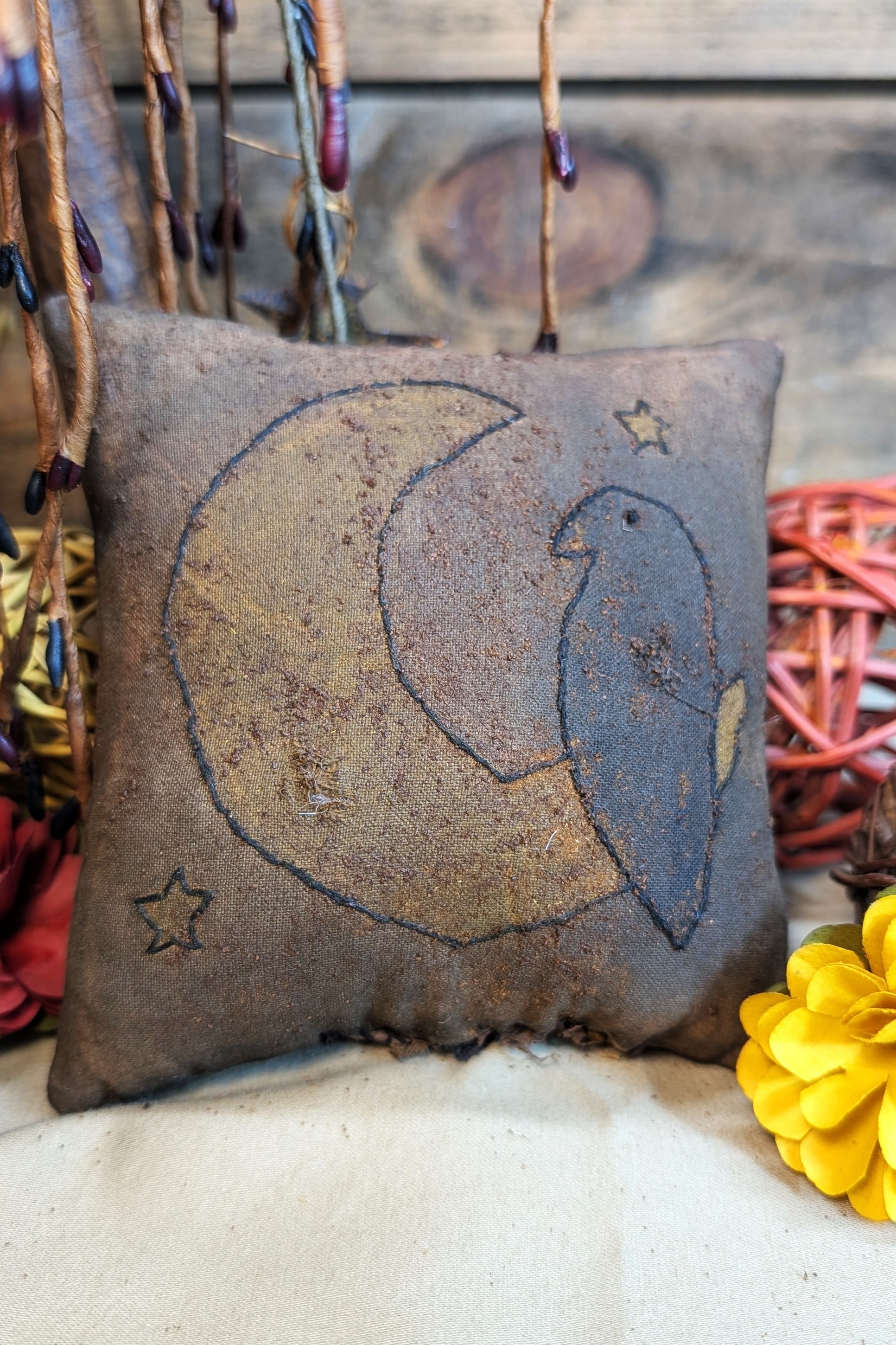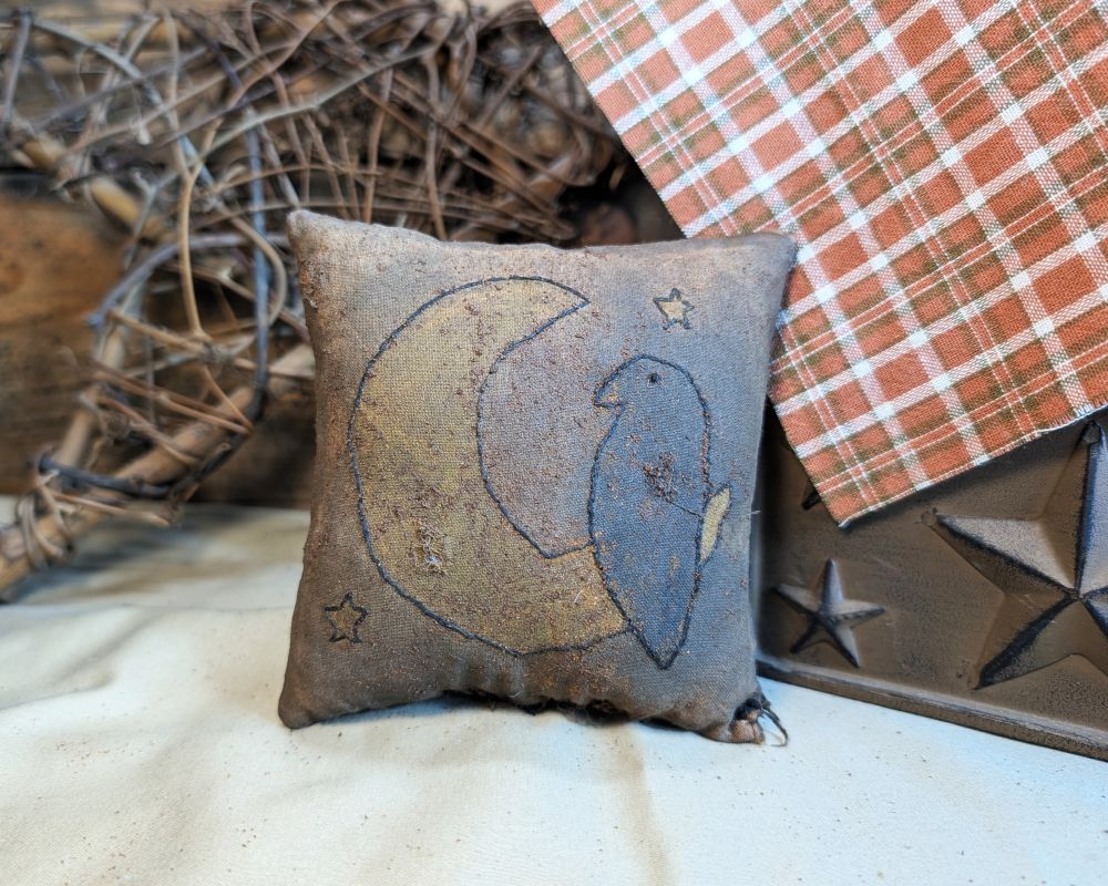 This primitive Cat and Moon 4-inch accent pillow features an embroidered and painted black cat sitting on a half moon on the front and blue and gold plaid fabric on the back. It has been created to have a rustic, vintage vibe. Stiffener and cinnamon have been added to the surface for extra grungy appeal.