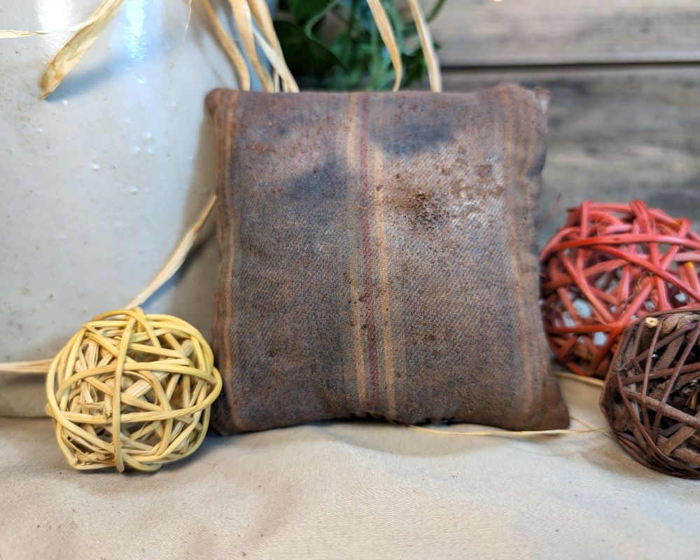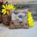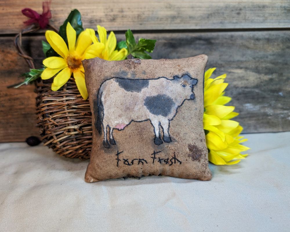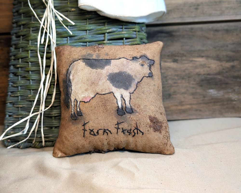 A primitive home decor 4-inch mini pillow featuring a Farm Fresh dairy cow is sure to bring plenty of farm life nostalgia to your home. It has been hand-embroidered and stained to give it a rustic vintage appeal, and a stiffener and some cinnamon have been added for an extra worn look. A cute addition to any rustic decor, or anywhere you would like to add a little extra farm charm.