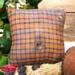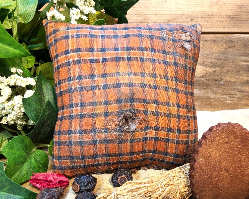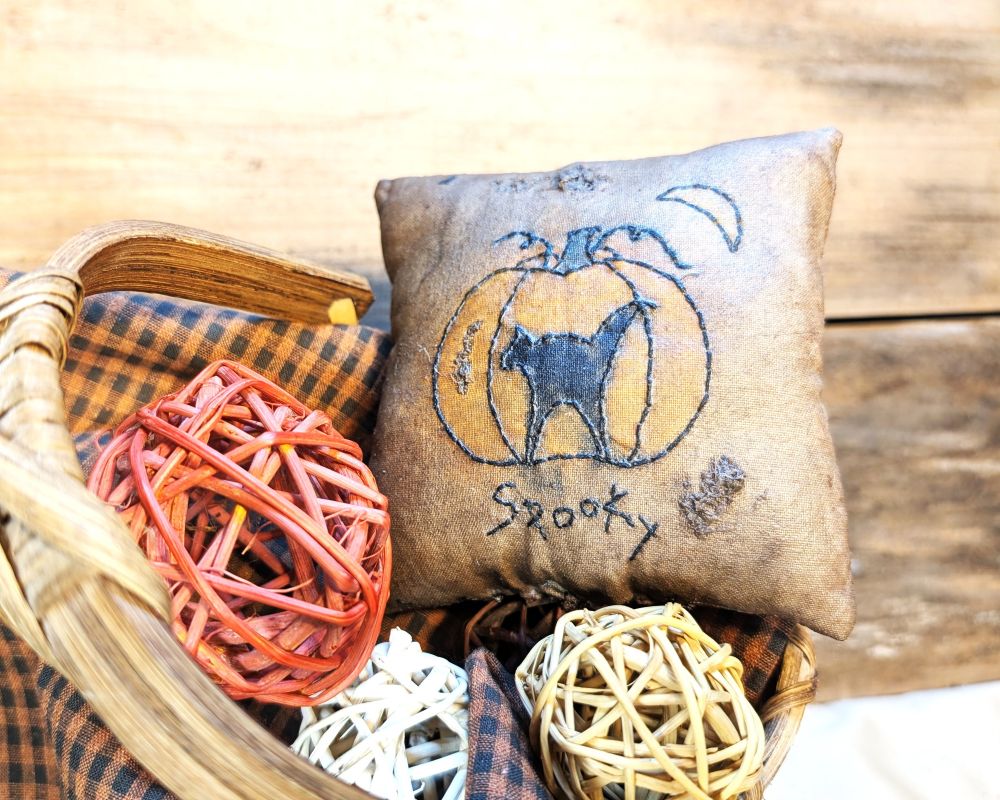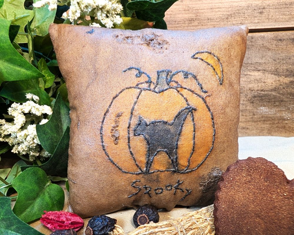 A primitive Halloween 4-inch pillow that can be tucked into any corner of your home for the upcoming spooky season. It features a cat, pumpkin, moon and the word "Spooky" on the front, and the back is a black and orange homespun plaid. This small square pillow tuck has been stained and painted to look old and tattered, and a light coat of stiffener has been added to give it added durability.