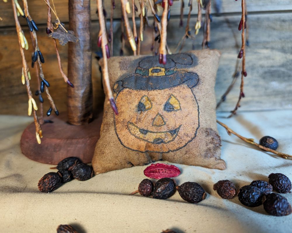 A primitive 4-inch Jack o Lantern Pillow for Halloween Home Decor. It has been embroidered and painted to look vintage and tattered and has a coat of stiffener with cinnamon added to the surface for a rustic appeal.