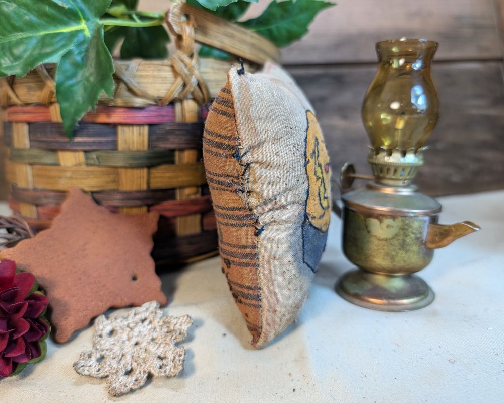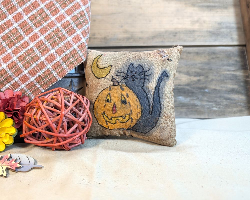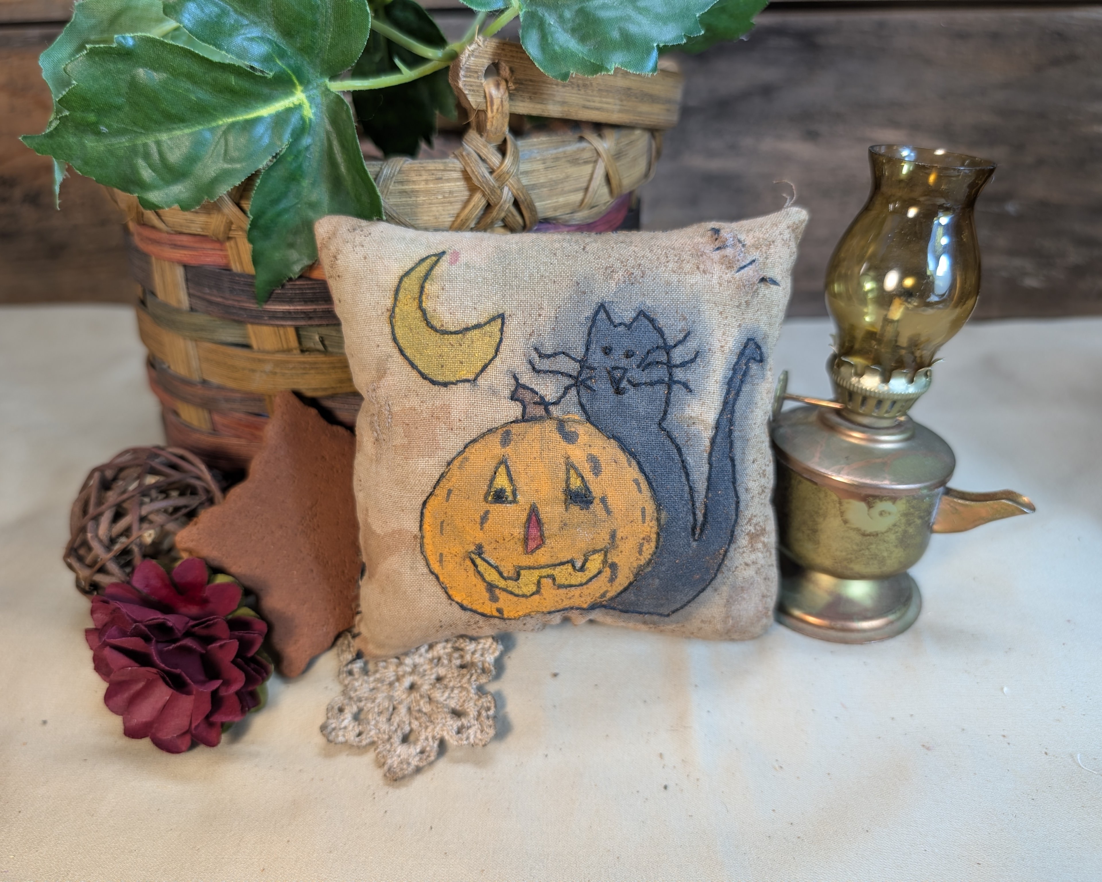 This primitive Halloween 4-inch accent pillow features an embroidered and painted carved pumpkin, cat and moon on the front and striped fabric on the back. It has been made to have a rustic, vintage vibe. Stiffener and cinnamon have been added to the surface for extra grungy appeal.