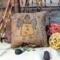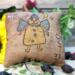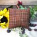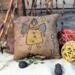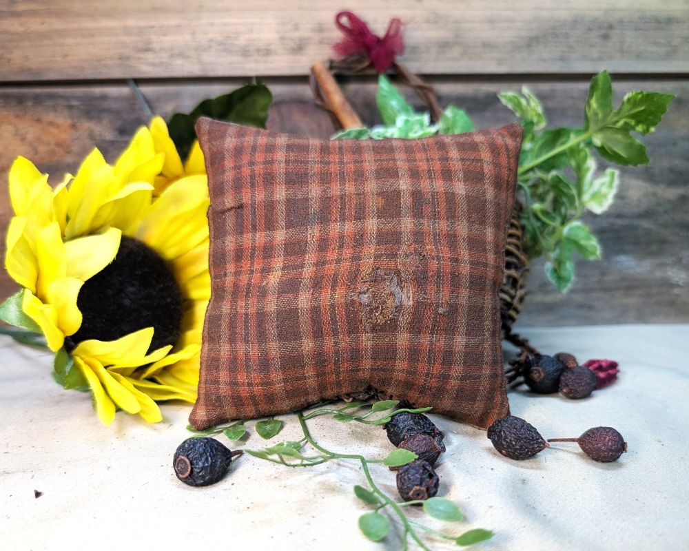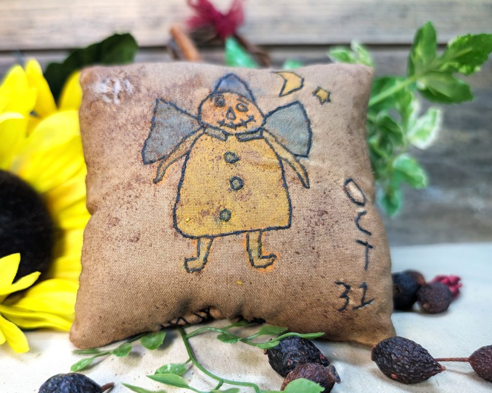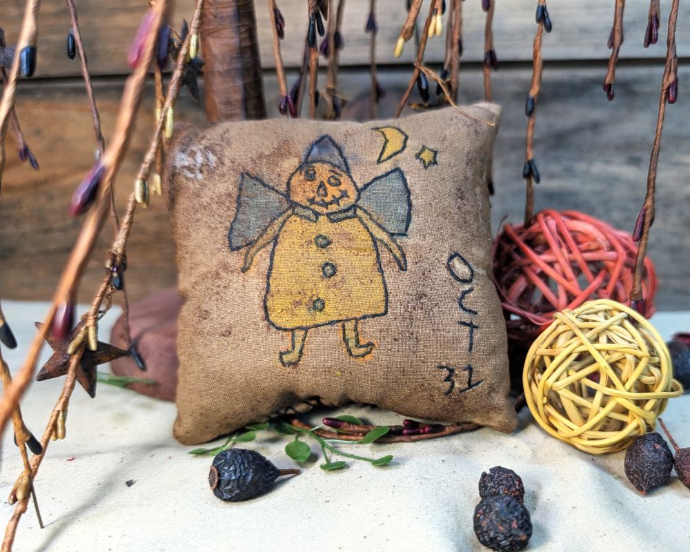 This primitive little witch pillow will bring more whimsy to your home for the Halloween season. She is handstitched and painted on a 4-inch pillow with brown and orange plaid fabric on the back. Stiffener and cinnamon have been added to the surface for a rustic, tattered look.