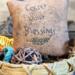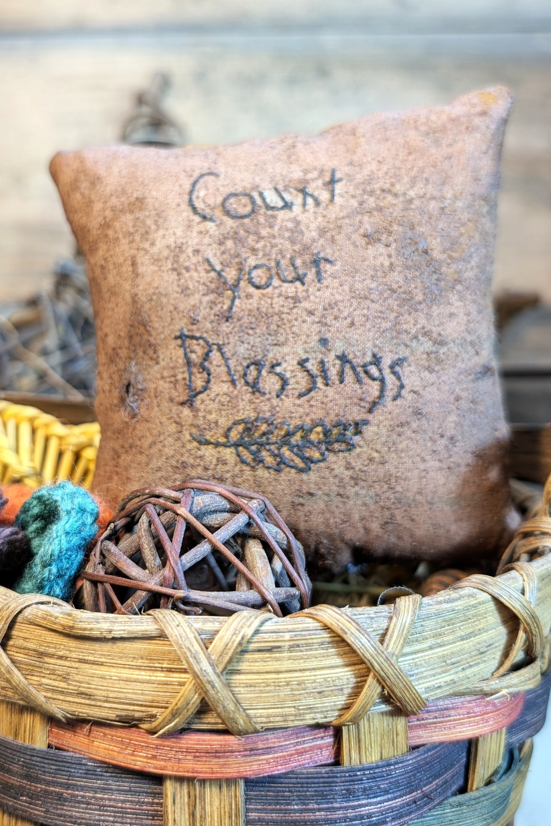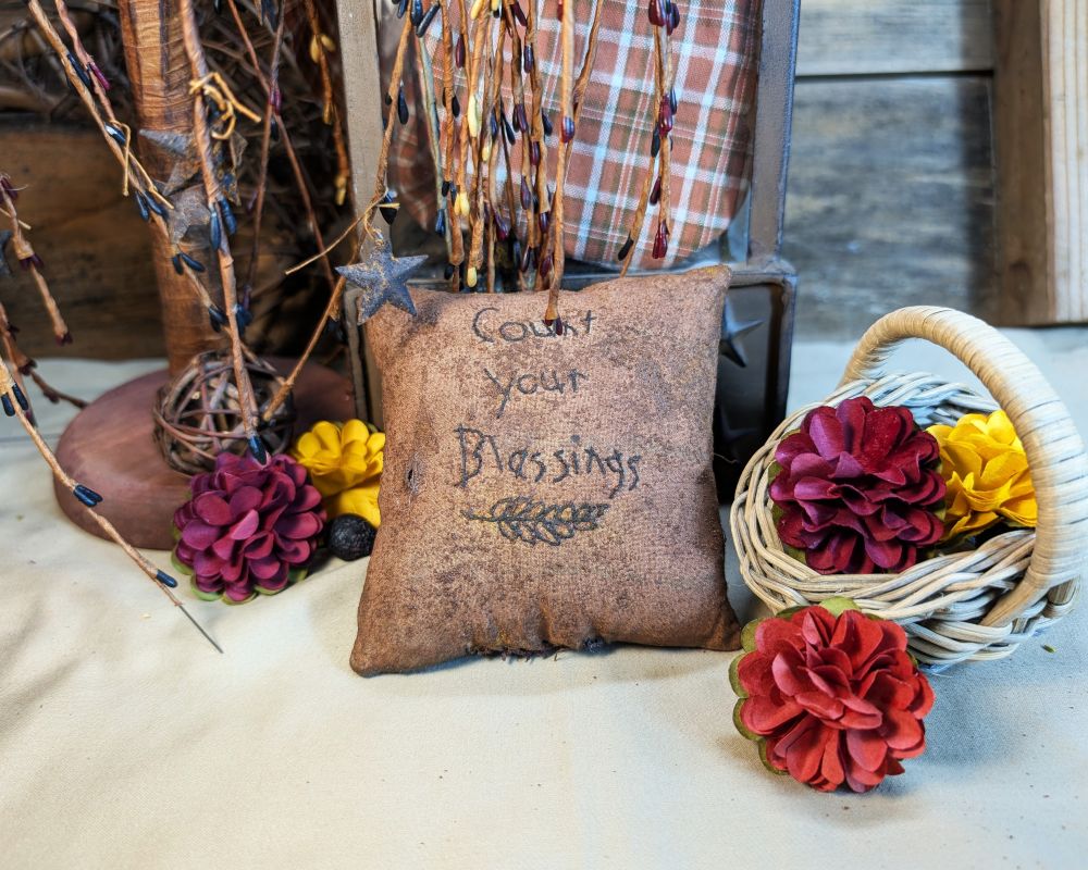 A handmade primitive 4-inch decorative pillow with Count Your Blessings a a wheat sheaf embroidered on the front. Stiffener and cinnamon have been added for a more rustic vintage look.