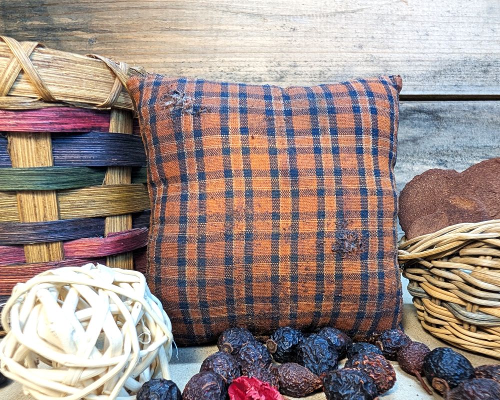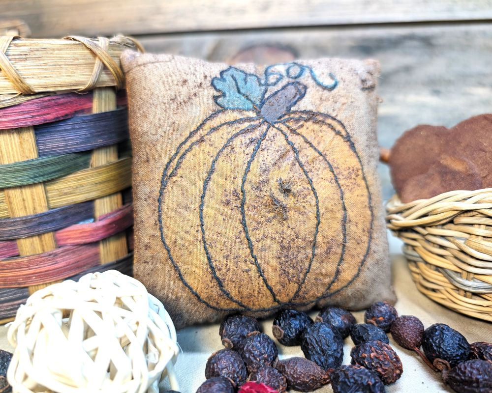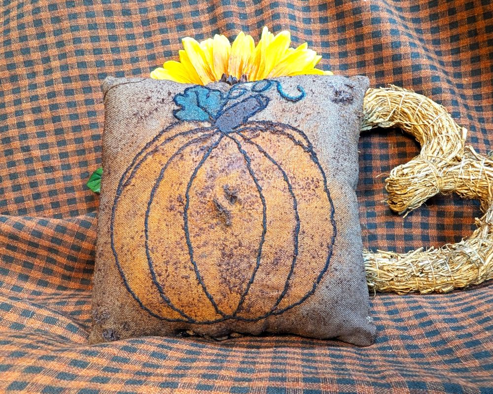 This primitive handmade mini accent pillow is perfect for bringing fall charm to your home decor. It is a fabric pillow that has been handstitched, painted and stained to have a vintage appeal. It measures approximately 4" square and has been coated with stiffener to keep the cinnamon from shedding and to give it more durability, especially if you would want to display it in a covered outdoor area.