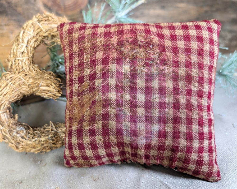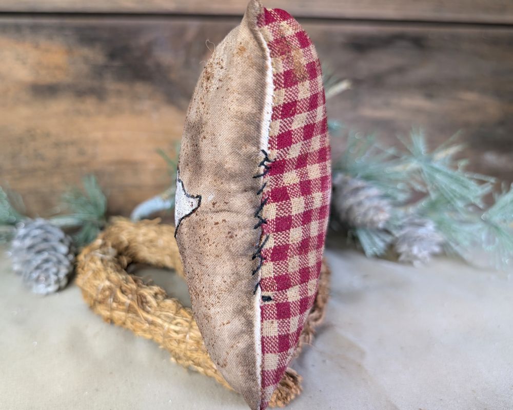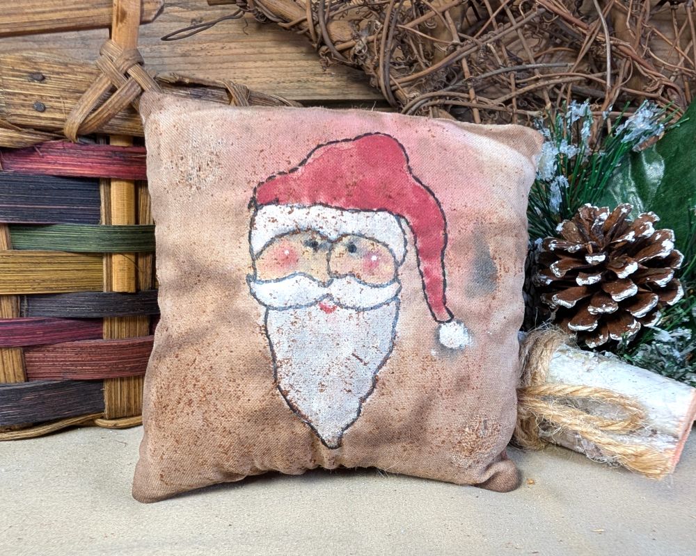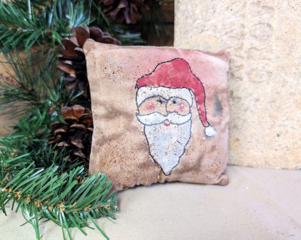 Add Christmas spirit you home for the holiday season with this cute little 4-inch pillow that Santa hand embroidered and painted on the front. The pillow has a light coat of stiffener and cinnamon added for an extra rustic vintage touch.