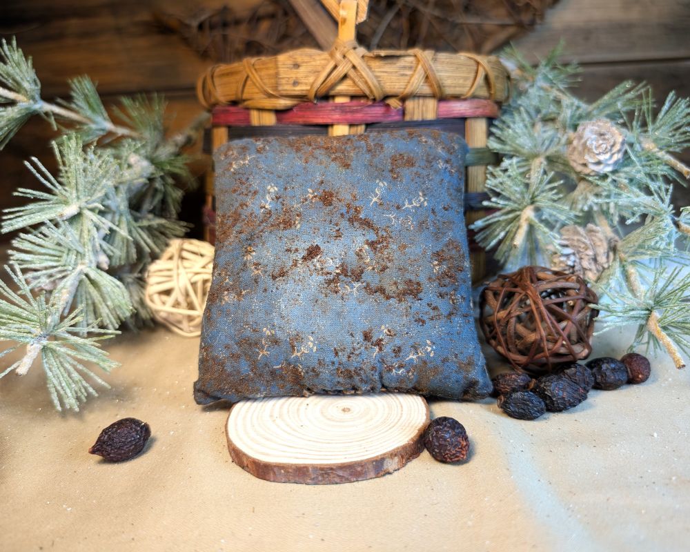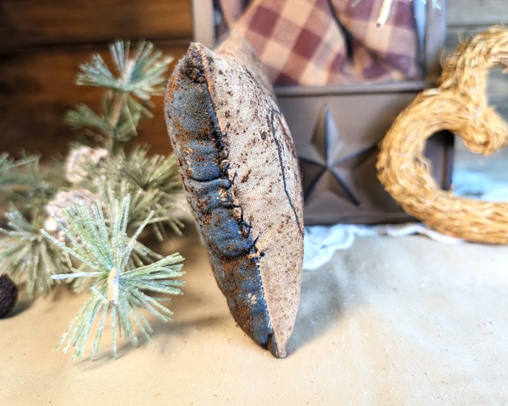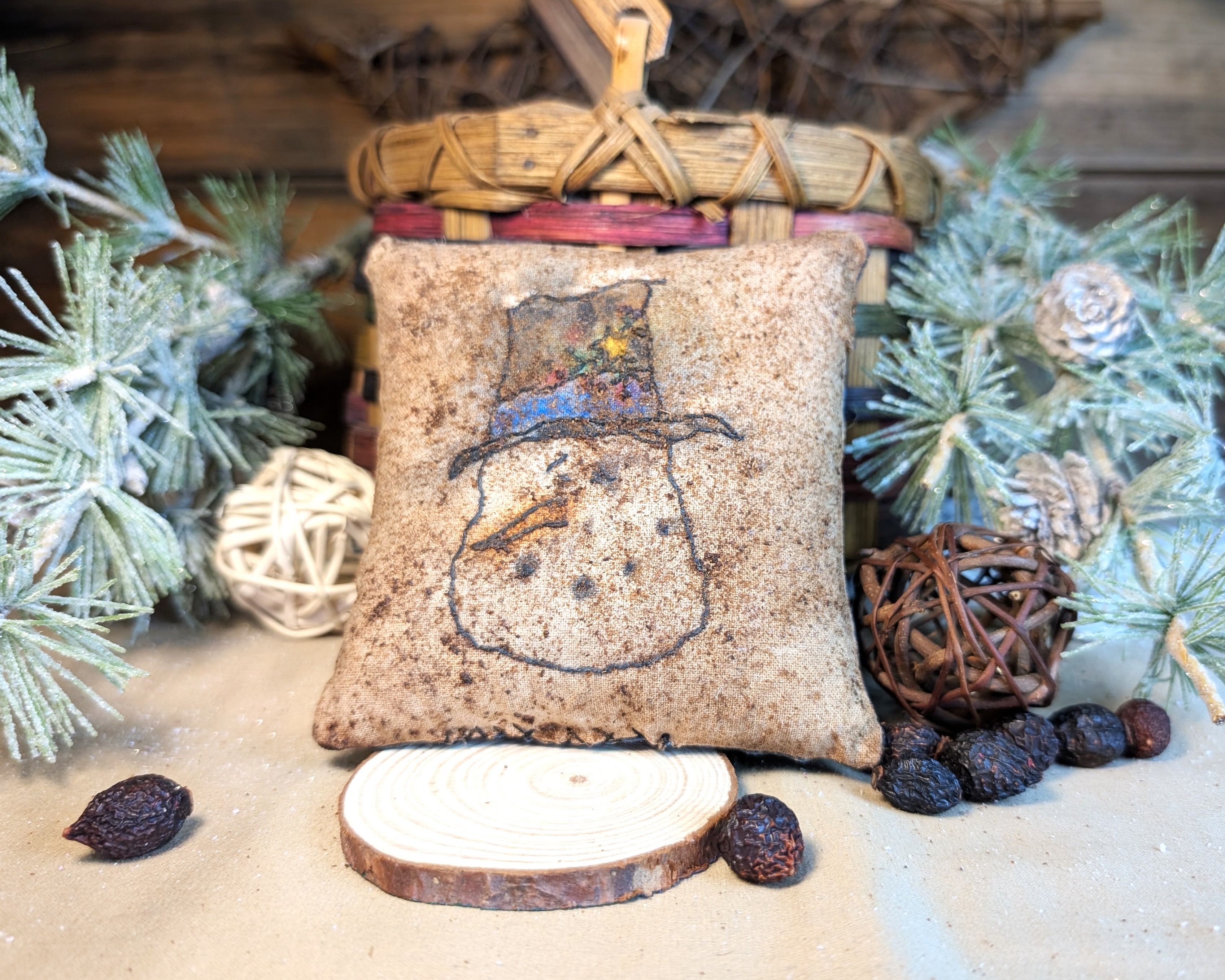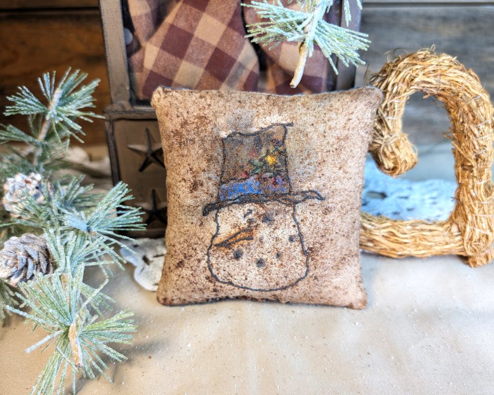 Bring a touch of winter charm to your home with this primitive snowman 4-inch accent pillow that is handstitched and stained to look vintage and used. It has been stained and distressed with cinnamon and stiffener that has been added to keep spices from shedding. Just in time for the holiday season, this little guy would look perfect an any tiered tray or rustic homestead decor. He would also make a great stocking stuffer or hostess gift.