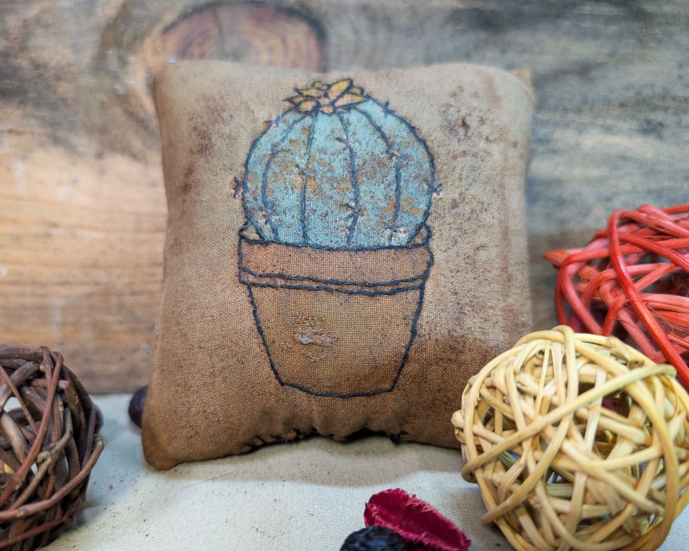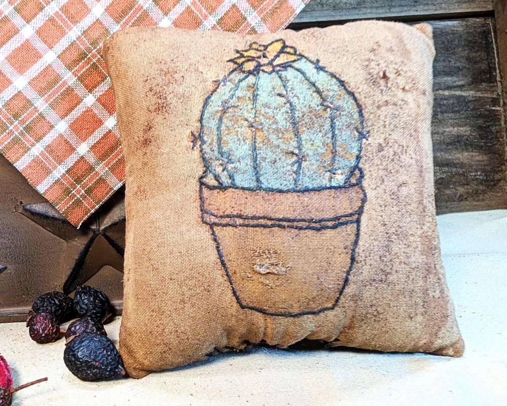 A primitive cactus is sure to bring a touch of Southwestern charm to your home. It is a 4-inch home accent pillow that has been embroidered and painted and stained to look tattered and rustic.