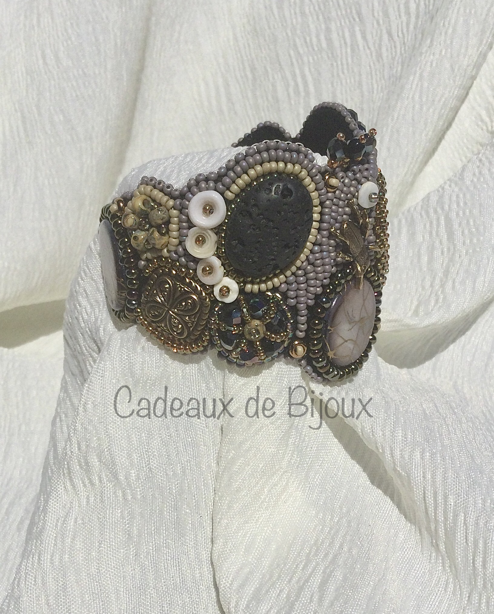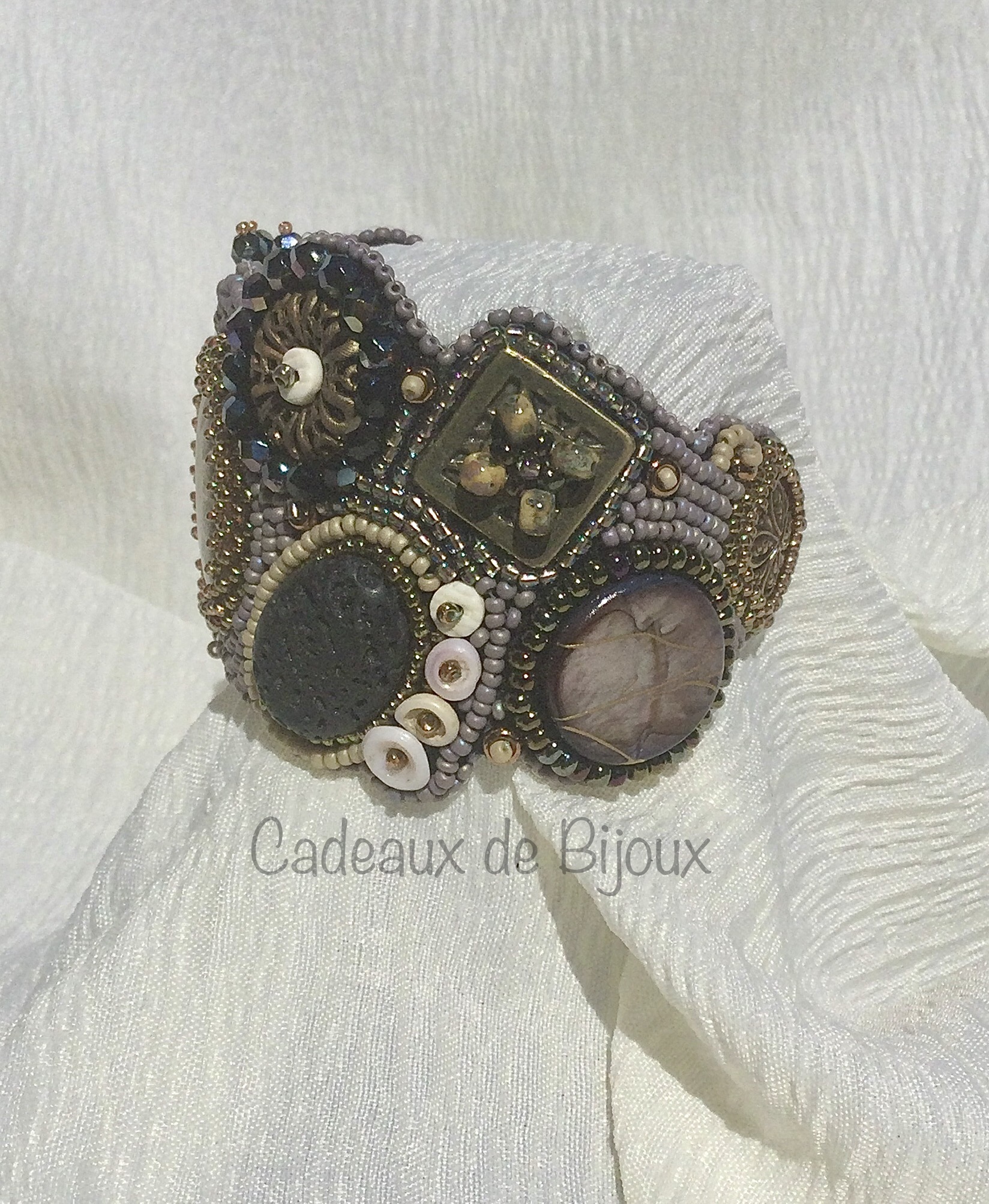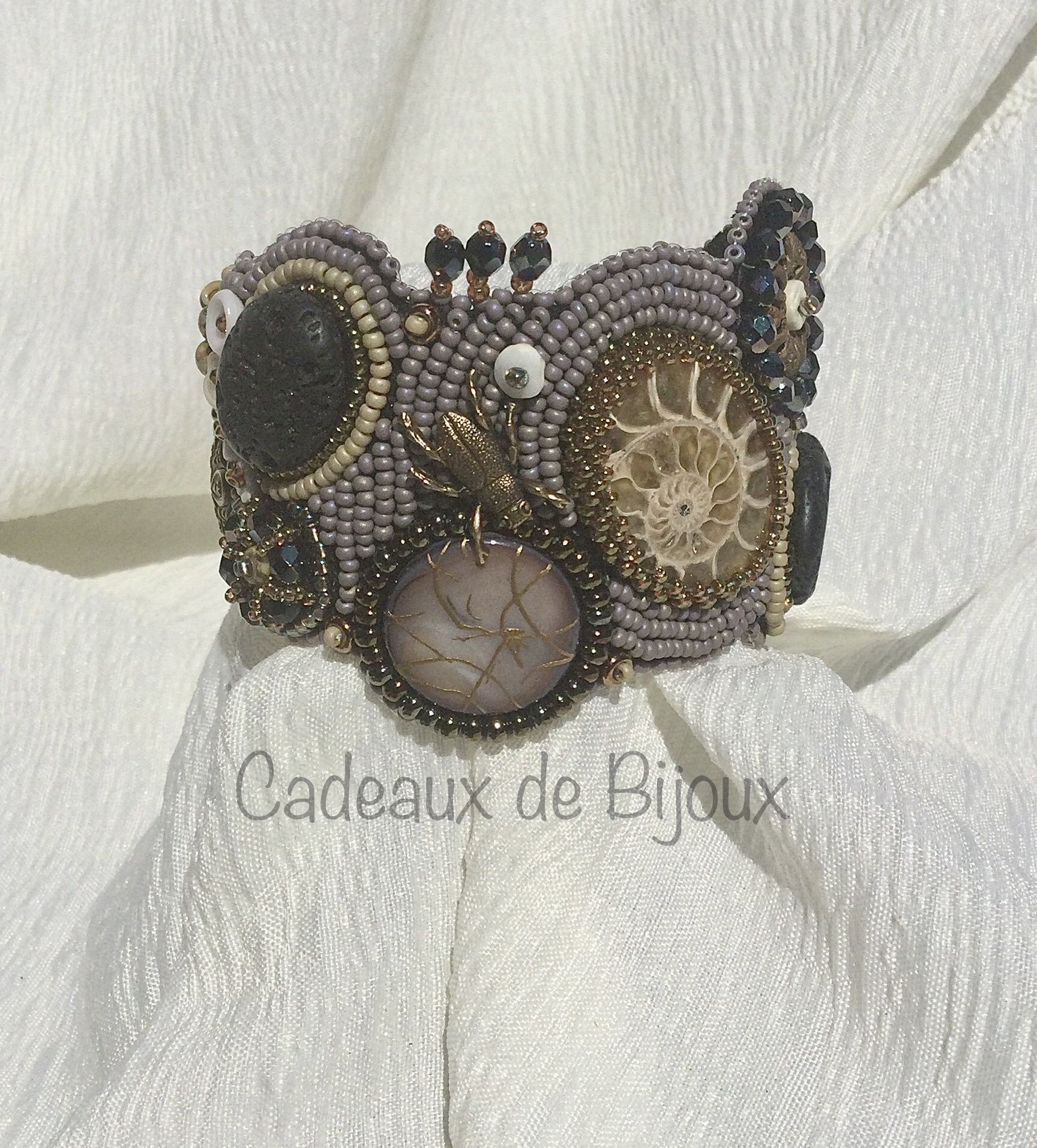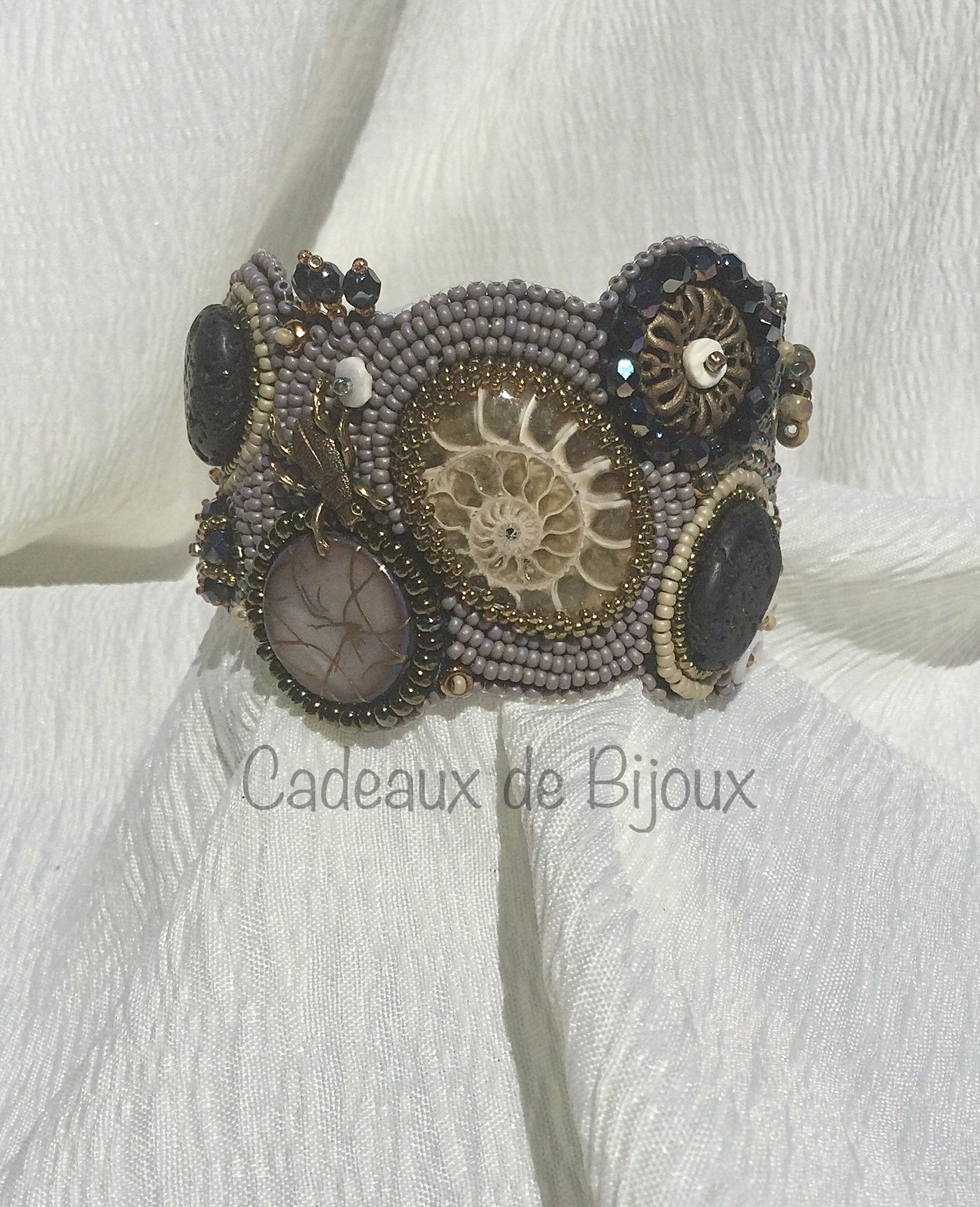 Polished ammonite, lava rock, shell and glass beads are hand stitched onto a felt foundation, wrapped around an aluminum core and backed with soft ultrasuede.