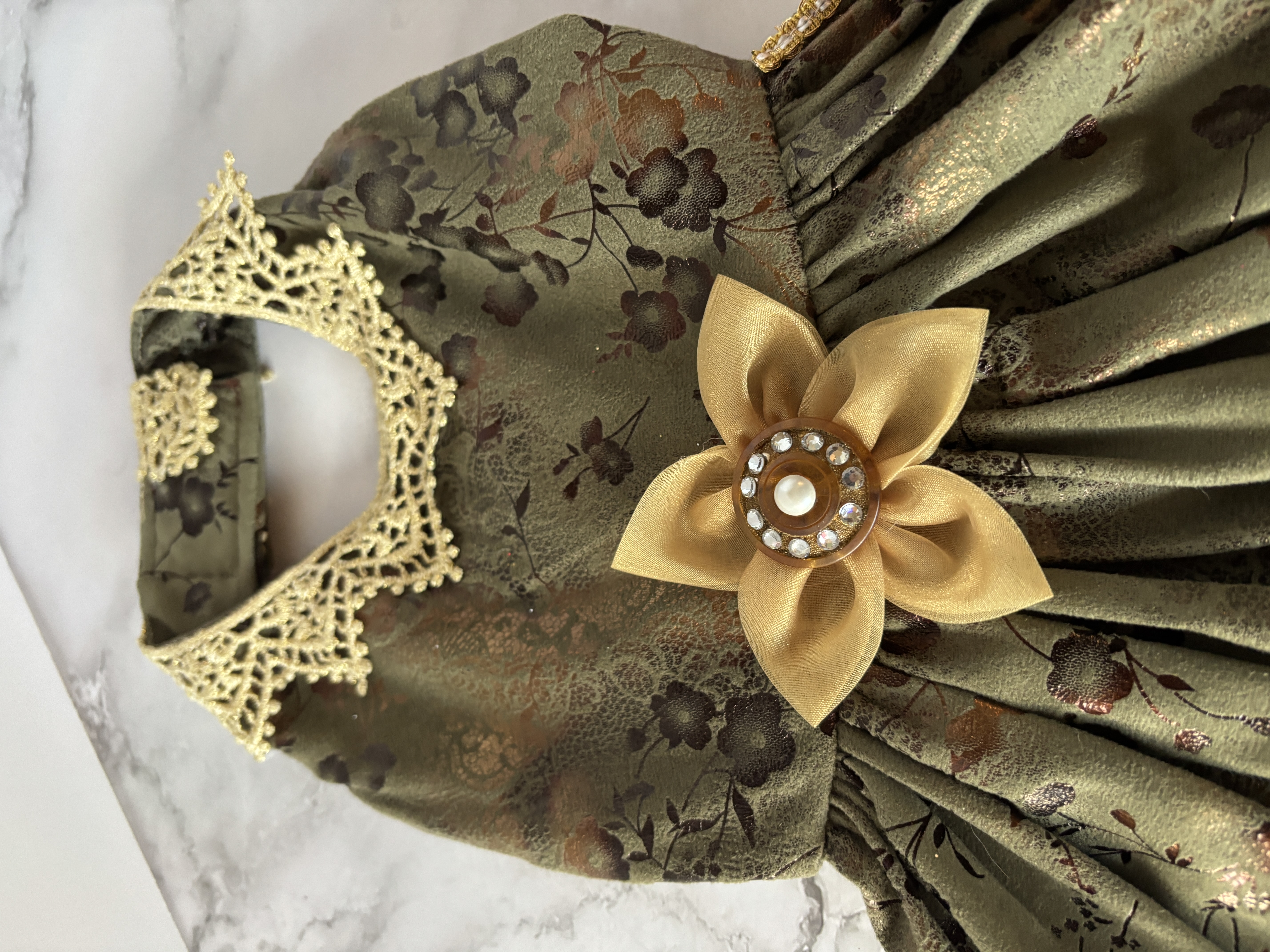 This dress was made for a huge fashion show in LA, and I made it so when worn the little lady would feel really regal. LOL The fabric is very soft and has a gold shimmer to it, with a shimmery lace collar, beautiful trim around the whole skirt, and a beautiful flower at the waist that is adorned with a pearl and pure Austrian crystals.