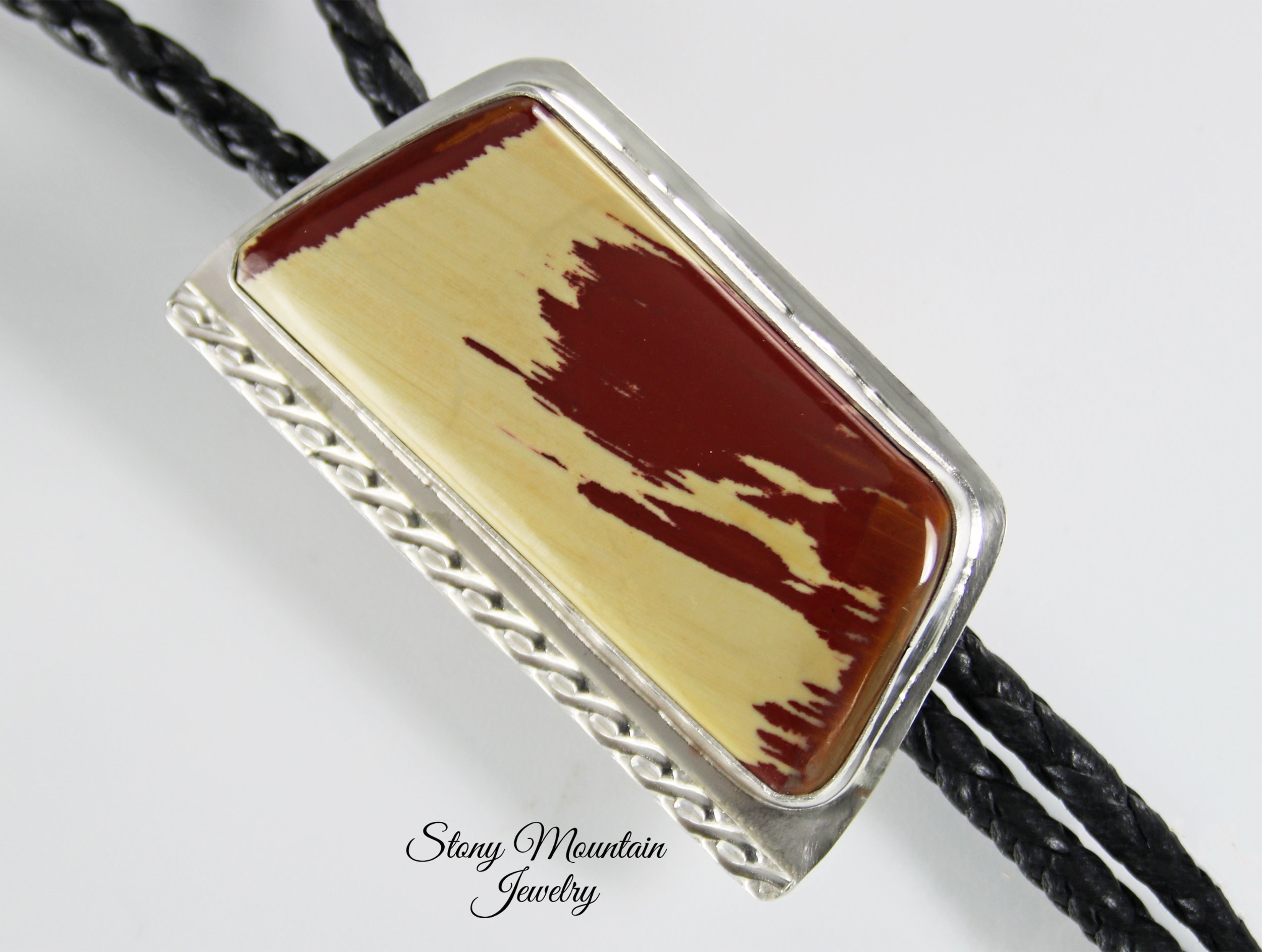 Contemporary Bolo Tie. No rules - this beautiful bolo can be worn by men or women. A wonderful alternative for formal attire or a funky bit of dress up with a tee shirt - NO rules apply for Bolo Ties! Rare hand cut freeform Owyhee Jasper is artistically set in sterling silver. This unusual stone is accented with three sterling silver balls The handcrafted slide uses friction rather than a mechanical device. This slide will keep your tie securely in place without crimping the leather cord. Lapidary work, design and fabrication all done by Ran. Your choice of black or brown cord.