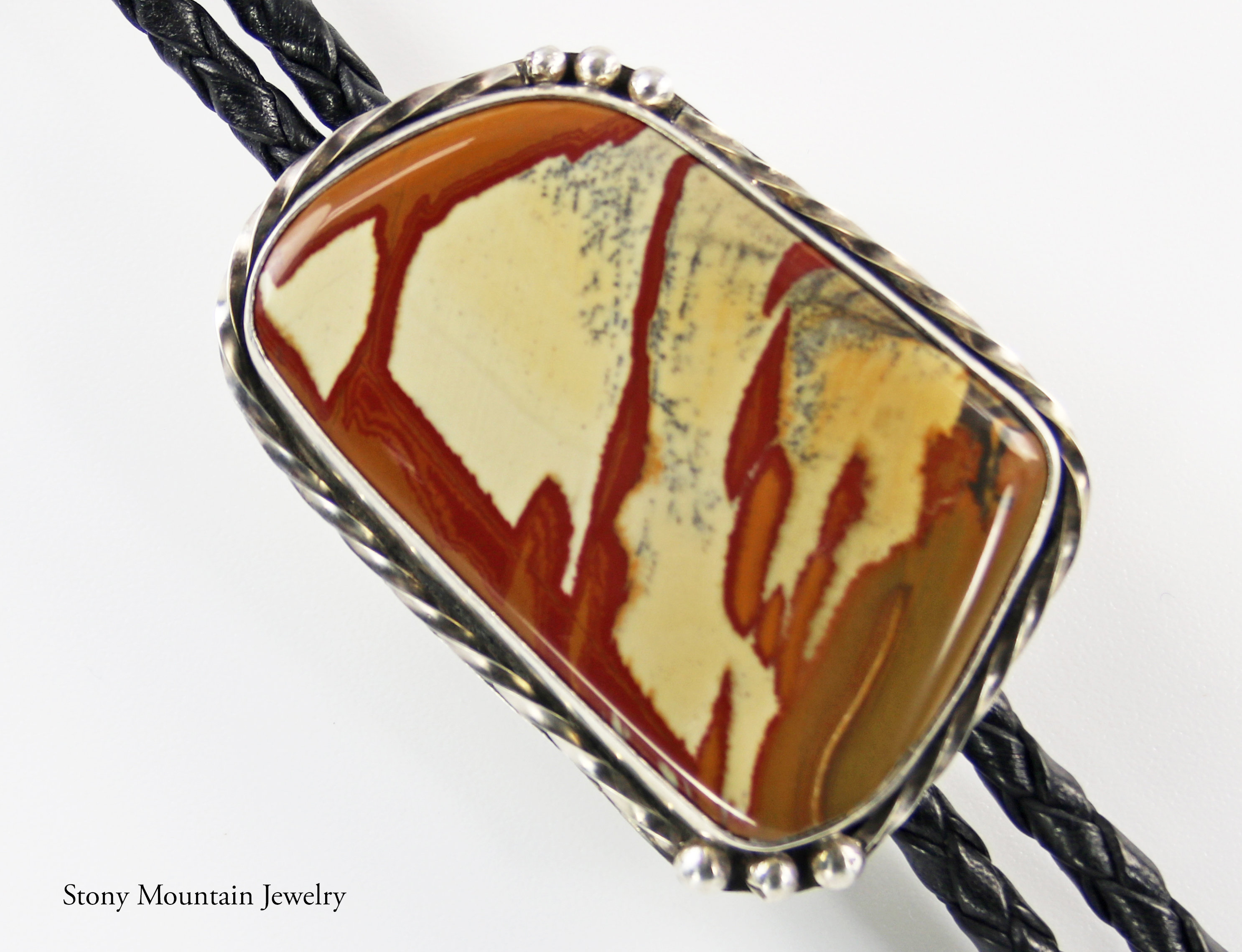 Contemporary Bolo Tie. No rules - this beautiful bolo can be worn by men or women. A wonderful alternative for formal attire or a funky bit of dress up with a tee shirt - NO rules apply for Bolo Ties! Rare hand cut freeform Owyhee Jasper is artistically set in sterling silver. This unusual stone is accented with three sterling silver balls The handcrafted slide uses friction rather than a mechanical device. This slide will keep your tie securely in place without crimping the leather cord. Lapidary work, design and fabrication all done by Ran. Your choice of black or brown cord.