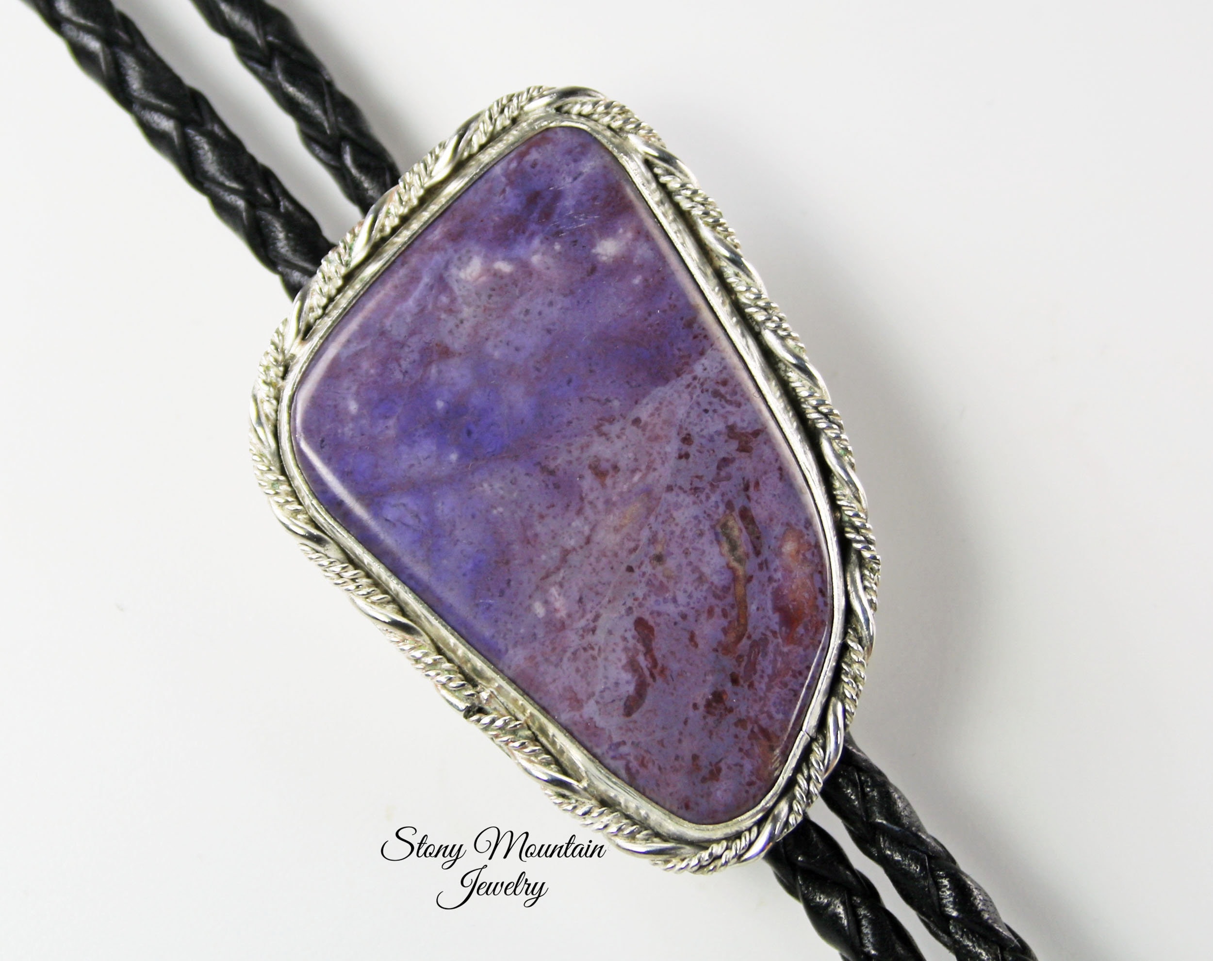 One of a Kind Contemporary Bolo Tie. No rules - this beautiful bolo can be worn by men or women. A wonderful alternative for formal attire or a funky bit of dress up with a tee shirt - NO rules apply for Bolo Ties! Rare hand cut freeform Purple Jade cabochon is artistically set in sterling silver. This stone has beautiful mottled shades of purple. The handcrafted slide uses friction rather than a mechanical device. This slide will keep your tie securely in place without crimping the leather cord. Lapidary work, design and fabrication all done by Ran.
