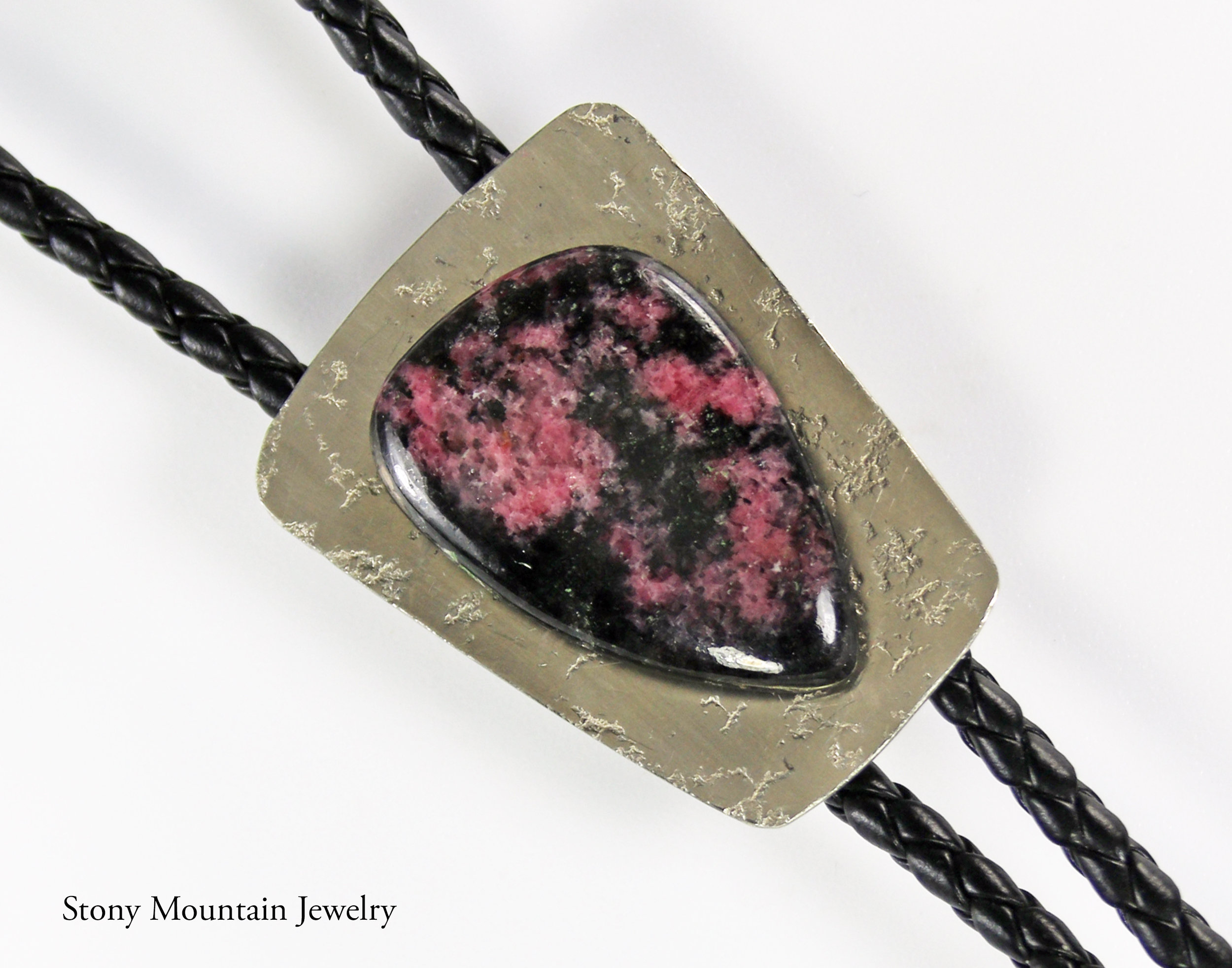 Contemporary Bolo Tie. No rules - this beautiful bolo can be worn by men or women. A wonderful alternative for formal attire or a funky bit of dress up with a tee shirt - NO rules apply for Bolo Ties! Beautiful Eudialyte hand cut cabochon is mounted on a textured pewter surround. The stainless steel mechanical slide allows your vegan cord to easily adjust and then stay in place.