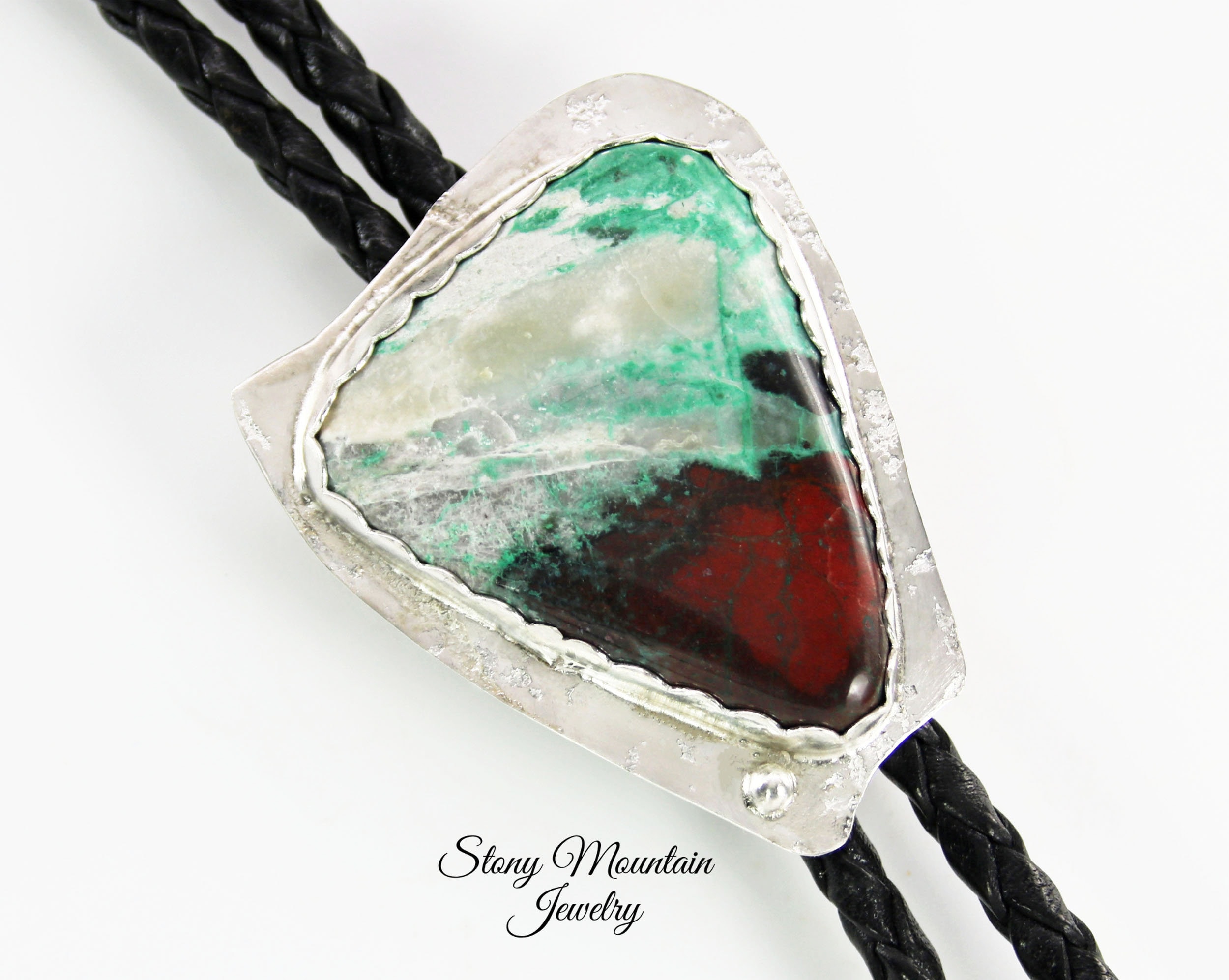 Contemporary Bolo Tie. No rules - this beautiful bolo can be worn by men or women. A wonderful alternative for formal attire or a funky bit of dress up with a tee shirt - NO rules apply for Bolo Ties! Hand cut freeform Sonoran Sunset is artistically set in sterling silver. The handcrafted slide uses friction rather than a mechanical device. This slide will keep your tie securely in place without crimping the leather cord. Lapidary work, design and fabrication all done by Ran.