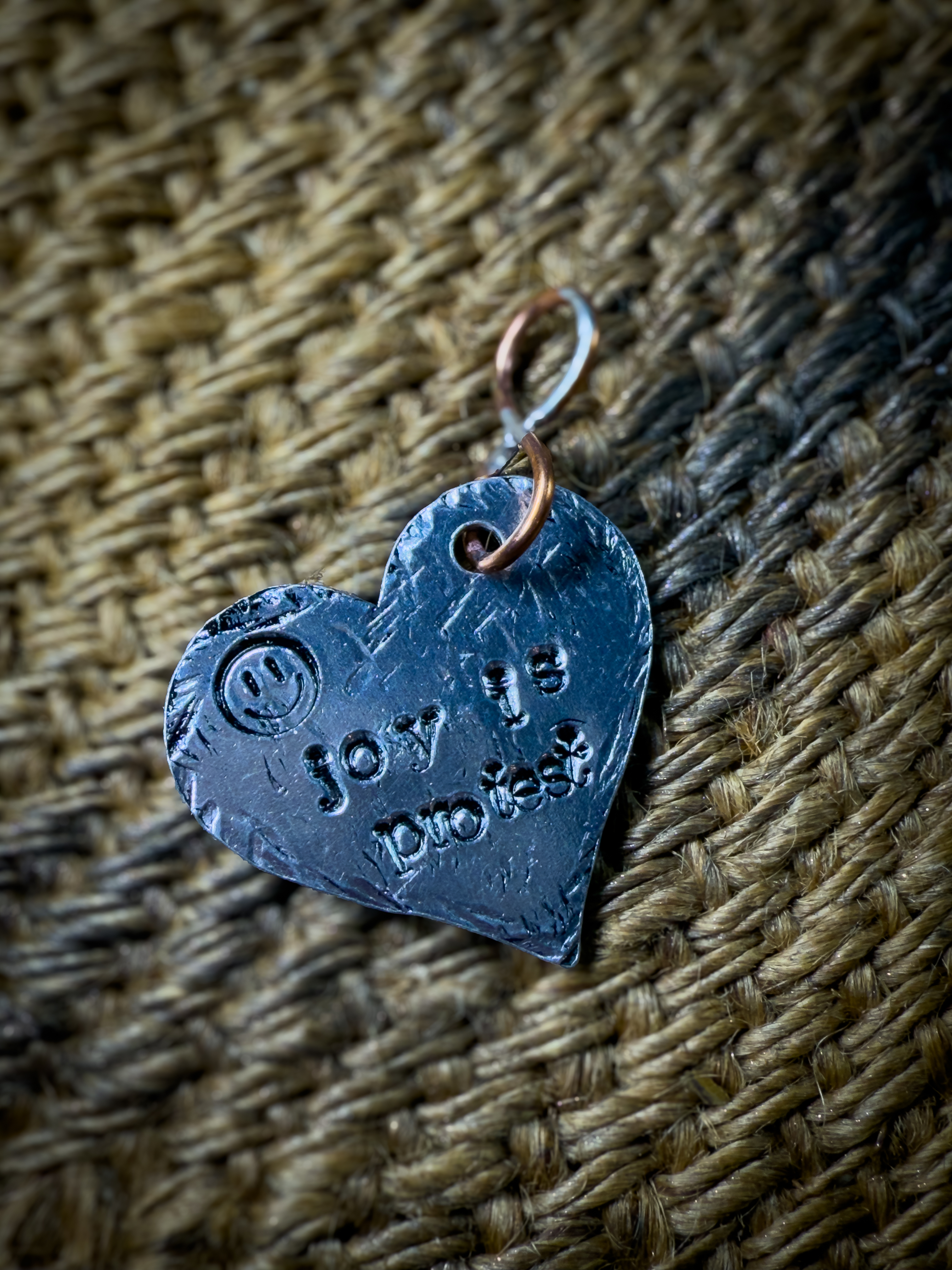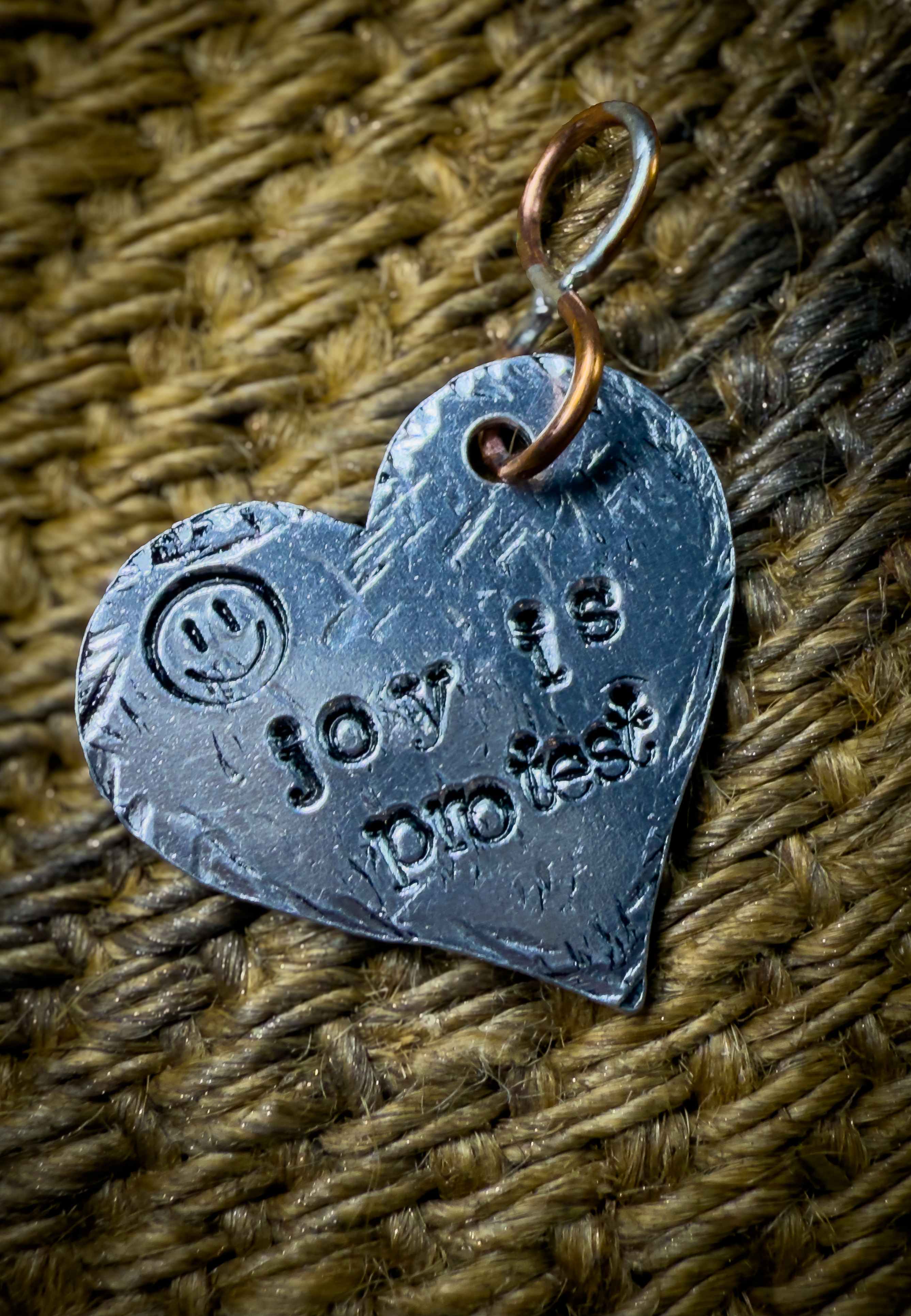 I create these medallions because art has always been a voice for the unheard, and right now, there is so much that needs to be said. Each piece is stamped with a conviction—RESIST, NO KINGS, JOY IS PROTEST, TRANS RIGHTS, DISABILITY RIGHTS, FIGHT OLIGARCHY—transforming rage and hope into something solid you can carry.
