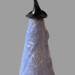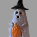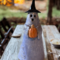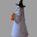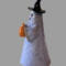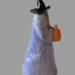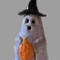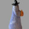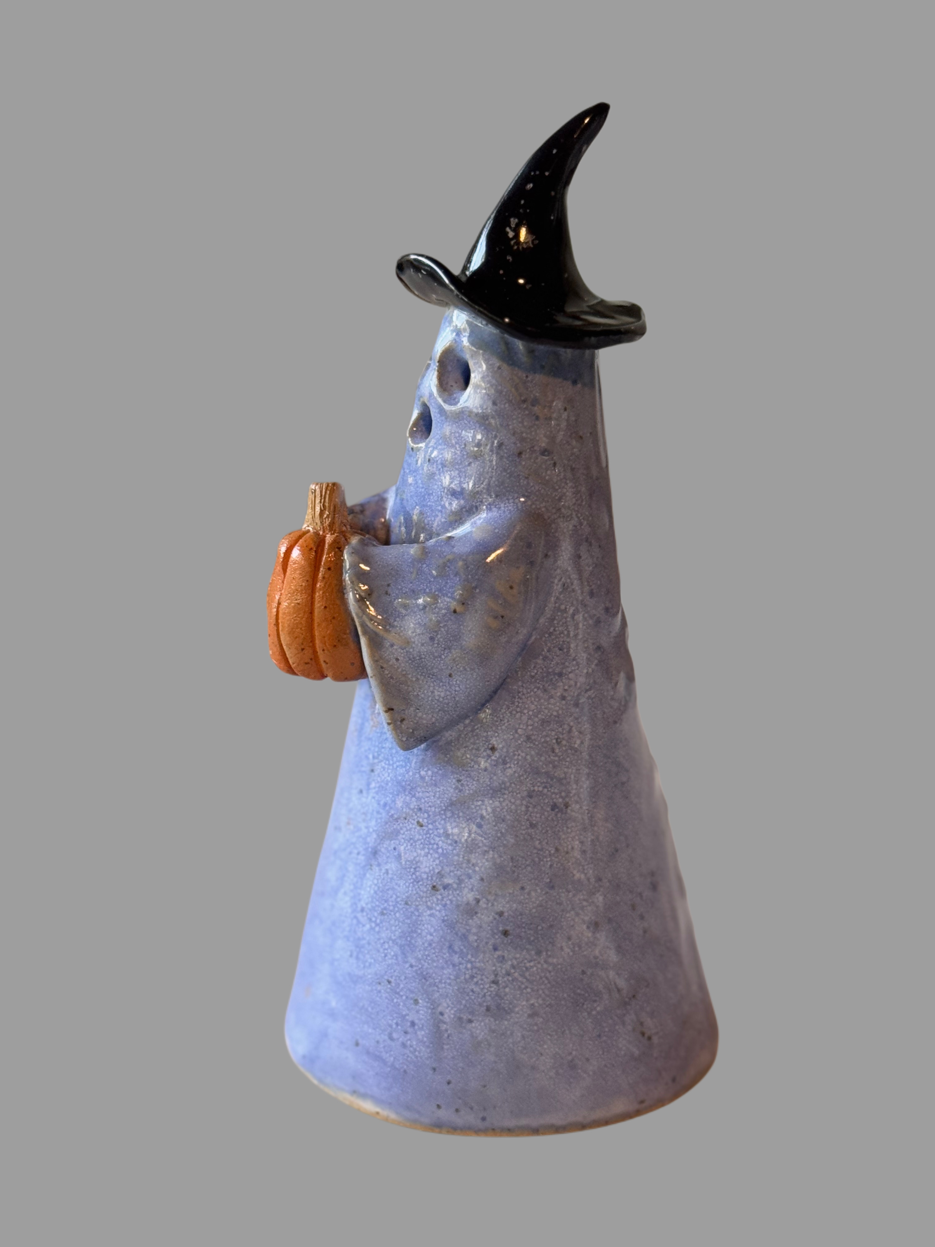A whimsical little ghost cloaked in lavender glaze, holding a bright orange pumpkin and topped with a shiny black witch hat. This handmade luminary brings a playful glow to your Halloween nights—just tuck a candle or tea light inside, and watch the soft light flicker through the cut-out eyes and mouth. Perfect for a porch, mantel, or table centerpiece, it’s equal parts spooky and sweet! Stands 10 inches tall.