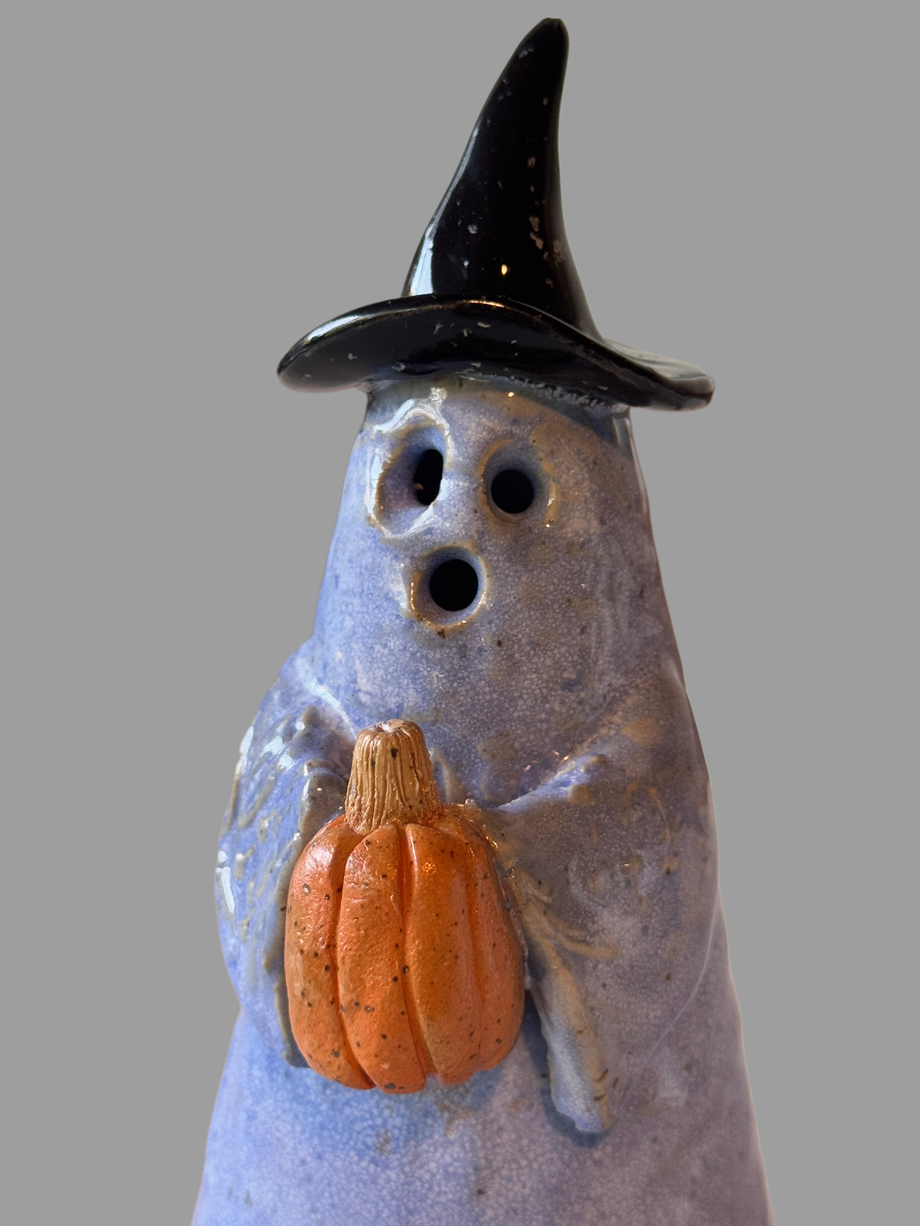 Each luminary is hand-built from clay slabs, shaped into a ghostly figure, and given its own personality. The little pumpkin is sculpted separately and attached before firing. After drying, the piece is bisque-fired, then coated in layered glazes: lavender for the body, a glossy black for the witch hat, and a pumpkin-orange with carved detail. It’s fired again at 2300°F, making it sturdy, functional, and ready to light up your home year after year.