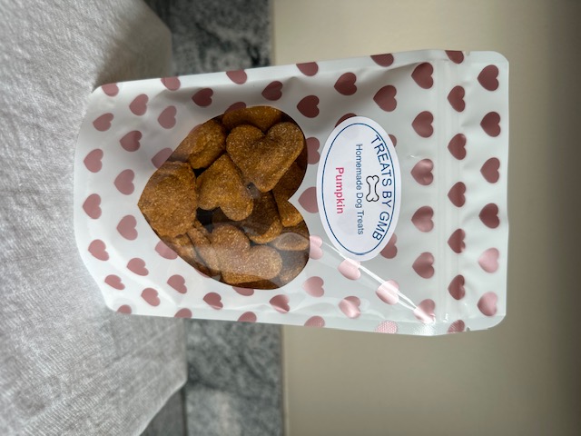 Our Pumpkin dog treats are crafted with high-quality, human grade ingredients that are easy to recognize and pronounce. Each treat is made with whole wheat flour, pumpkin, eggs, peanut butter and cinnamon. We use 100% pure pumpkin and only use the cinnamon identified by Consumer Reports as the safest grocery store cinnamon brand. The 20 heart-shaped pieces are approximately 1 - 1½ inches wide, perfect for rewarding your dog with a tasty snack. To maintain freshness, store the package in a cool, dry place. Our commitment to quality is underscored by our licensure with the Department of Agriculture. We list all the ingredients and the guaranteed analysis on each label. As each beloved dog is unique and may have specific dietary needs, please review the ingredient list carefully and consult with your veterinarian if you have concerns about any sensitivities. Each treat has 9 calories.
