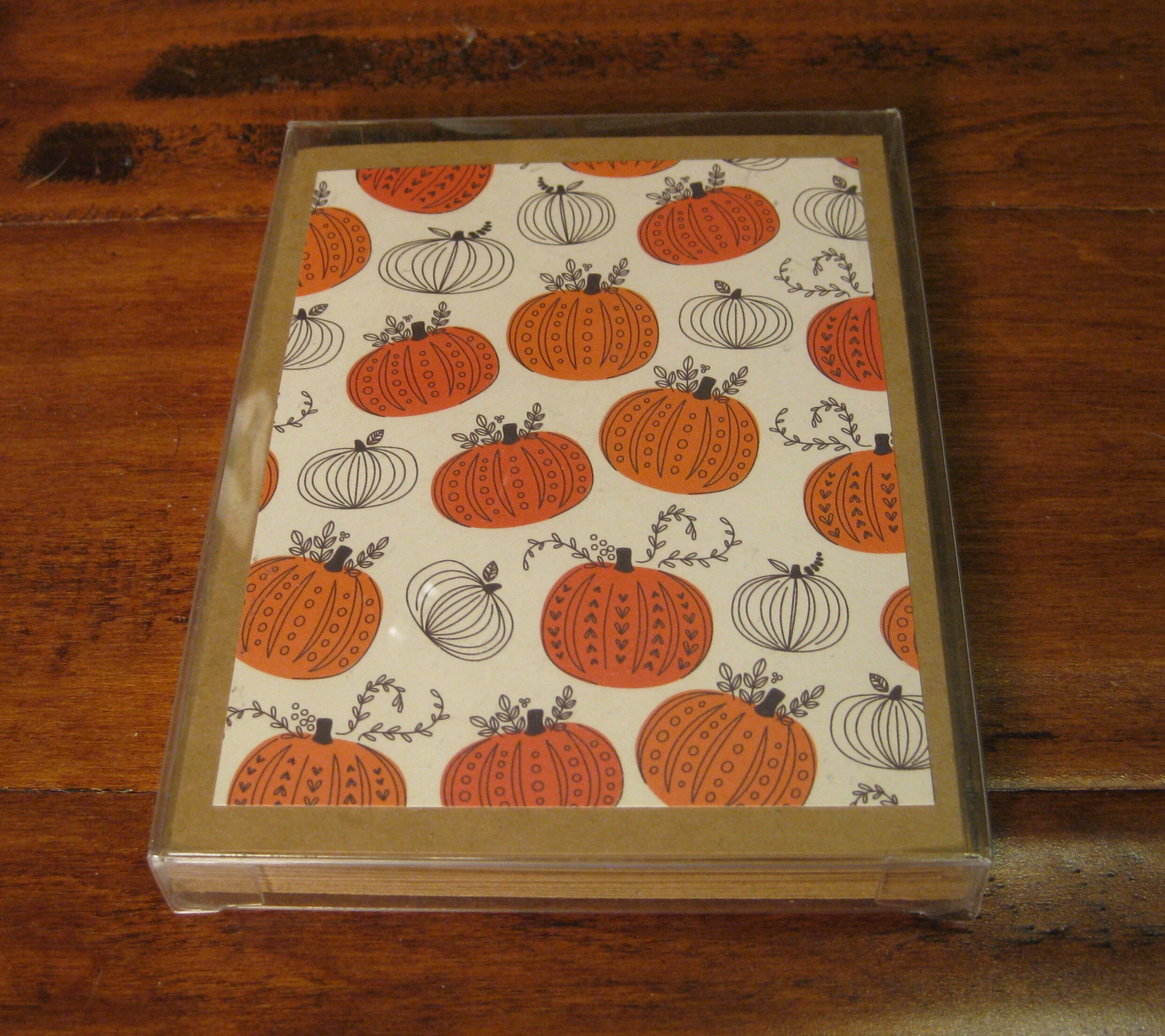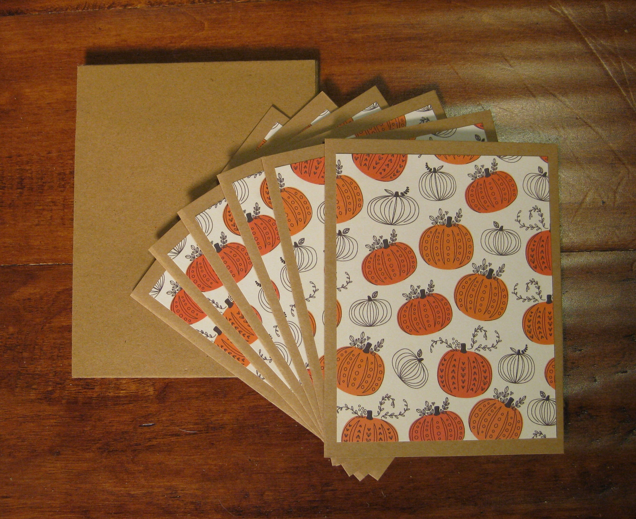 6 Pumpkin cards and 6 ivory envelopes. Ivory background filled with orange and cream pumpkins.
