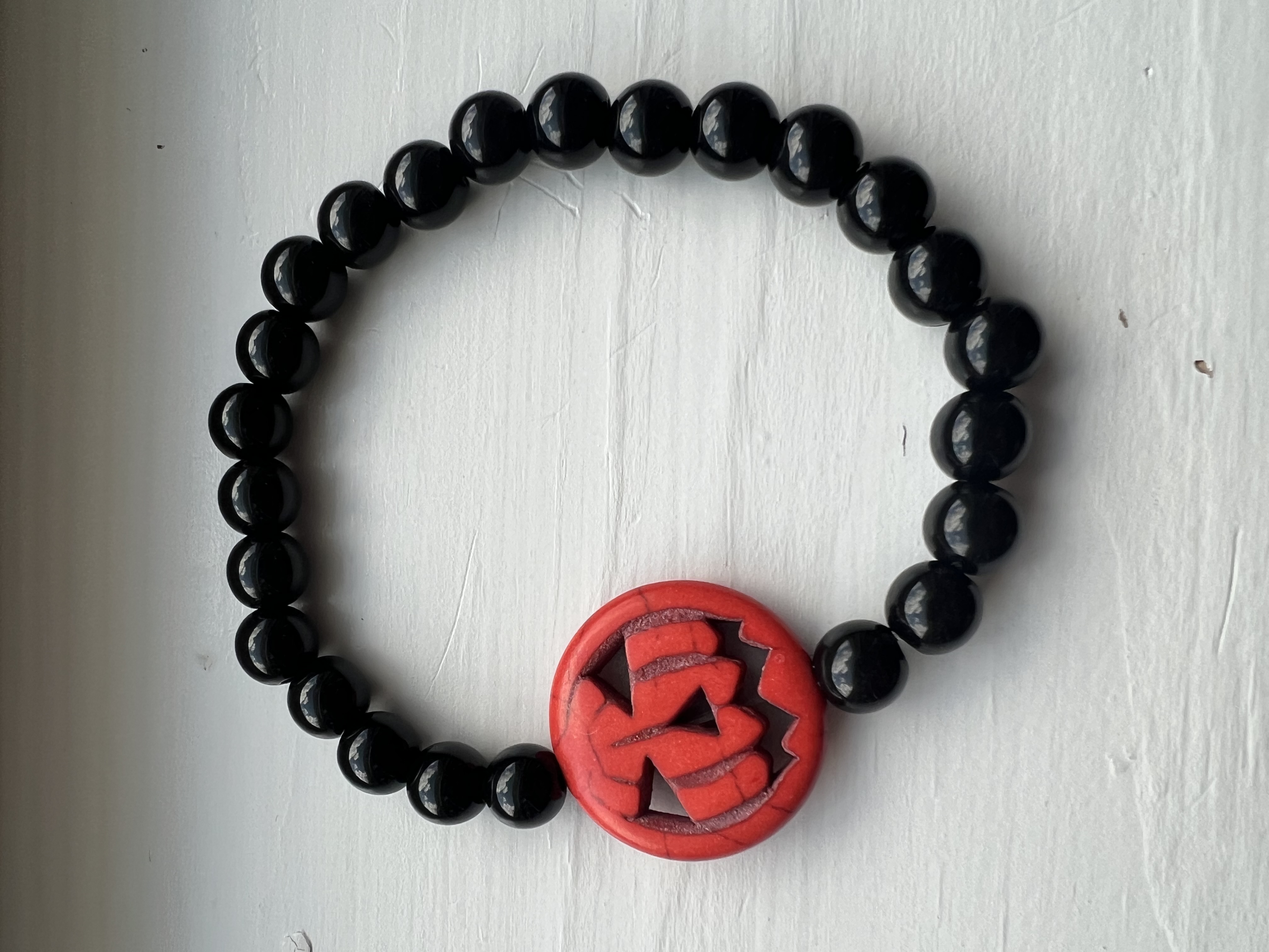 Each Pumpkin Shadows Bracelet is handmade with glossy black acrylic beads and a bold orange jack-o’-lantern centerpiece. The beads are strung on durable elastic cord, knotted securely, and trimmed for a smooth finish.