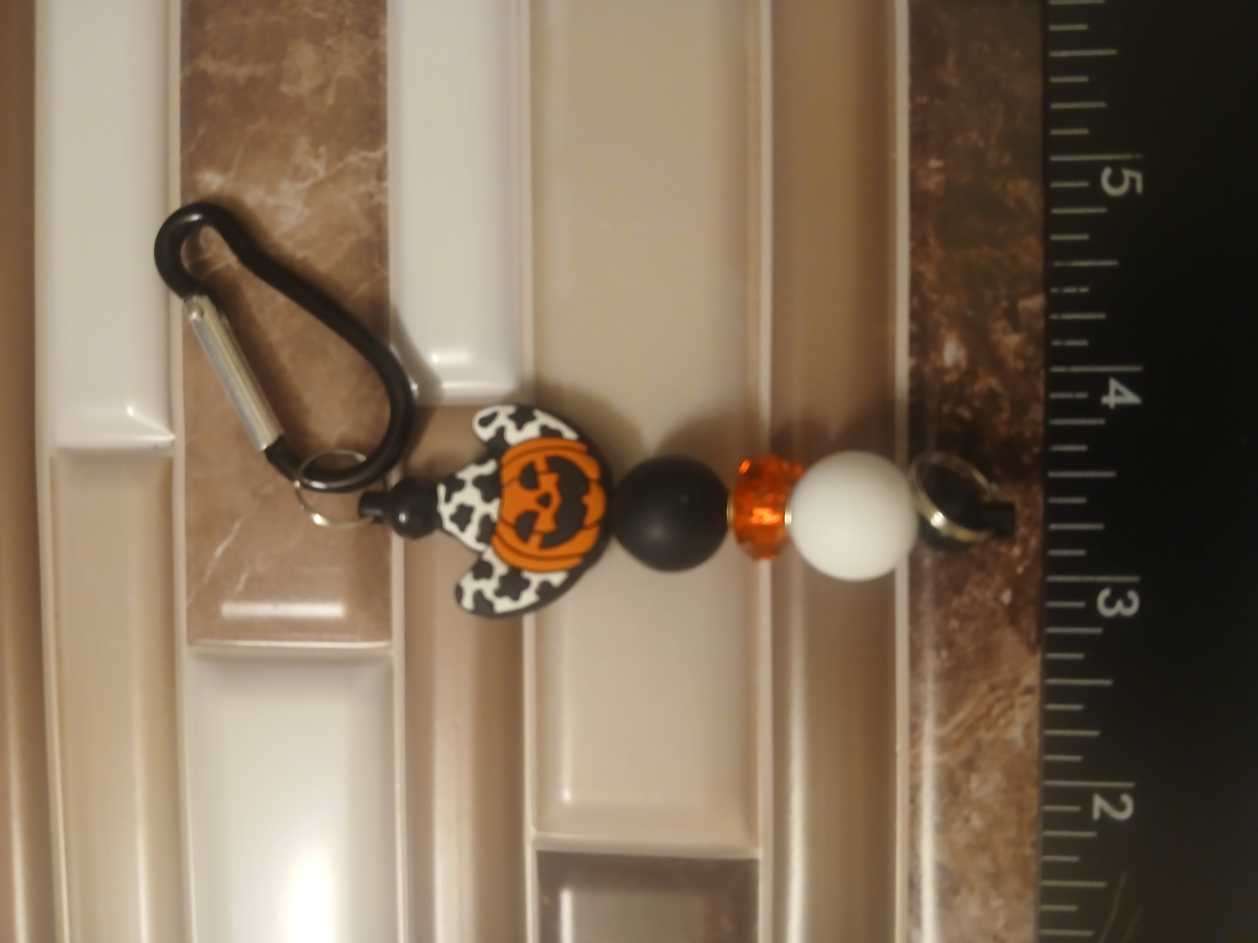 Howdy partner this pumpkin wants to line dance under the moonlight he's wearing a black and white cowboy hat and is also a beaded key chain or bag decoration