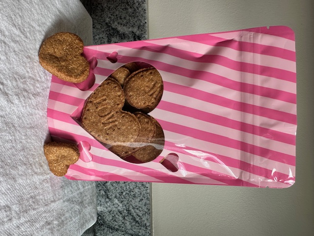 Our Puppy Love Peanut Butter dog treats are crafted with high-quality, human grade ingredients that are easy to recognize and pronounce. Each treat is made with whole wheat flour, peanut butter, eggs and honey. The pink and white package includes 18 heart shaped pieces. The pieces are approximately 1 - 2 1/2 inches wide, perfect for rewarding your dog with a tasty snack. To maintain freshness, store the package in a cool, dry place. Our commitment to quality is underscored by our licensure with the Tennessee Department of Agriculture. We list all the ingredients and the guaranteed analysis on each label. As each beloved dog is unique and may have specific dietary needs, please review the ingredient list carefully and consult with your veterinarian if you have concerns about any sensitivities.