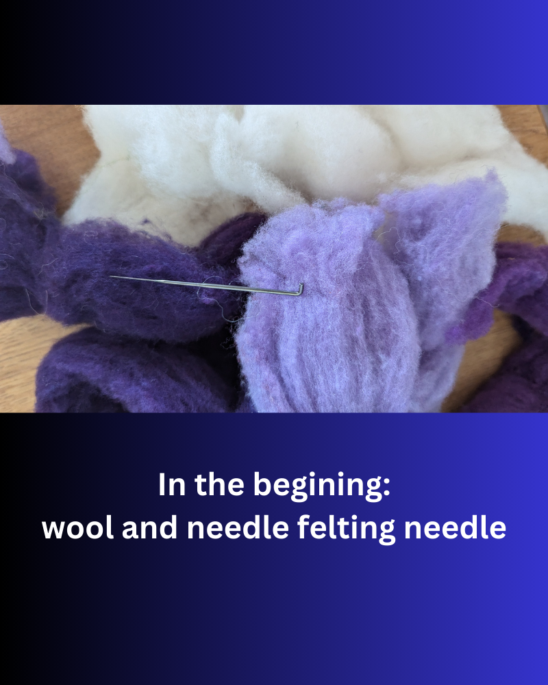 I take raw wool, clean and card the wool, then dye the wool, I then create a ball for the body with natural colored wool and also create a ball for the head and then the shapes for the legs and arms. All parts are then covered in the colored wool. All the felting was done by hand with the little felting needle that is shown in the one photo. This little guy took approximately 6 hours of felting. Needle felting is a fun and relaxing craft!