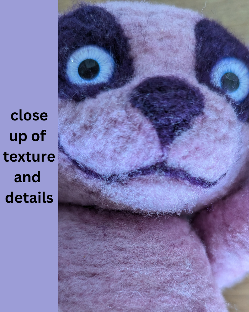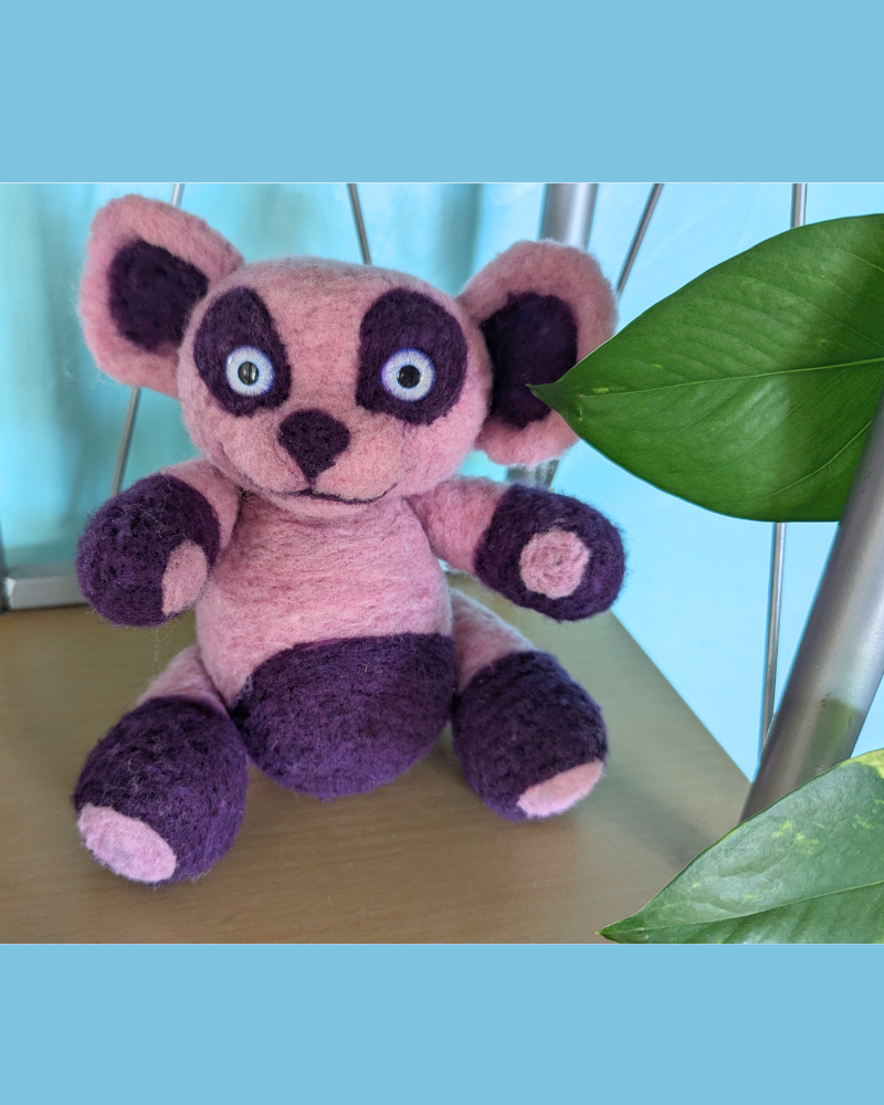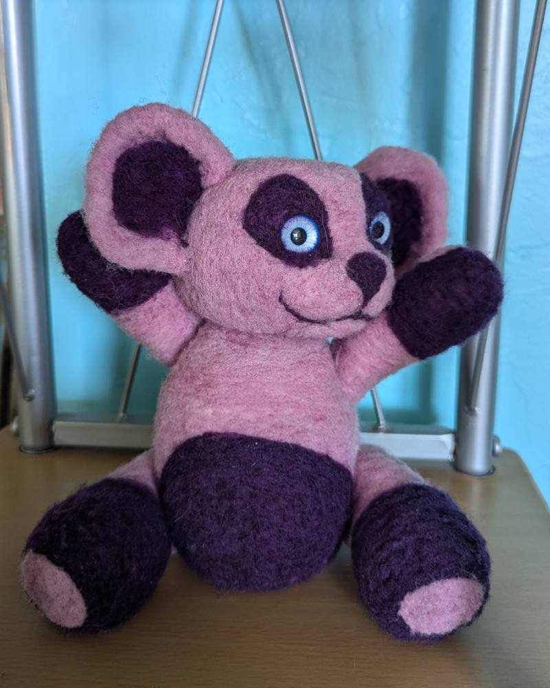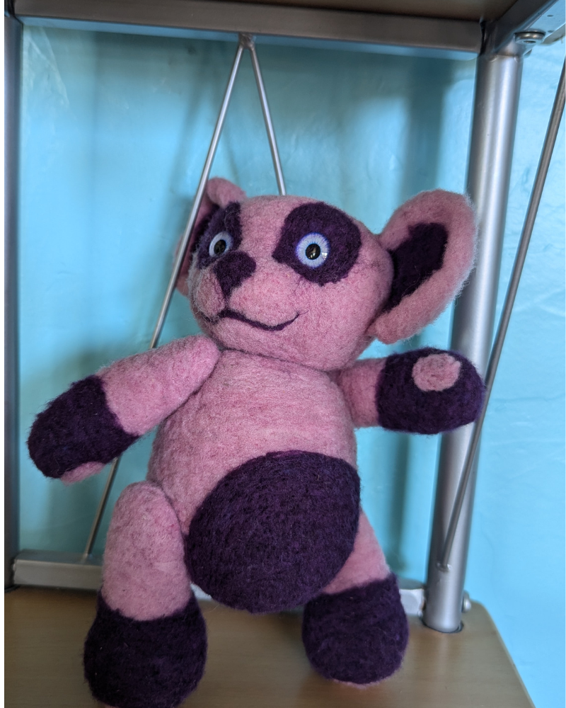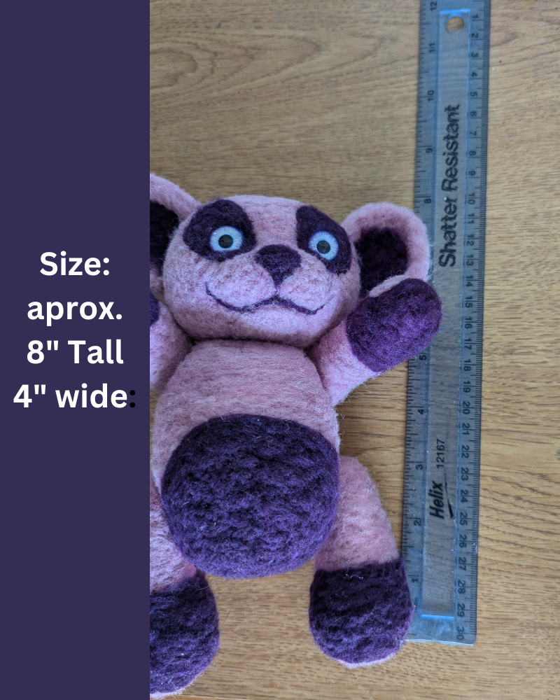 Lavender and purple needle felted jointed bear. This little guys was fun to make, there is alway many hours that go into making needle felted items. The eyes are glass cabasohons and are glued on the bear then fleted to add durablity. Not recomended for small childern due to the glass eyes.