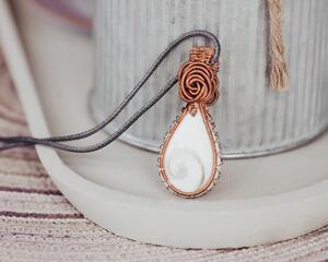 It is caged in copper and hangs asymmetrically from a copper chain.